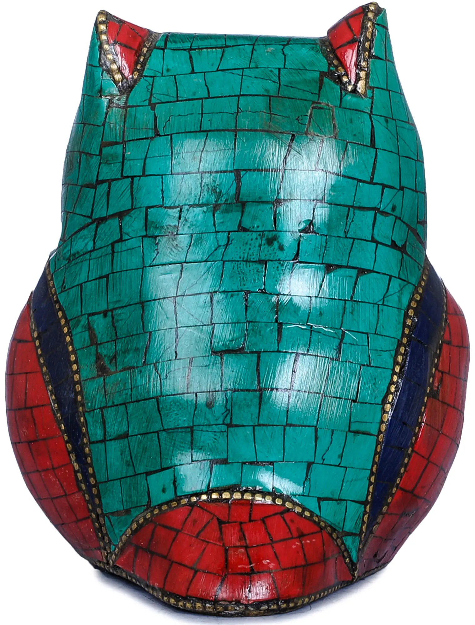 Crafted from durable brass, this statue is a testament to meticulous artistry and traditional craftsmanship. The surface is adorned with intricate inlay work, featuring vibrant green and red mosaic-like patterns that evoke the appearance of precious stones. These colorful segments are meticulously placed and separated by delicate golden lines, creating a striking visual appeal. The eyes of the owl are particularly captivating, rendered in deep blues and reds, suggesting a watchful and all-seeing gaze. The use of contrasting colors and textures not only enhances the aesthetic beauty of the piece but also imbues it with a sense of opulence and sacredness. The small, yet significant, decorative elements, such as the cluster of colorful gems adorning its chest, further elevate its charm and lend it an aura of divine grace.