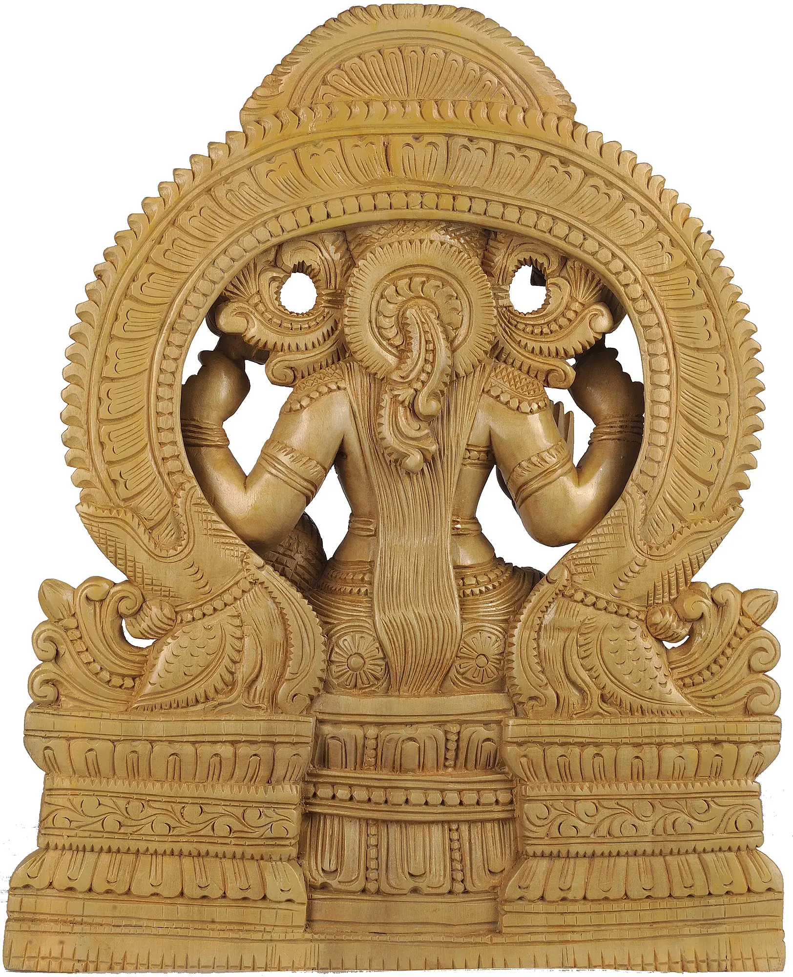 This meticulously carved sculpture brings to life the Hindu Goddess, the very embodiment of prosperity, fortune, love, and beauty. She is the divine consort of Vishnu and holds a position of paramount importance in the Hindu pantheon. The intricate details, painstakingly etched into the white cedar wood, speak volumes about the devotion and skill of the artisans who created this sacred piece. Considered to be a giver of boons to her devotees, she is often sought by worshippers wishing to remove obstacles and improve fortune, wealth and spiritual growth. She represents not only material abundance but also the spiritual prosperity that is so important in Hinduism.