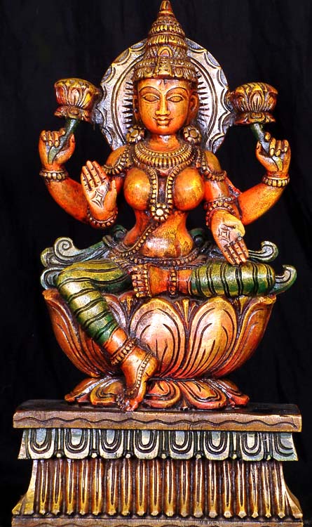 Invite prosperity and abundance into your life with this intricately carved wooden sculpture. Depicting the revered deity, this piece embodies the essence of wealth, fortune, love, beauty, joy and prosperity. This handcrafted piece provides an elegant focal point for any space and serves as a reminder of the blessings that surround us. The artisan's attention to detail is evident in every curve and contour of this beautiful carving. From her serene expression to the meticulously detailed lotus base, the sculpture is a testament to skilled craftsmanship.