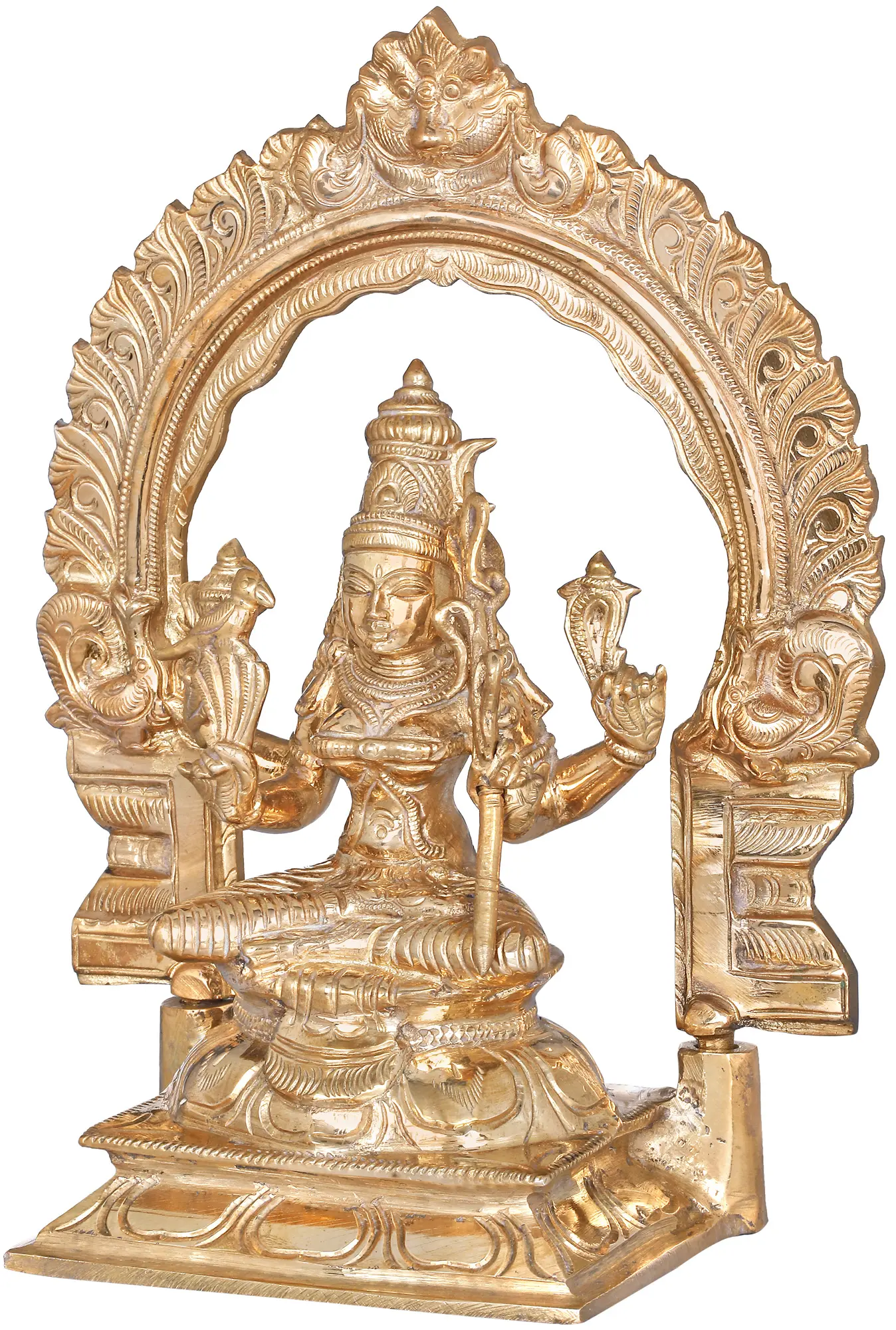 The statue is presented within a magnificent arched prabhamandal, or aura, a decorative frame that amplifies the divine presence. This architectural element is richly ornamented with motifs that showcase the skill of the artisan. The intricate carvings on the prabhamandal, with its flowing lines and detailed patterns, create a sense of grandeur and sacredness. The posture of the goddess, seated regally on a lotus base, further enhances her divine aura. Each fold of her garment, every curve of her form, and the subtle nuances of her facial features are rendered with a sensitivity that brings the deity to life. The Swamimalai bronze casting technique ensures a level of precision and artistic finesse that is rarely found.