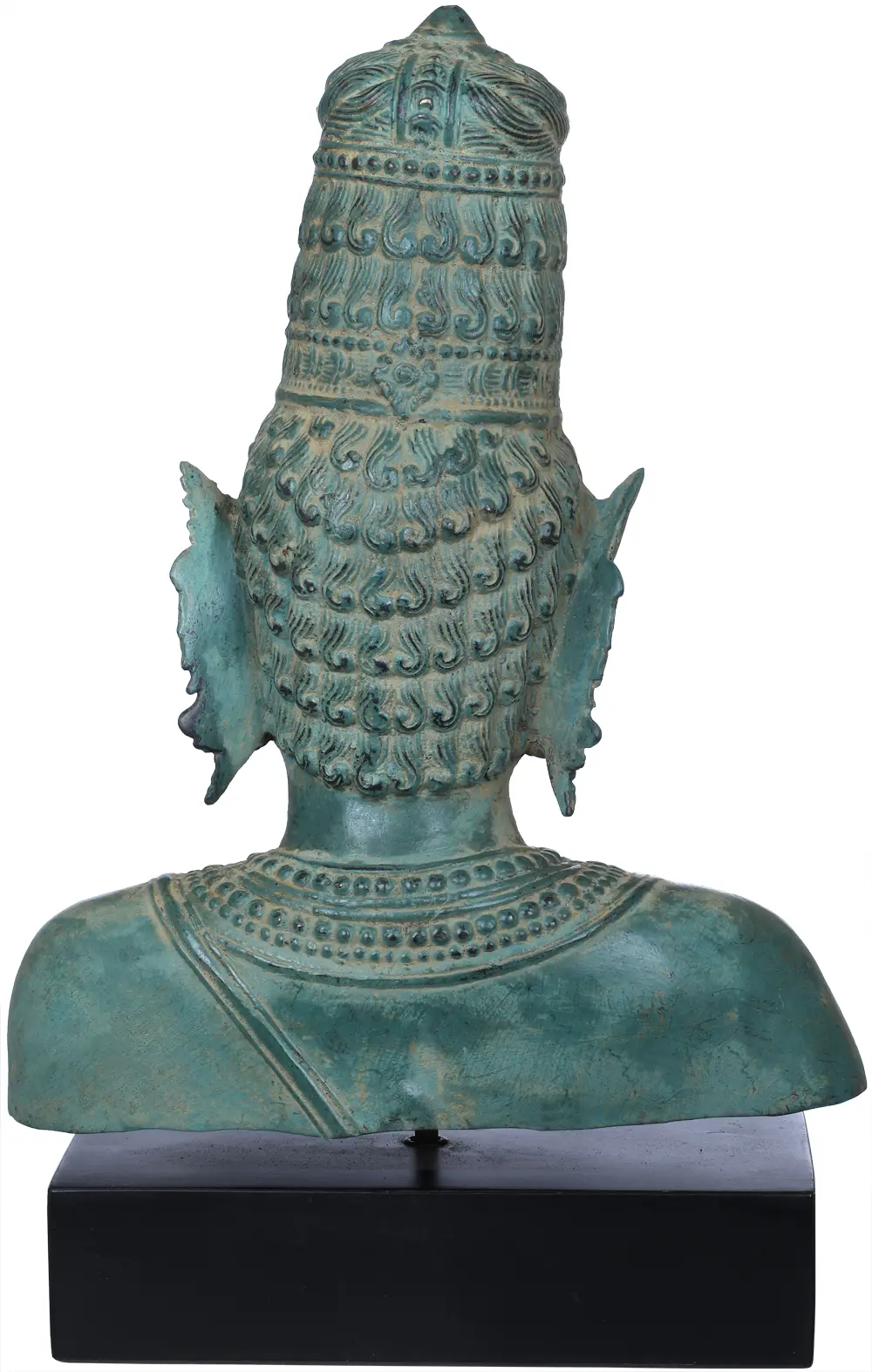 This exquisite brass bust captures the serene and powerful essence of Goddess Parvati, the divine consort of Lord Shiva and mother to Ganesha and Kartikeya. Crafted with meticulous detail, the piece is presented on a sturdy wooden stand, making it a striking addition to any home or sacred space. The verdigris patina adds an aura of ancient wisdom and timeless grace, evoking a sense of history and spiritual depth. The Goddess Parvati is a central figure in Hinduism, representing divine power, feminine energy, and the nurturing aspect of the divine. Her stories are woven into the fabric of Indian mythology, from her unwavering devotion to Shiva, her fierce transformation into Durga to vanquish demons, and her compassionate embodiment as the mother of the universe. She is the ultimate Shakti, the primal cosmic energy that animates all creation. In this portrayal, her serene expression and majestic headdress suggest her regal nature, a queen who rules with both might and benevolence. ––––––––––––––––––