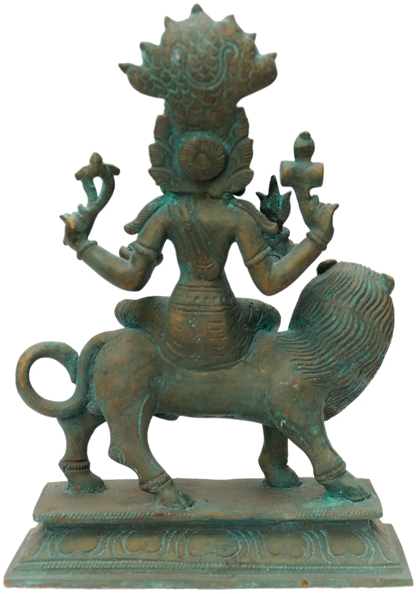 The statue portrays an incarnation of the Divine Feminine known for her fierce protection of devotees and dharma. The intricate details within the statue reflect the stories and attributes associated with her. According to legend, during a cosmic battle between good and evil, the universe was threatened by the immense power unleashed by the malevolent forces. To counteract this destructive energy, a divine being emerged, possessing the combined power of several other deities. Her form is a unique synthesis of animal and human, embodying both primal power and divine intelligence. Often depicted with a lion's face and a human body, symbolizing courage and wisdom, this formidable deity embodies both destruction and protection. Her role is to uphold cosmic order, vanquish enemies, and safeguard those who seek refuge in her divine grace. She is invoked to dispel negative energies, remove obstacles, and grant victory in the face of adversity. The presence of serpents often adorns her, further indicating her dominion over powerful forces. This image resonates as a symbol of the power to overcome adversity, to protect the innocent, and to uphold the balance of the universe. It's a reminder that even in the darkest of times, there is always a force ready to defend what is right.