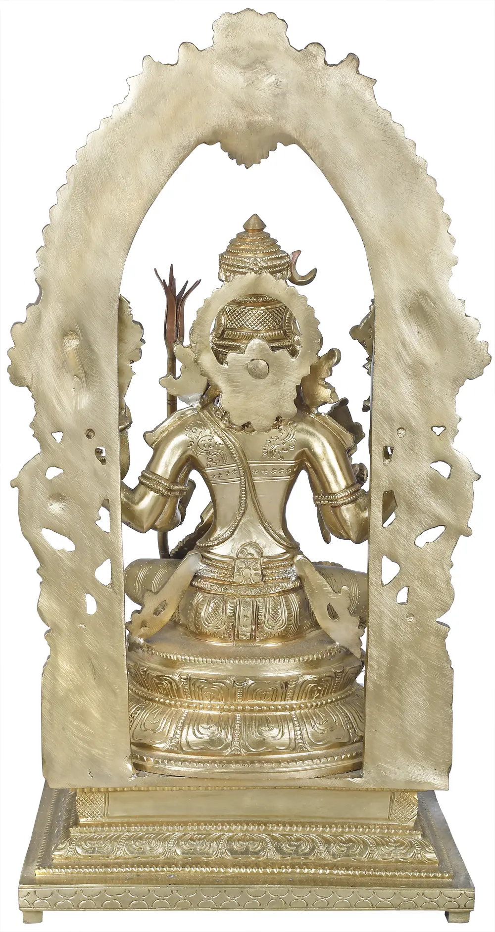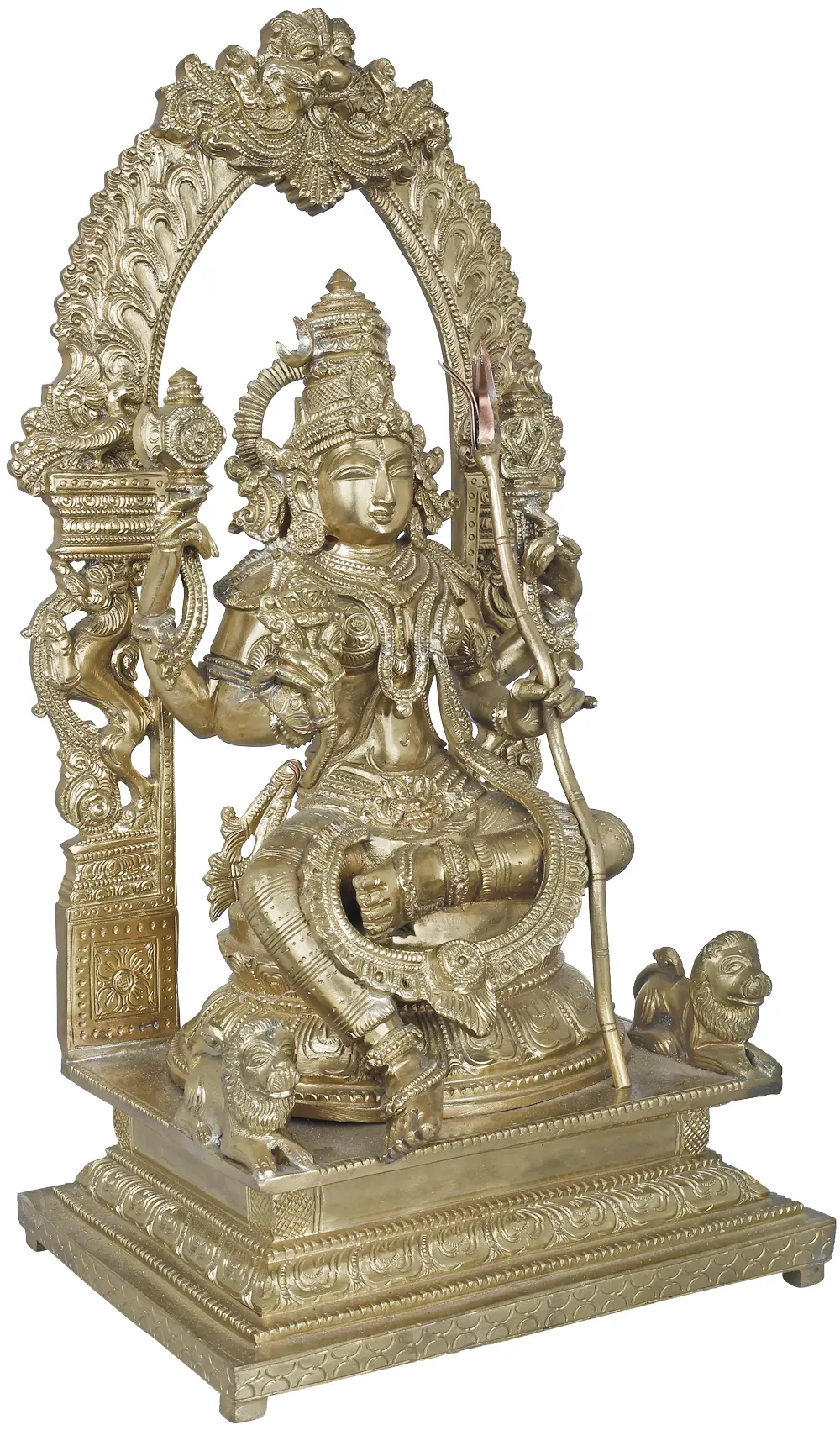Tripura Sundari is the Hindu goddess glorified as one of the ten Mahavidyas and Shakti (consort) of Sadasiva; she is the supreme consciousness who rules over the Trinity (Shiva, Vishnu and Brahma) and is associated with Shakta tantric tradition. She is also known by the name Rajarajeshwari (‘Raja’ means the eight lords governing directions of the universe and ‘Rajeshwar’ is the Trimurti), depicted here in a splendid form of Cosmic Mother, as is also mentioned in Sri Lalita Sahasranama. The goddess is sculpted here in a refined bronze by expert artisans of Bangalore from where bronze art had set a new benchmark in the history of art and metallurgy.