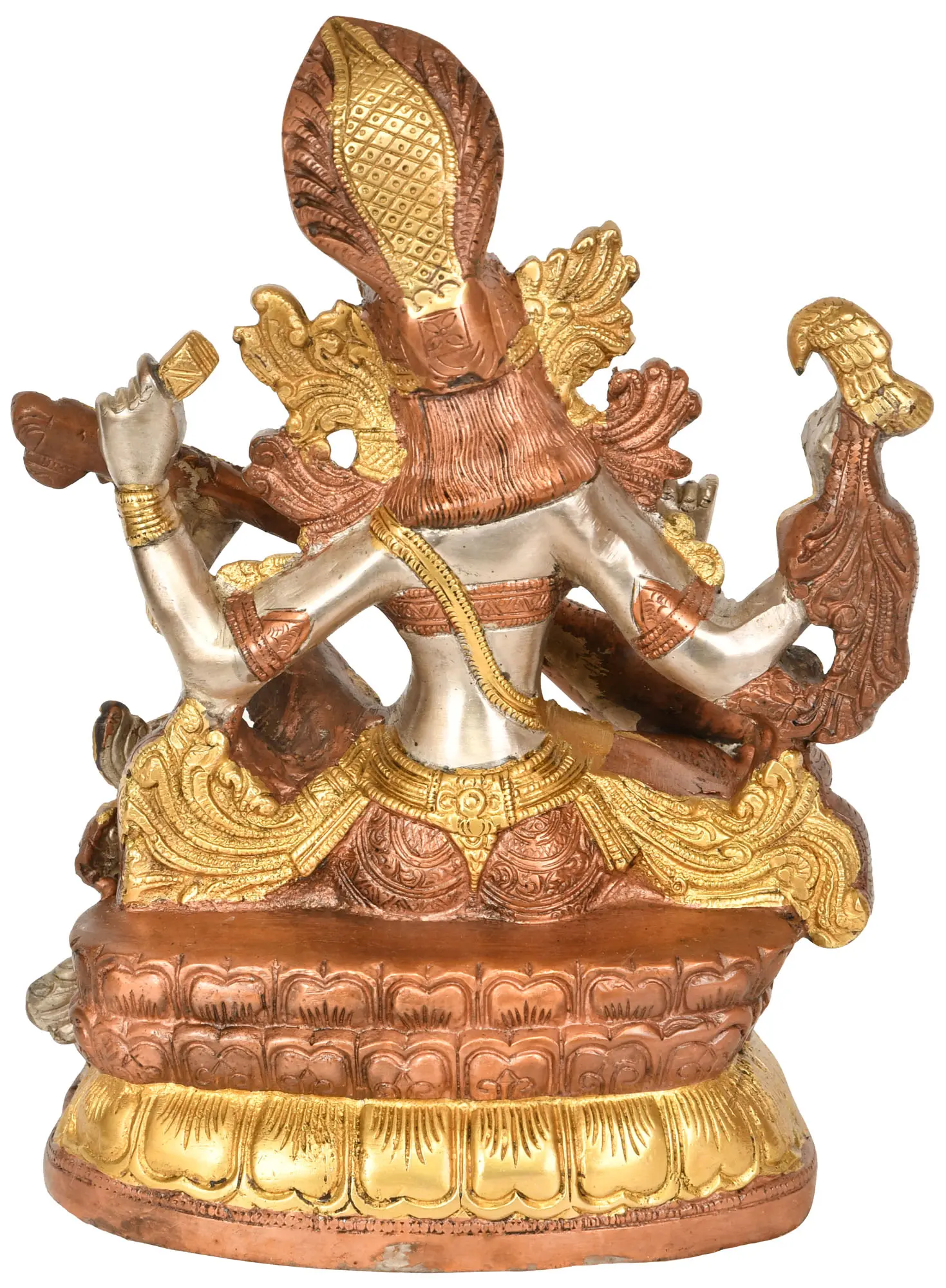 Invite the divine blessings of Goddess Saraswati, the patron of knowledge and wisdom, into your home with this handcrafted brass sculpture. Saraswati is depicted here as Sharada, radiating a serene aura that inspires learning and creativity. This art piece, crafted with precision by Indian artisans, symbolises the importance of education and the pursuit of knowledge. Place it in your study or learning space to invoke Saraswati's guidance, fostering a harmonious environment for learning and intellectual growth.