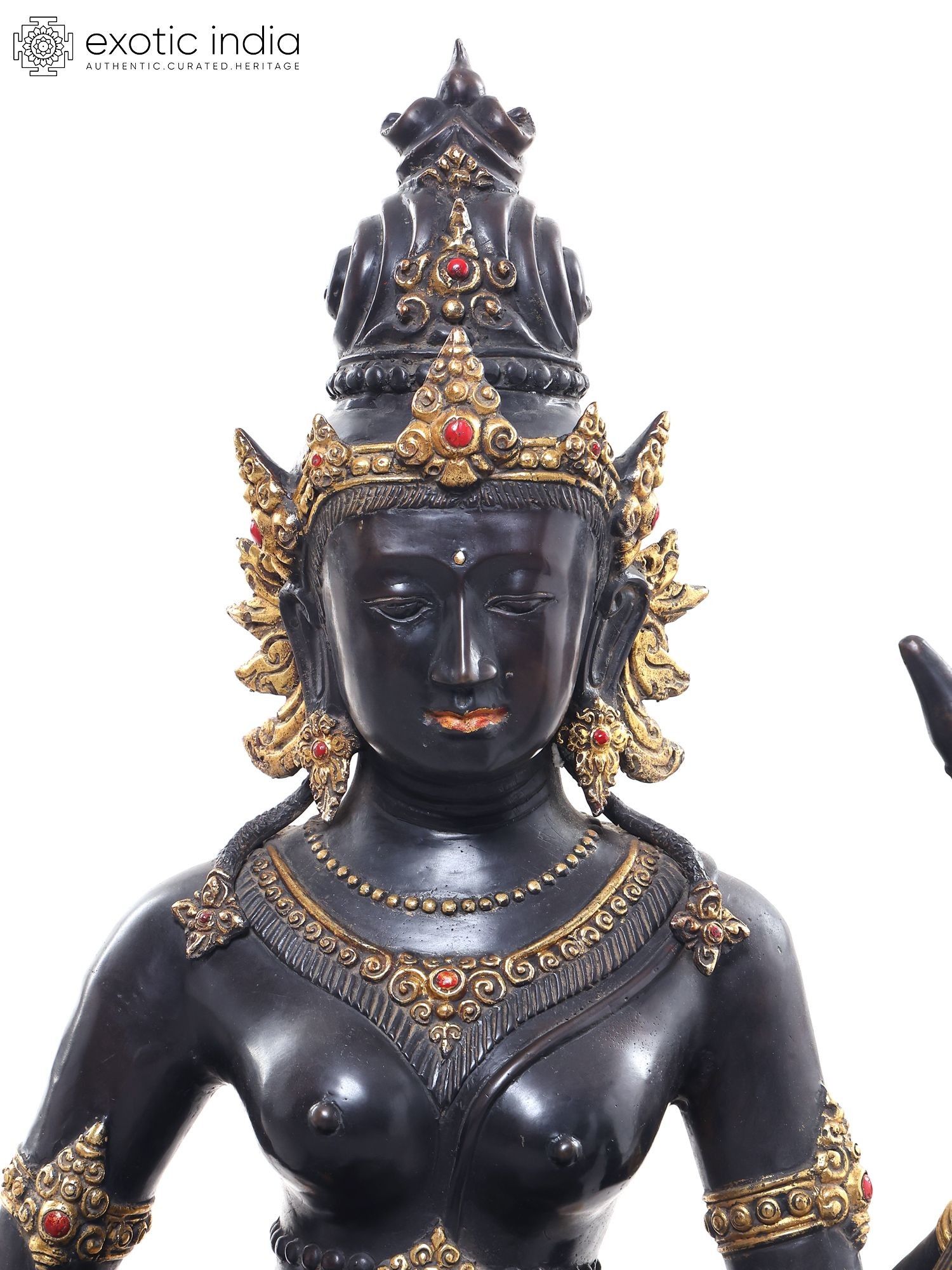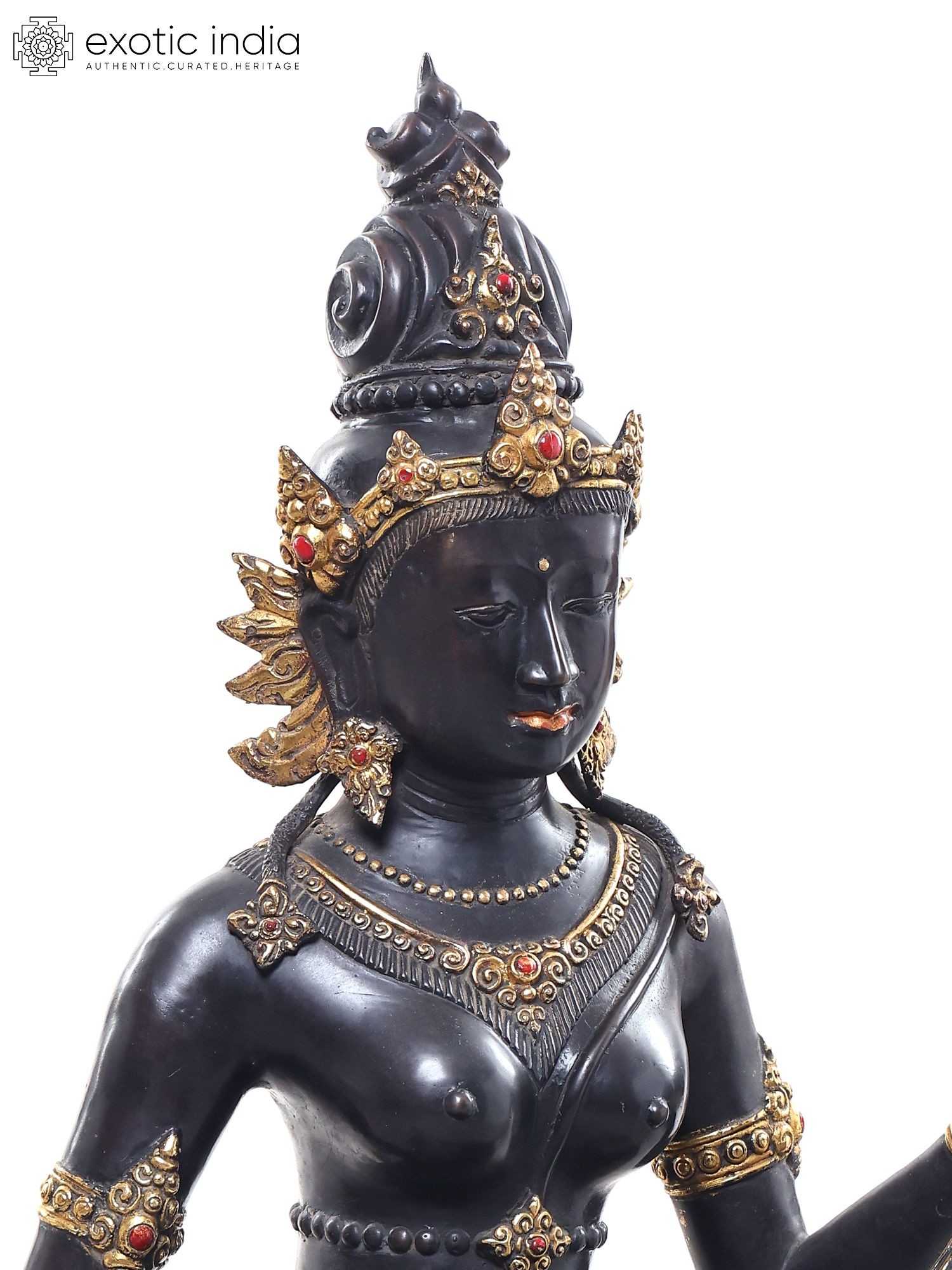 • The statue features ornate jewelry and a detailed crown, highlighting divine attributes.