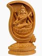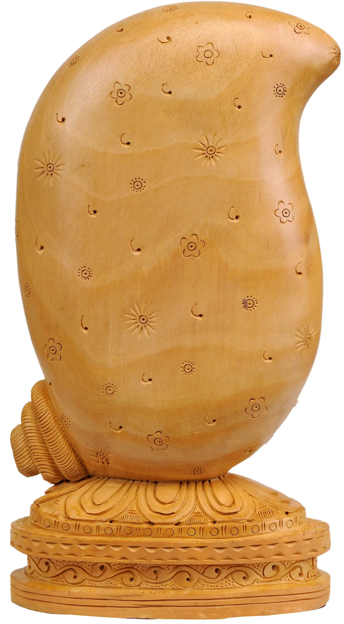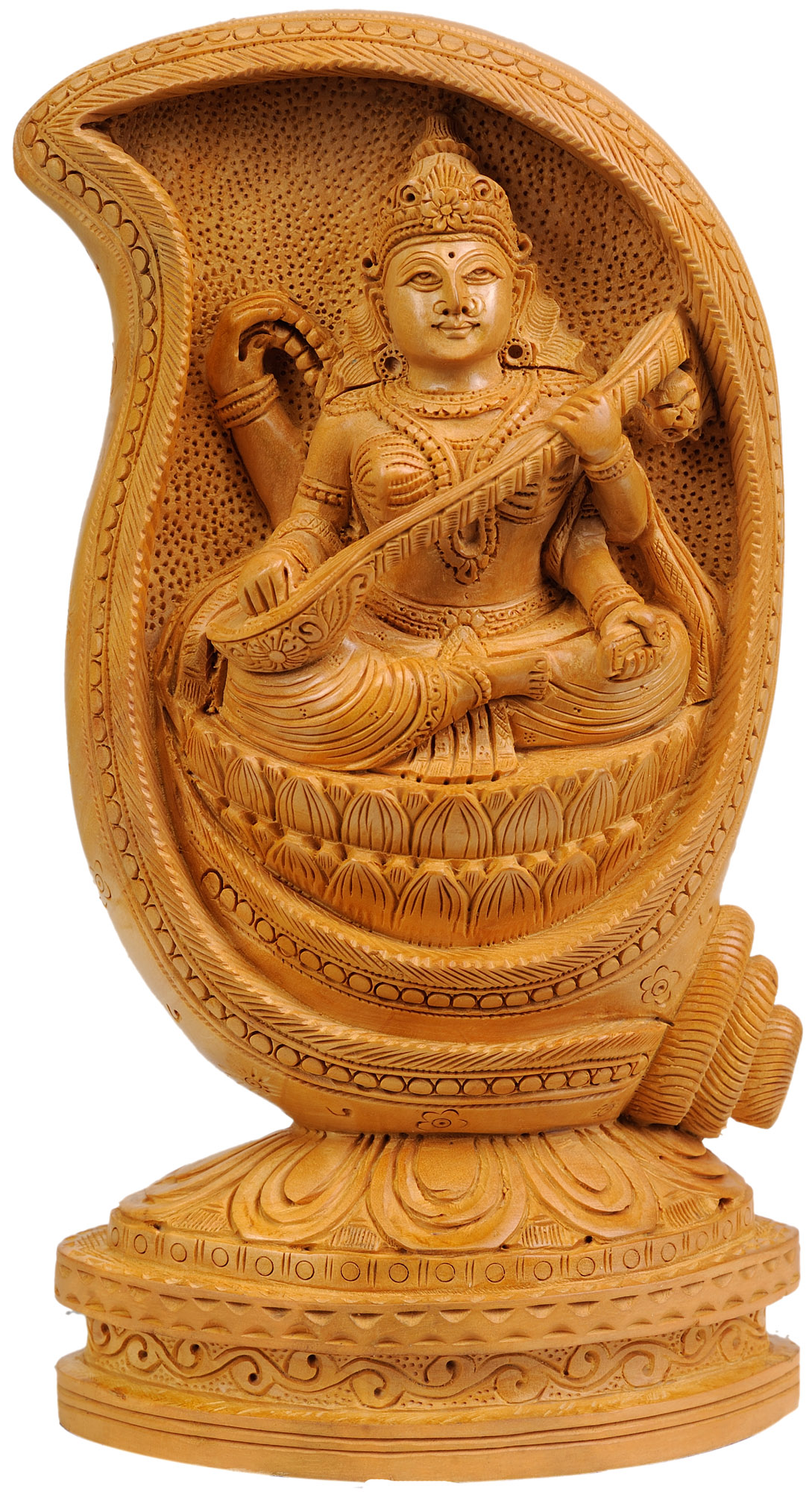 Behold a manifestation of divine artistry, meticulously carved from the rich, pale tones of Kadamba wood. This sculpture presents the revered Hindu Goddess Saraswati, the embodiment of knowledge, music, arts, wisdom, and learning. She sits gracefully within the embrace of a conch shell, a potent symbol in Hinduism, often associated with beginnings, purity, and the primordial sound of creation, Om. This carefully crafted representation brings together elements that are both visually stunning and deeply meaningful. Every curve and detail serves as a testament to the skill of the artisans who bring this revered deity to life.