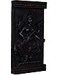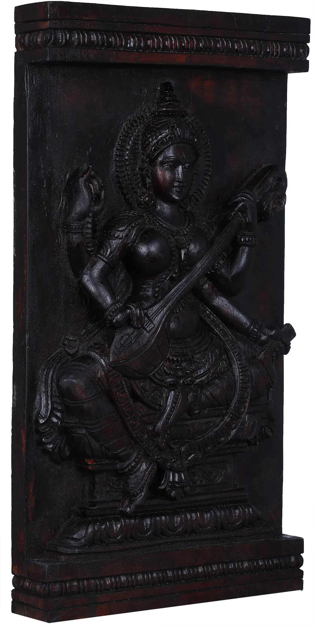 This exquisite wooden carving brings to life the divine presence of Goddess Saraswati, the Hindu deity revered as the embodiment of knowledge, music, arts, speech, wisdom, and learning. Crafted with meticulous detail by skilled artisans from South India, this wall hanging is more than just a decorative piece; it is a testament to centuries of artistic tradition and spiritual devotion. The deep, rich tone of the wood enhances the intricate carvings, creating a sense of timeless elegance and profound sacredness.