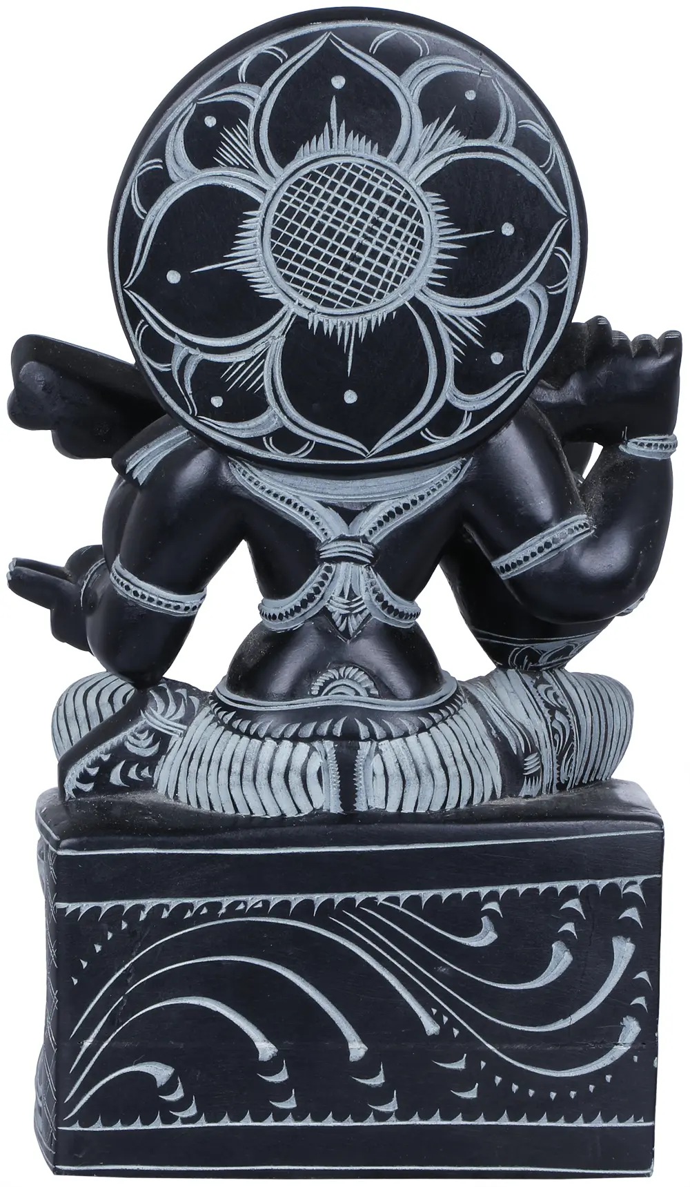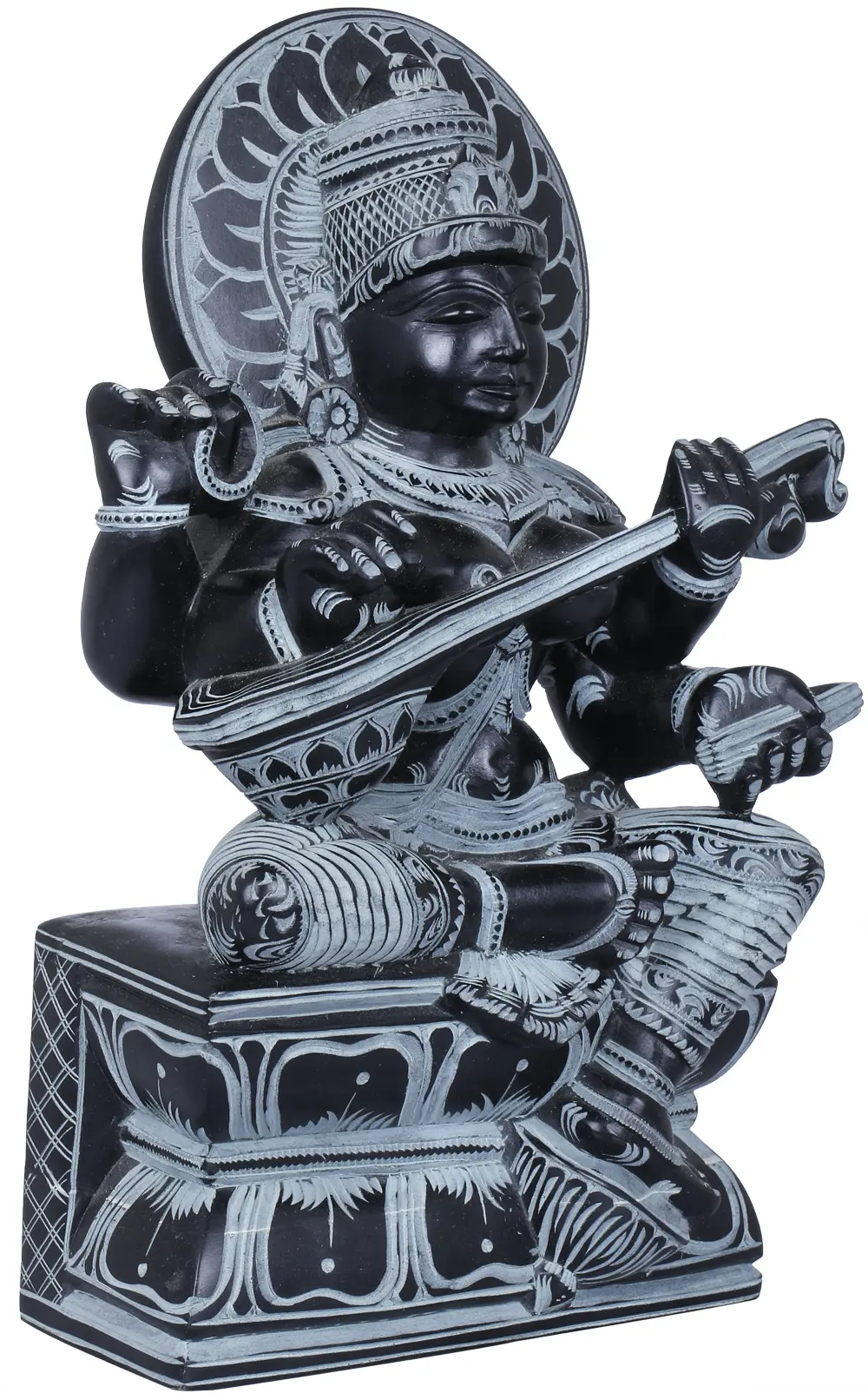 Goddess Saraswati is sculpted out of a special kind of black marble from Mahabalipuram having a smooth texture along with the unique quality of being scribbled out in patterns with a little sharp object to form beautiful white designs that adorn herself. She is the most beautiful goddess in the entire Hindu pantheon and revered for her deep inclination towards arts, science, wisdom and knowledge.