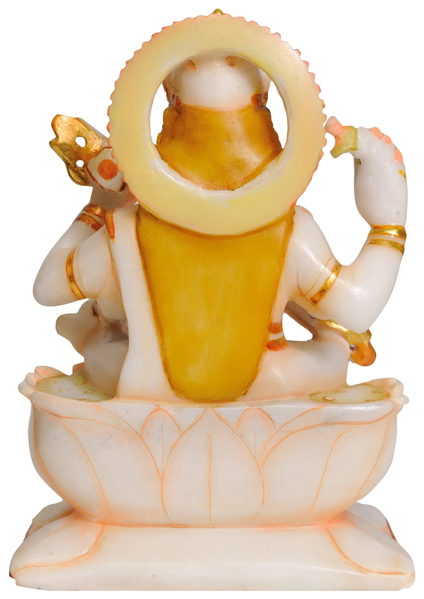 This sculpture is expertly carved from high-quality marble, a material renowned for its purity, durability, and ability to capture fine nuances. The natural beauty of the marble provides a luminous base for the delicate hand-painting and gold accents that adorn the statue. The rich golden highlights, particularly on her ornaments, crown, and the details of her musical instrument, add a touch of opulence and further enhance the divine radiance of the goddess. The delicate pink hues on her lips and fingertips add a touch of lifelike warmth. The presence of small, glittering embellishments further elevates the statue's aesthetic appeal, making it a captivating centerpiece.
