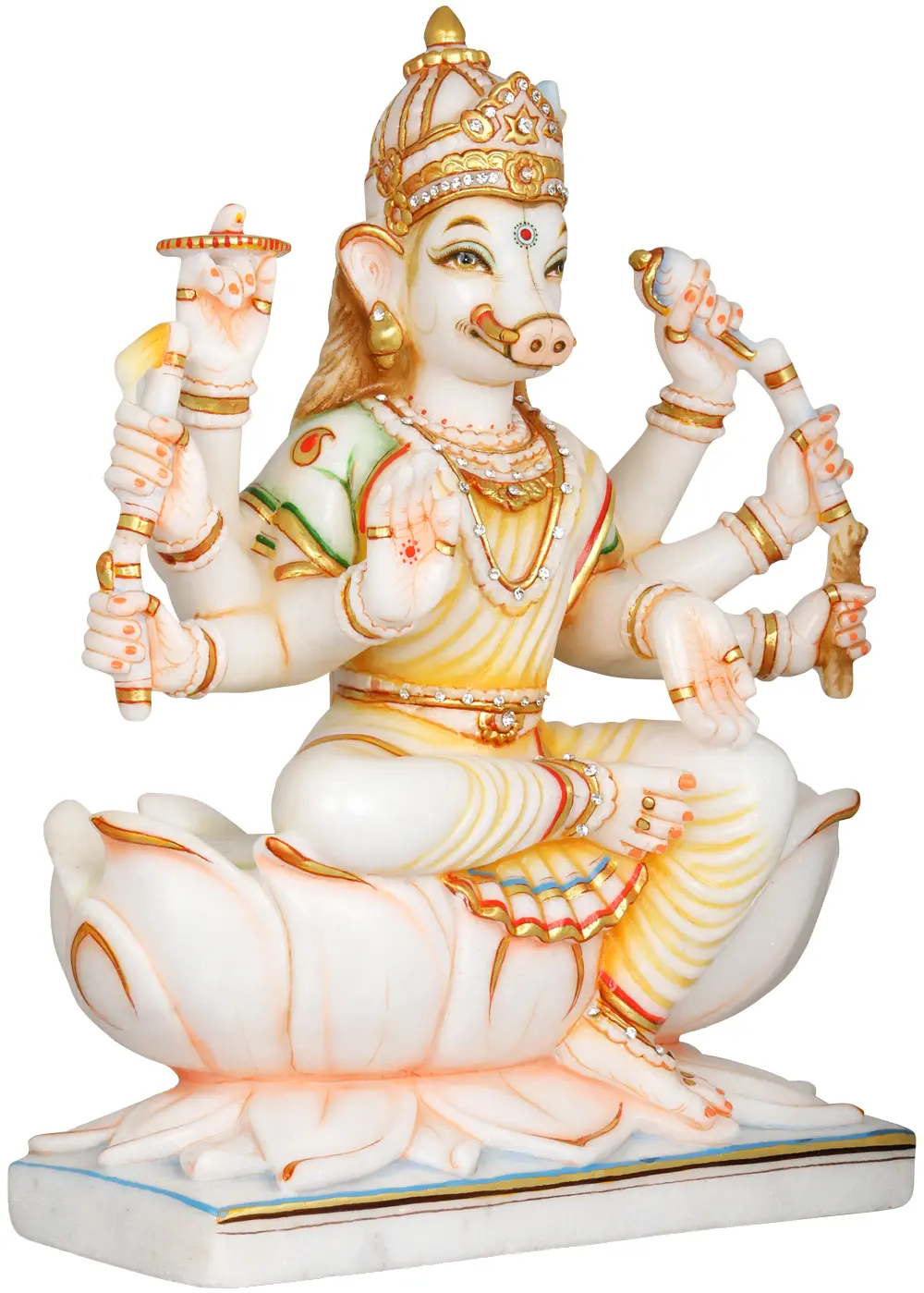 This statue meticulously portrays the multifaceted nature of Goddess Varahi. Seated gracefully on a blooming lotus, a symbol of spiritual awakening and purity, she emanates an aura of serene power. Her multiple arms, each holding symbolic implements such as a discus, trident, and noose, signify her dominion over various aspects of existence and her ability to overcome any challenge. The delicate adornments, including intricate necklaces, bracelets, and a jeweled crown, highlight her regal status and divine beauty. The gentle smile and piercing gaze of her sow-like face convey a profound sense of wisdom and compassion, inviting devotion and offering solace. The fine details, from the texture of her garments to the subtle expressions, speak of a mastery in marble sculpting, creating a divine image that is both awe-inspiring and deeply spiritual.