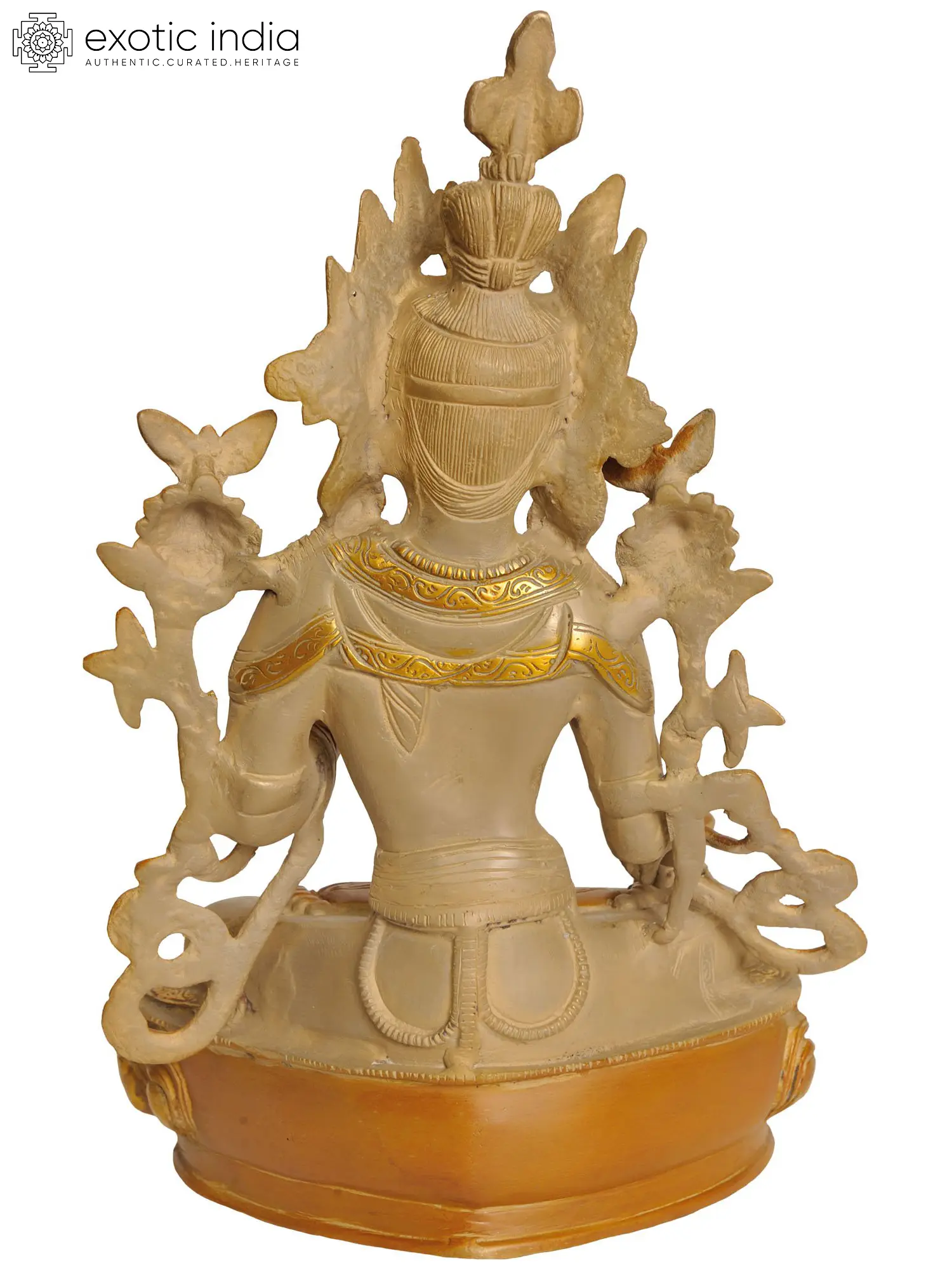 Behold this exquisite brass statue, a resplendent depiction of White Tara, a revered deity in Tibetan Buddhism. White Tara, known as the "Mother of Liberation" or the "Goddess of Everlasting Life," embodies compassion, longevity, and the swift dispelling of fear and suffering. Her serene countenance and gentle demeanor are captured with masterful artistry, inviting a sense of peace and spiritual solace into any space. The goddess is seated in the lotus posture (padmasana), a symbol of purity and spiritual awakening, on an ornate pedestal adorned with intricate floral motifs. Her posture is one of grace and tranquility, with her right hand extended in the boon-granting gesture (varada mudra), offering blessings and fulfillment of wishes. Her left hand rests on her lap in the gesture of meditation (dhyana mudra), signifying her profound inner peace and wisdom.
