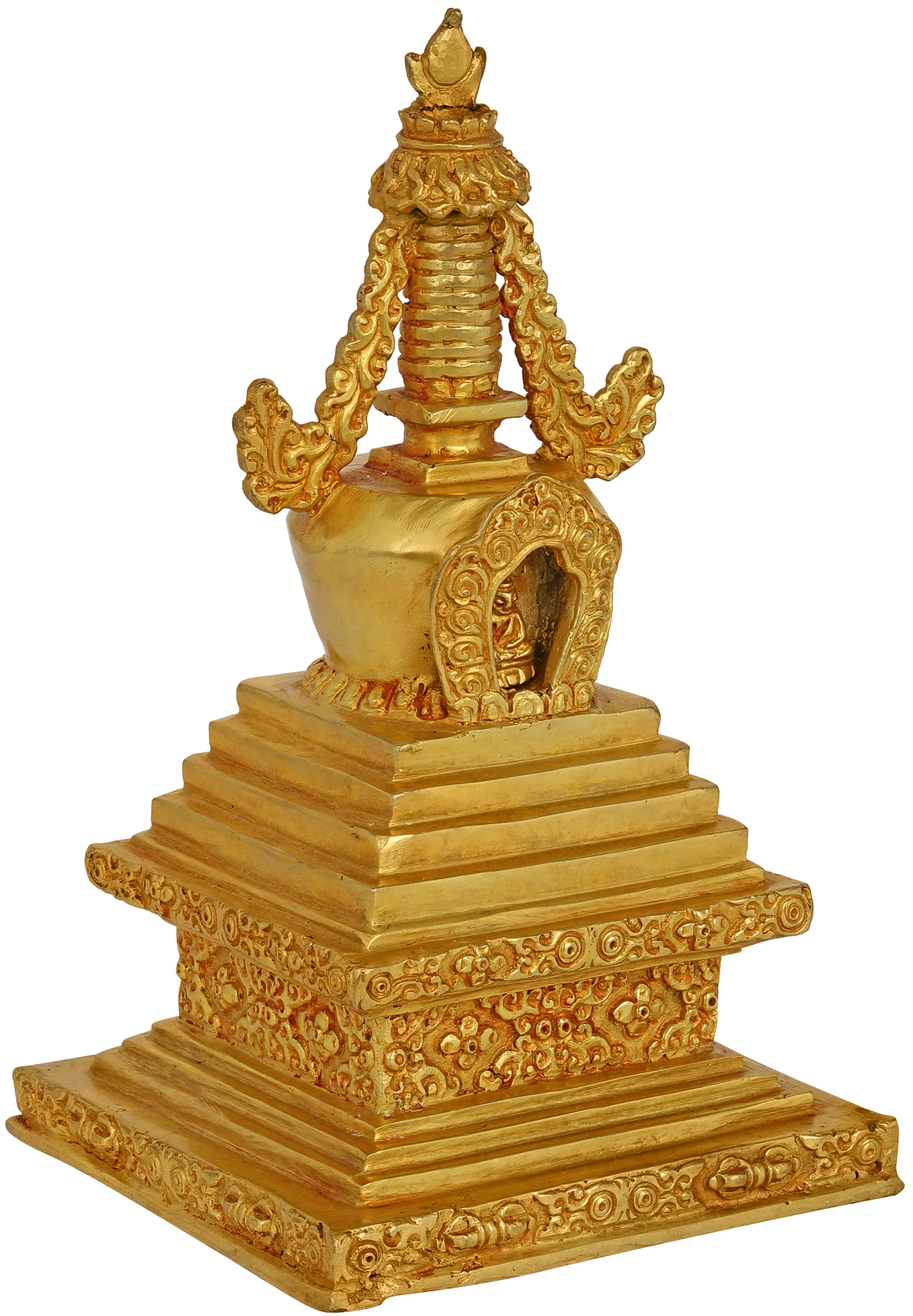 This exquisite gold-plated stupa, also known as a chorten in Tibetan Buddhism, is a profound representation of the enlightened mind of the Buddha. Crafted with meticulous detail from copper in Nepal, this sacred structure embodies centuries of spiritual tradition and artistic heritage. The lustrous gold plating enhances its divine aura, making it a captivating centerpiece for any sacred space or a meaningful gift for those on a spiritual path.