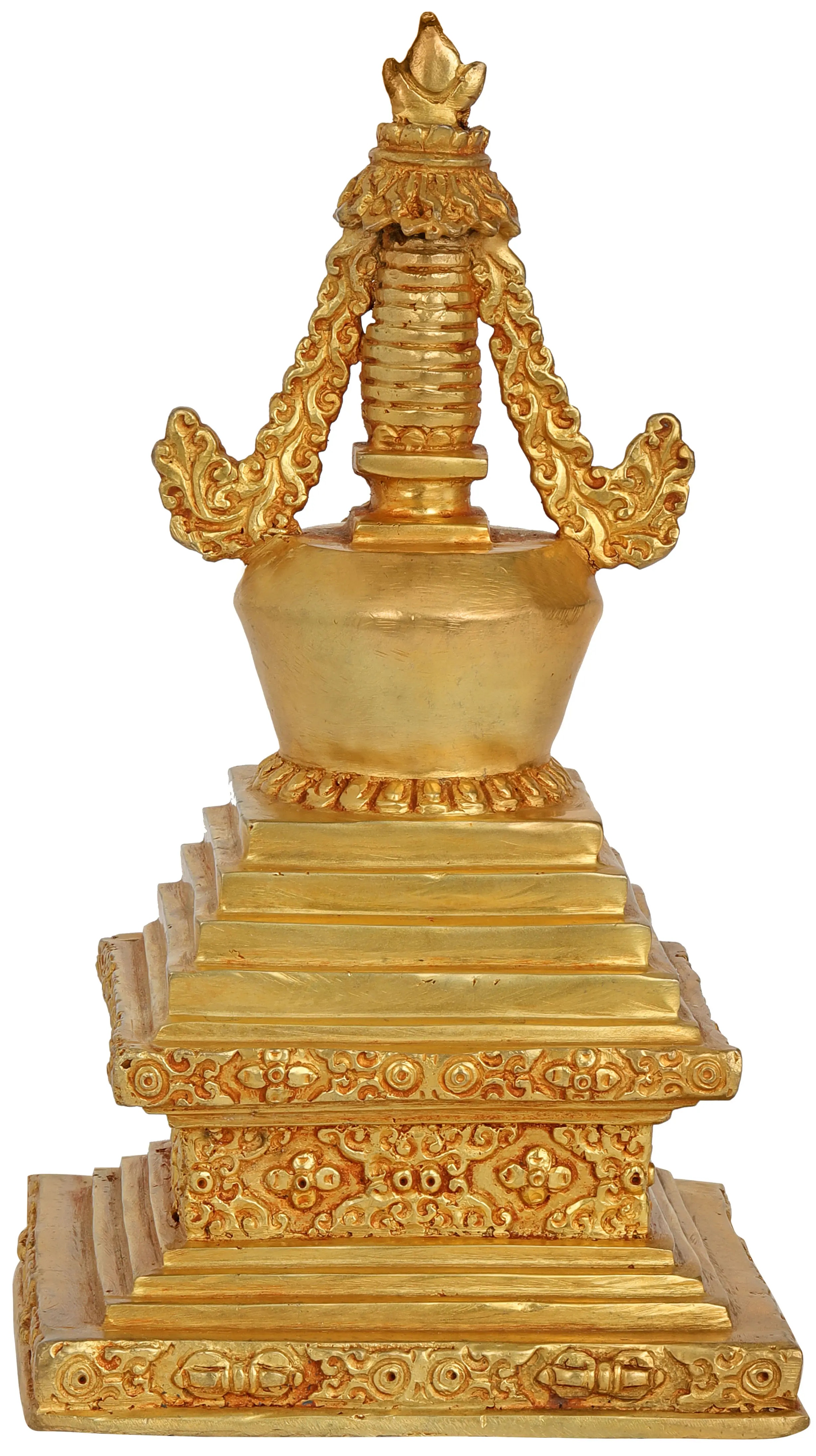 In Tibetan culture, stupas are imbued with immense spiritual significance. They are erected in monasteries, sacred pilgrimage sites, and even in public spaces to generate merit and spread blessings. It is believed that circumambulating a stupa clockwise with devotion can purify negative karma and accumulate positive merit. The very presence of a stupa is considered auspicious, inviting peace, harmony, and spiritual growth. This gold-plated stupa, a testament to the skilled craftsmanship of Nepalese artisans, brings a piece of this sacred tradition into your home or meditation space. Its presence can serve as a constant inspiration, a reminder of the Buddha's teachings, and a source of profound tranquility. It is a tangible connection to the ancient wisdom and spiritual aspirations that have guided countless individuals toward enlightenment.