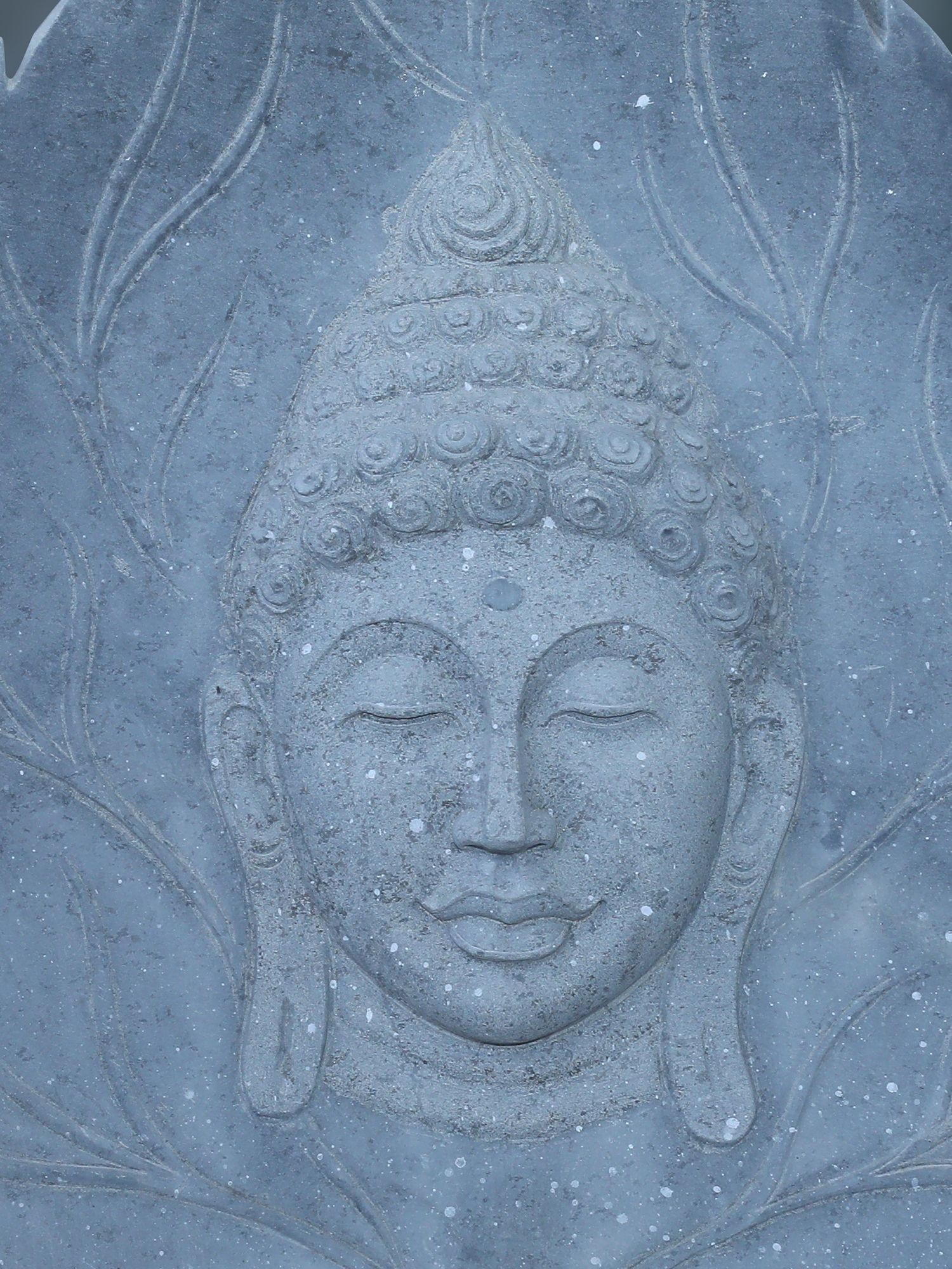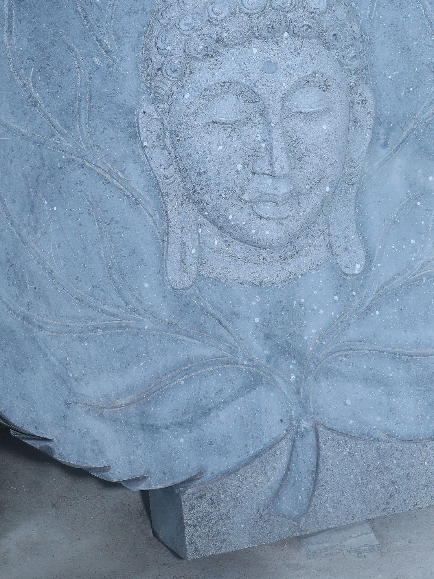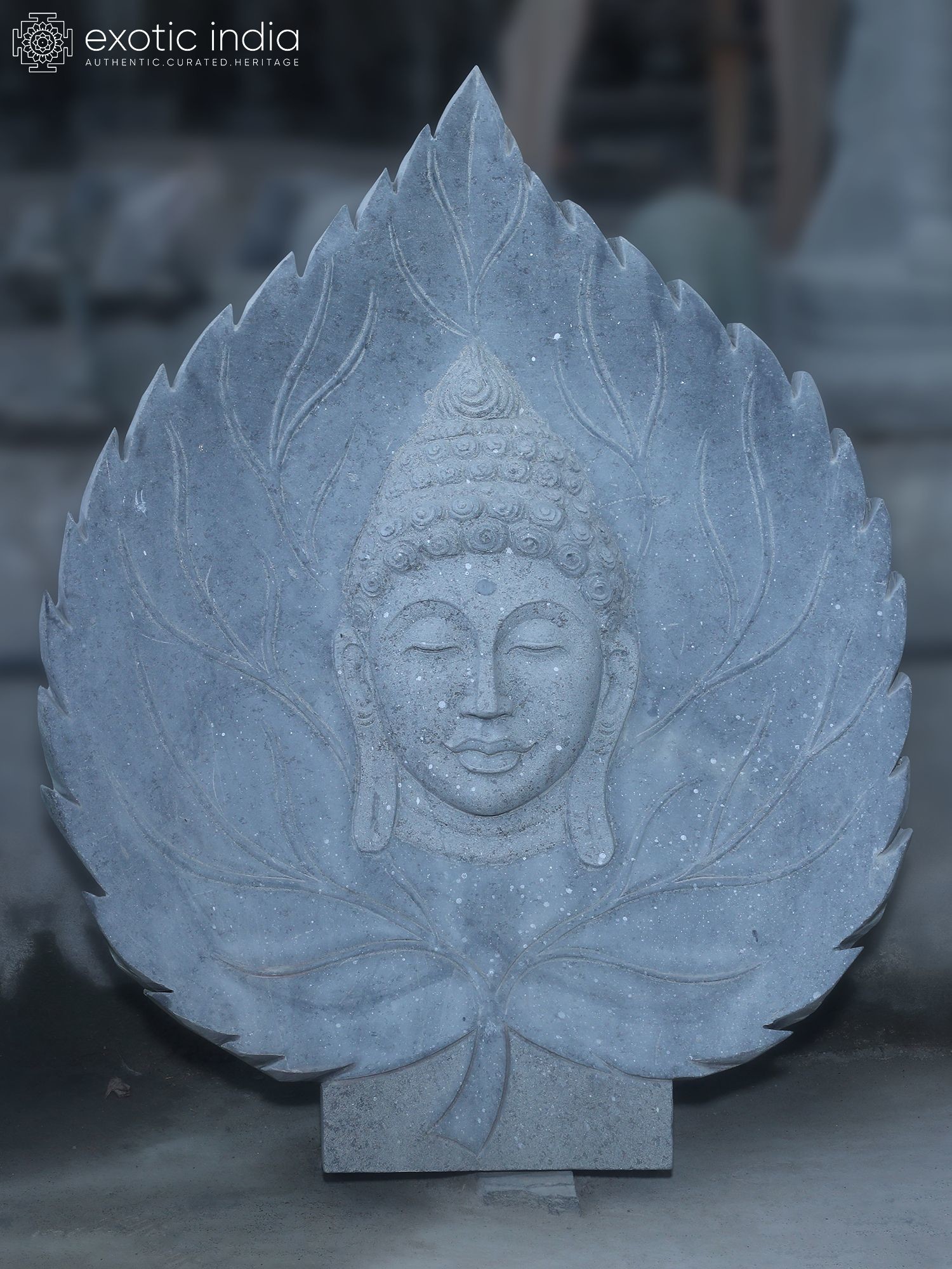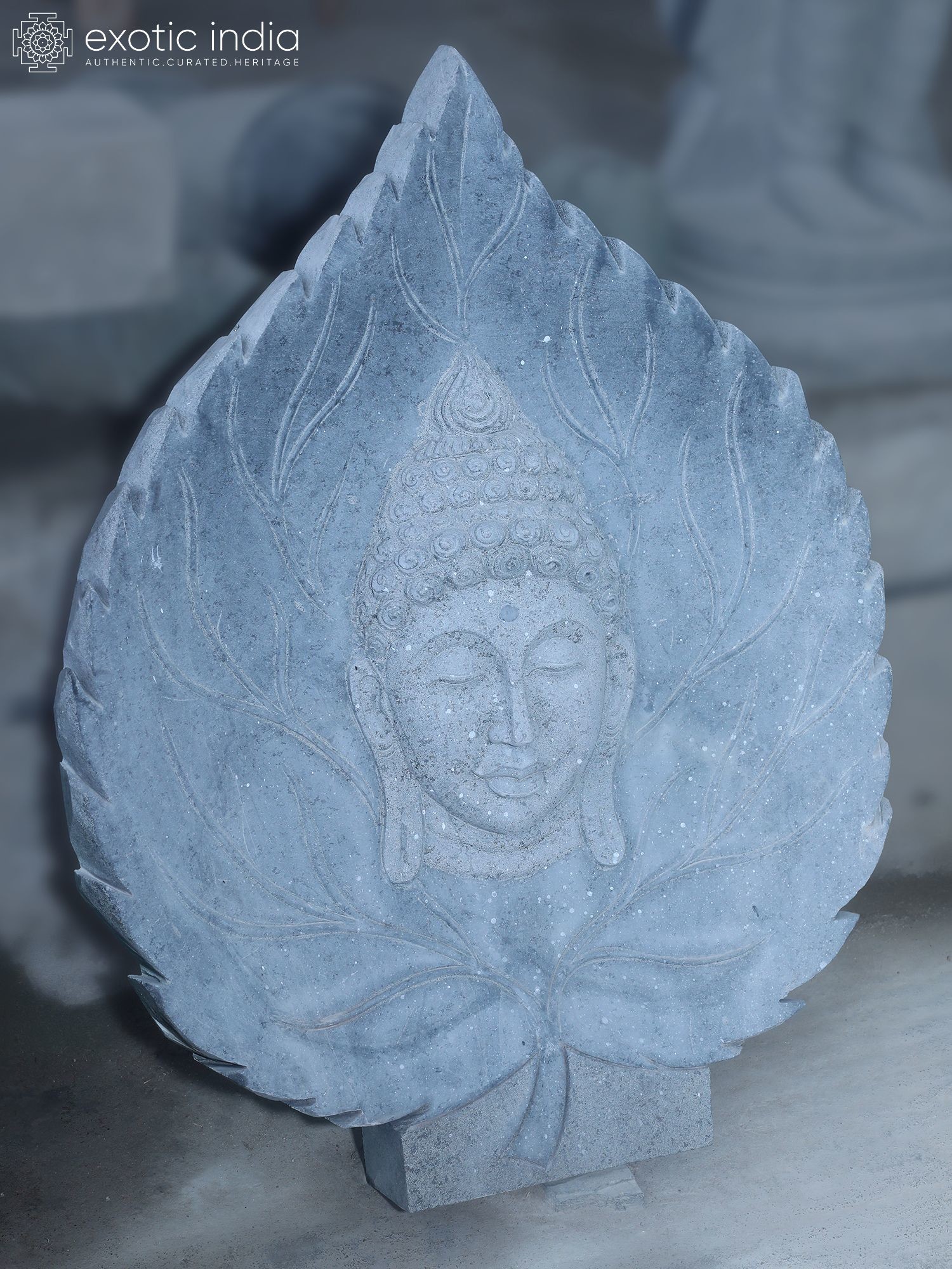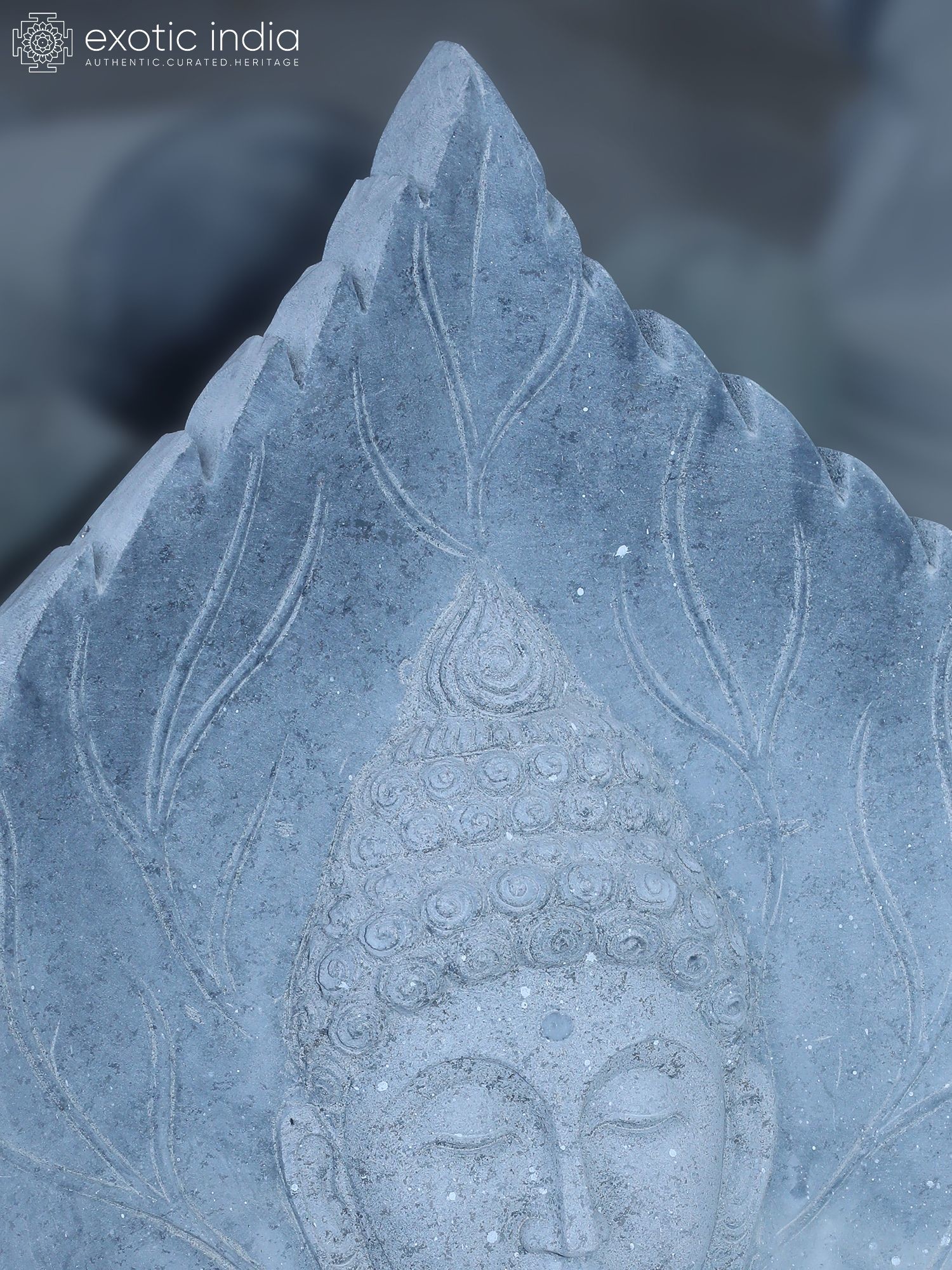Showcases intricate carving details on both the Buddha's visage and the surrounding leaf.