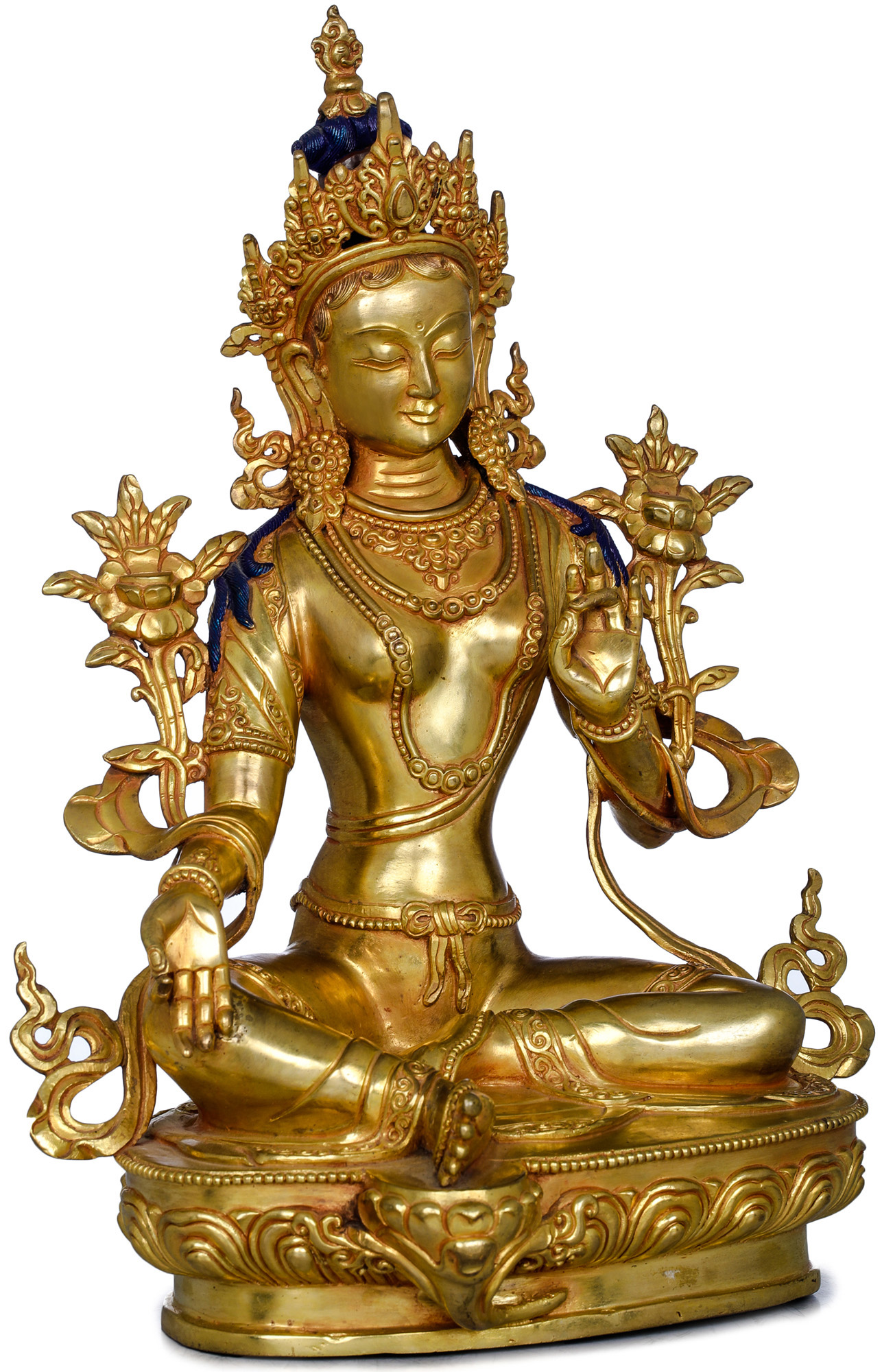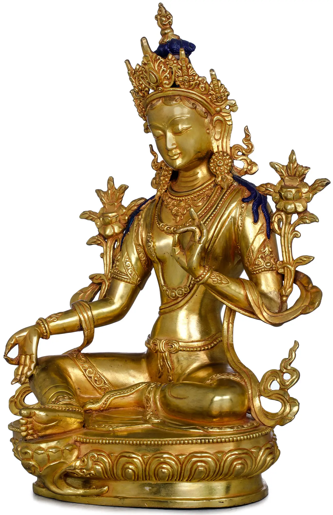 This resplendent statue captures the essence of Green Tara’s serene yet dynamic nature. Her right hand is held in the gesture of *varada mudra*, the boon-granting gesture, signifying her generosity and the bestowal of blessings and protection. In her left hand, she holds the stem of a lotus flower, a symbol of purity, enlightenment, and the unfolding of spiritual realization. The lotus blooms around her, representing her ability to flourish amidst the "mud" of worldly existence without being tainted by it. The intricate crown and ornaments adorning her person speak of her celestial status and her role as a guide to higher realms. The craftsmanship of this piece, originating from Nepal, reflects centuries of dedicated artistic tradition. Each detail, from the gentle smile on her face to the flowing robes, is rendered with precision and devotion. The copper base, rich with sculpted motifs, provides a solid foundation for the divine presence of Green Tara, symbolizing the grounded nature of her compassionate action in the material world. This statue serves not merely as an object of beauty, but as a potent reminder of the potential for compassion and liberation that resides within all beings.