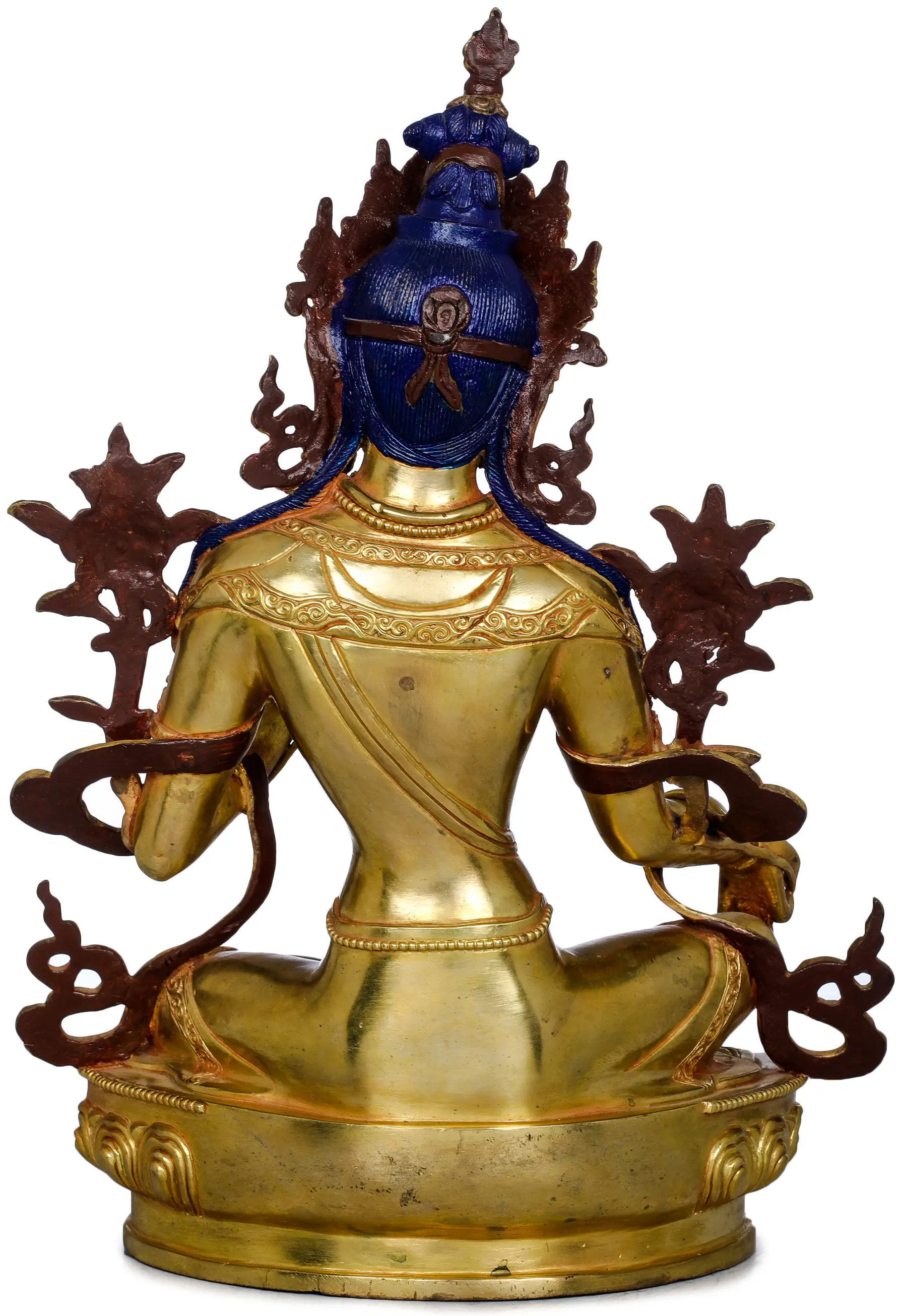Nepalese statues and sculptures have a high copper content and therefore develop a slightly reddish patina on the surface as they age. However, the most unique feature of Nepalese copper statues is their decorative detailing. The pieces are heavily gilded and sometimes inlaid with semi-precious stones. This embellishment protects them from getting tarnished. The traditional lost-wax method for casting Nepalese copper statues remains the most practiced technique in Nepal for many centuries. This process involves many steps and requires skilled artists.