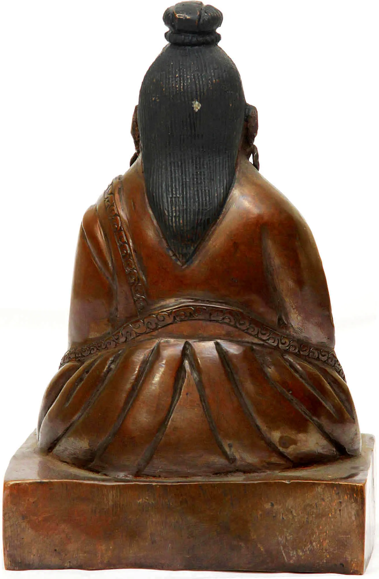 This intricately crafted copper sculpture portrays a revered figure, radiating peace and profound knowledge. Seated in a meditative posture, the subject's calm countenance and gentle smile evoke a sense of serenity. The copper material lends a warm, earthy tone, enhancing the sculpture’s visual appeal and symbolic weight. The meticulous detailing in the flowing robes and serene facial expression speak to the artist’s skill and deep respect for the subject.