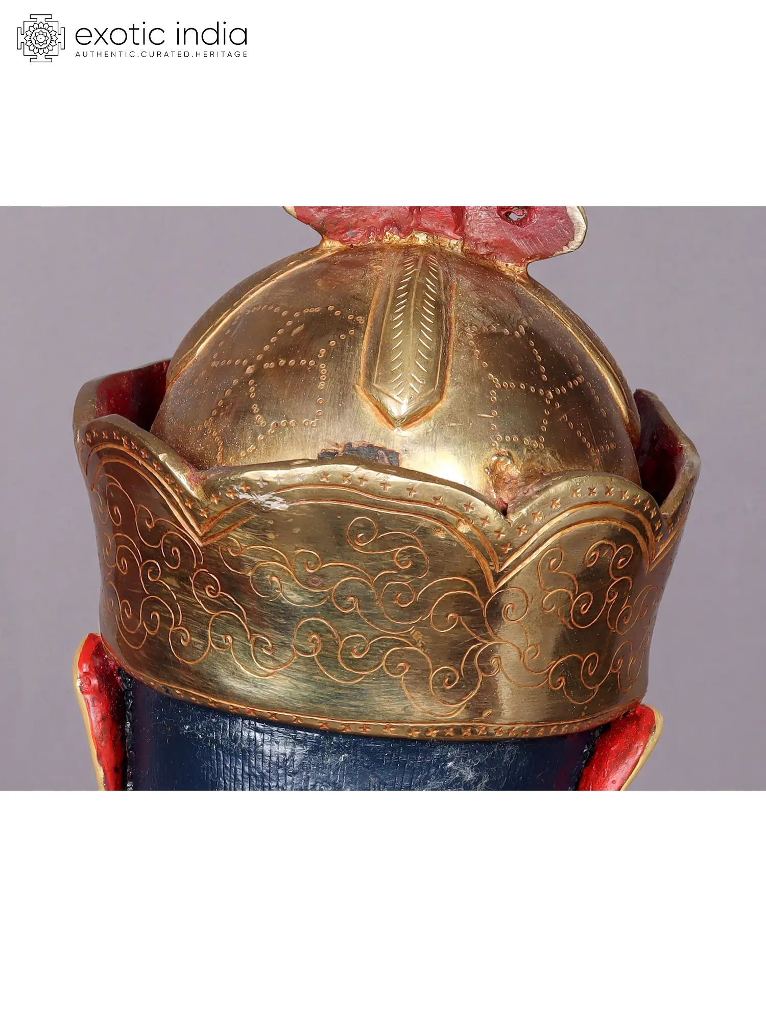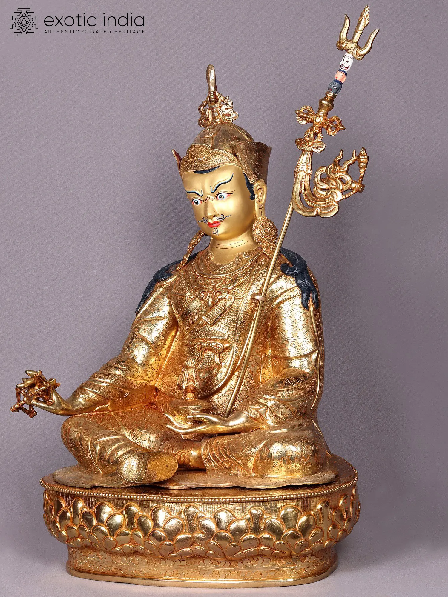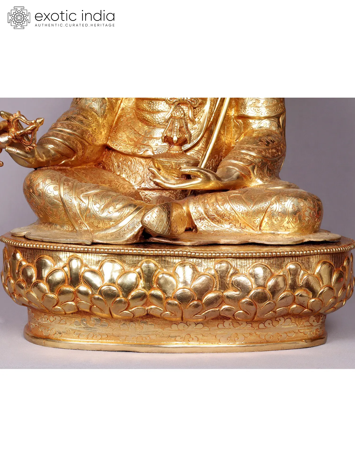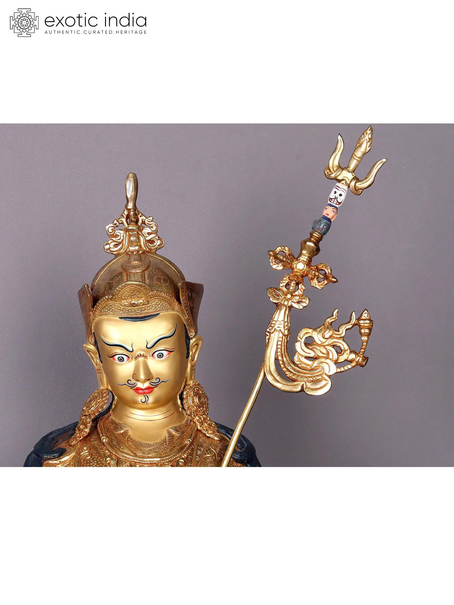 Padmasambhava- the lotus-born teacher in Himalayan Buddhism is the great master for innumerable students, who are guided by the enlightened light of the teacher on the difficult path of their life. The intricately adorned gilded copper Padmasambhava statue from Nepal depicts the powerful master in an emotive mood, wearing his characteristic qualities decorated with minute patterns and studded with stones. Vajra, a pot of ambrosia, and a staff with swaying strings form the attributes of Padmasambhava in this icon, who sits on a lotus platform with a unique delineation of petals.