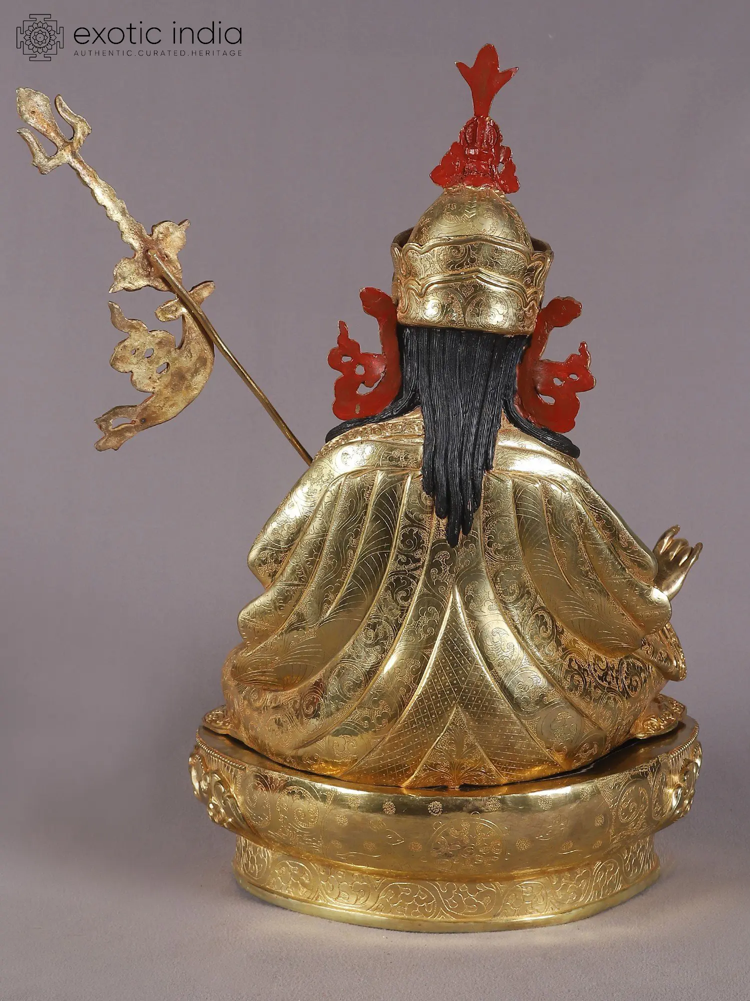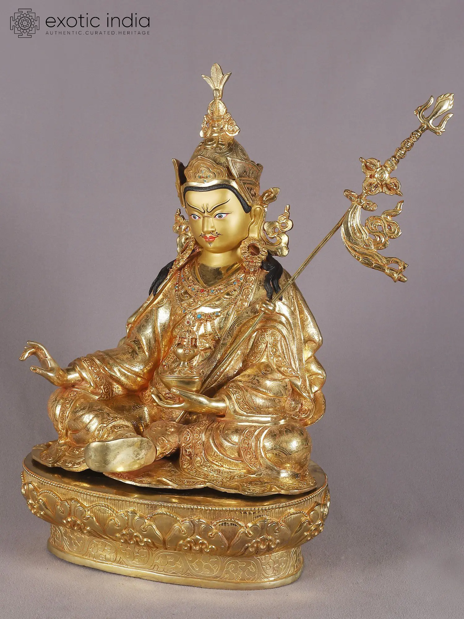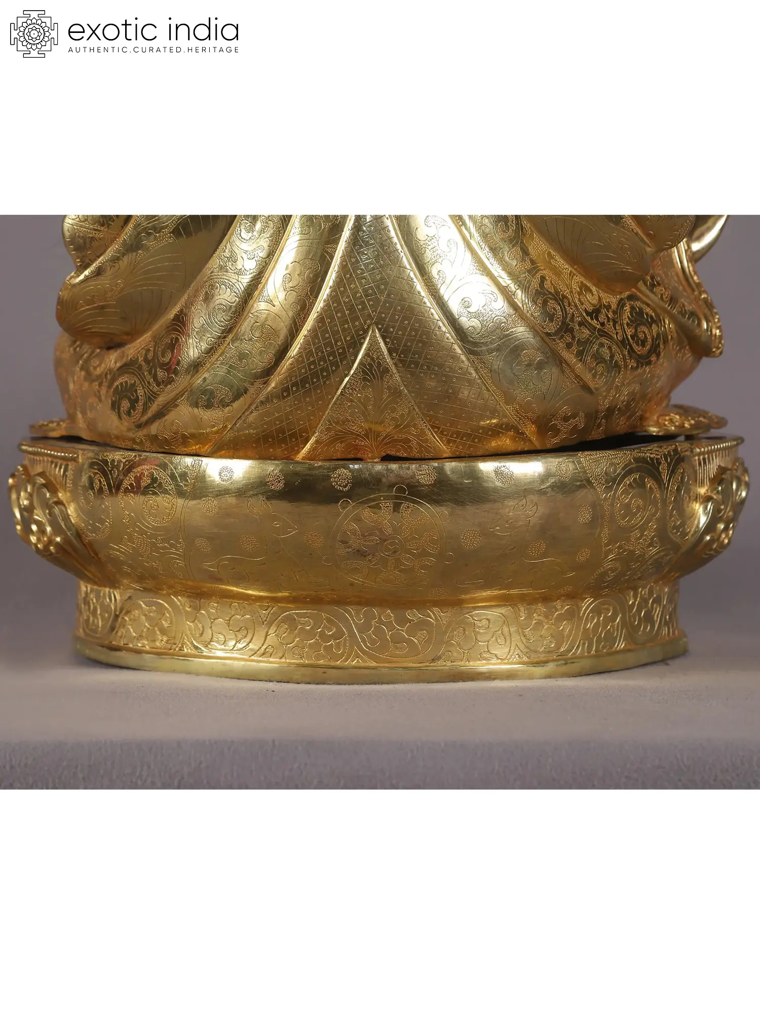 This magnificent sculpture captures the revered presence of Guru Padmasambhava, the "Lotus-Born Master," a pivotal figure in the introduction and establishment of Vajrayana Buddhism in Tibet. Crafted from copper and lavishly gilded with gold, the statue exudes an aura of divine power and profound wisdom. Guru Rinpoche, as he is affectionately known, is depicted in his classic seated posture, with legs crossed in a meditative stance upon an intricately ornamented lotus throne, a symbol of purity and spiritual awakening. His countenance is serene yet commanding, with finely rendered facial features that convey deep compassion and unwavering resolve. The serene expression is further enhanced by the detailed rendering of his regal adornments, including his characteristic five-pointed crown, signifying his mastery over the five wisdoms, and the ornate jewelry that graces his neck and ears. The liberal application of gold imbues the entire form with a luminous quality, reflecting the enlightened nature of the great siddha.