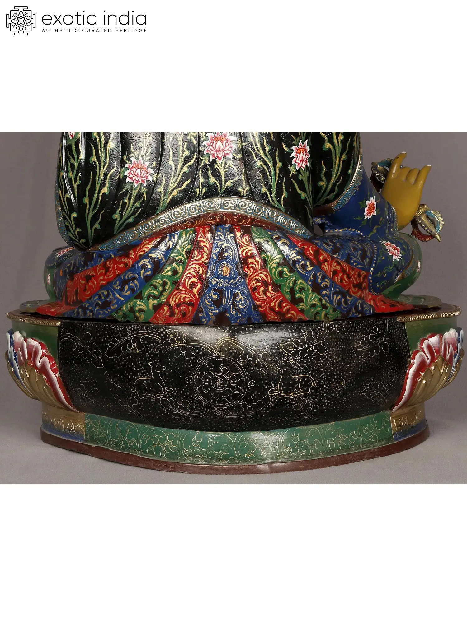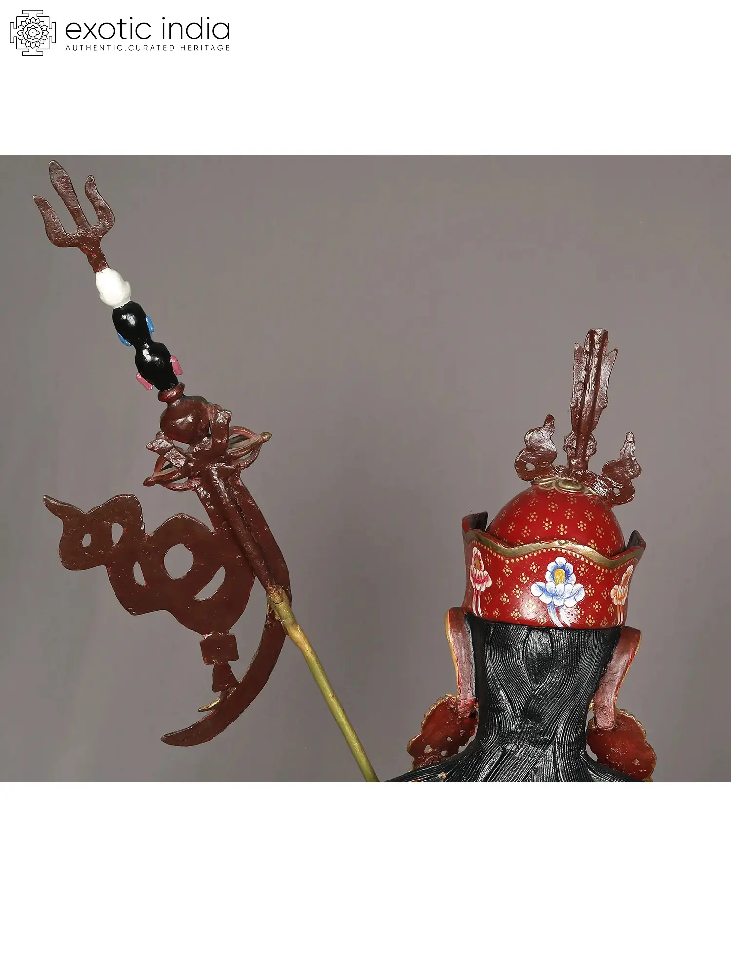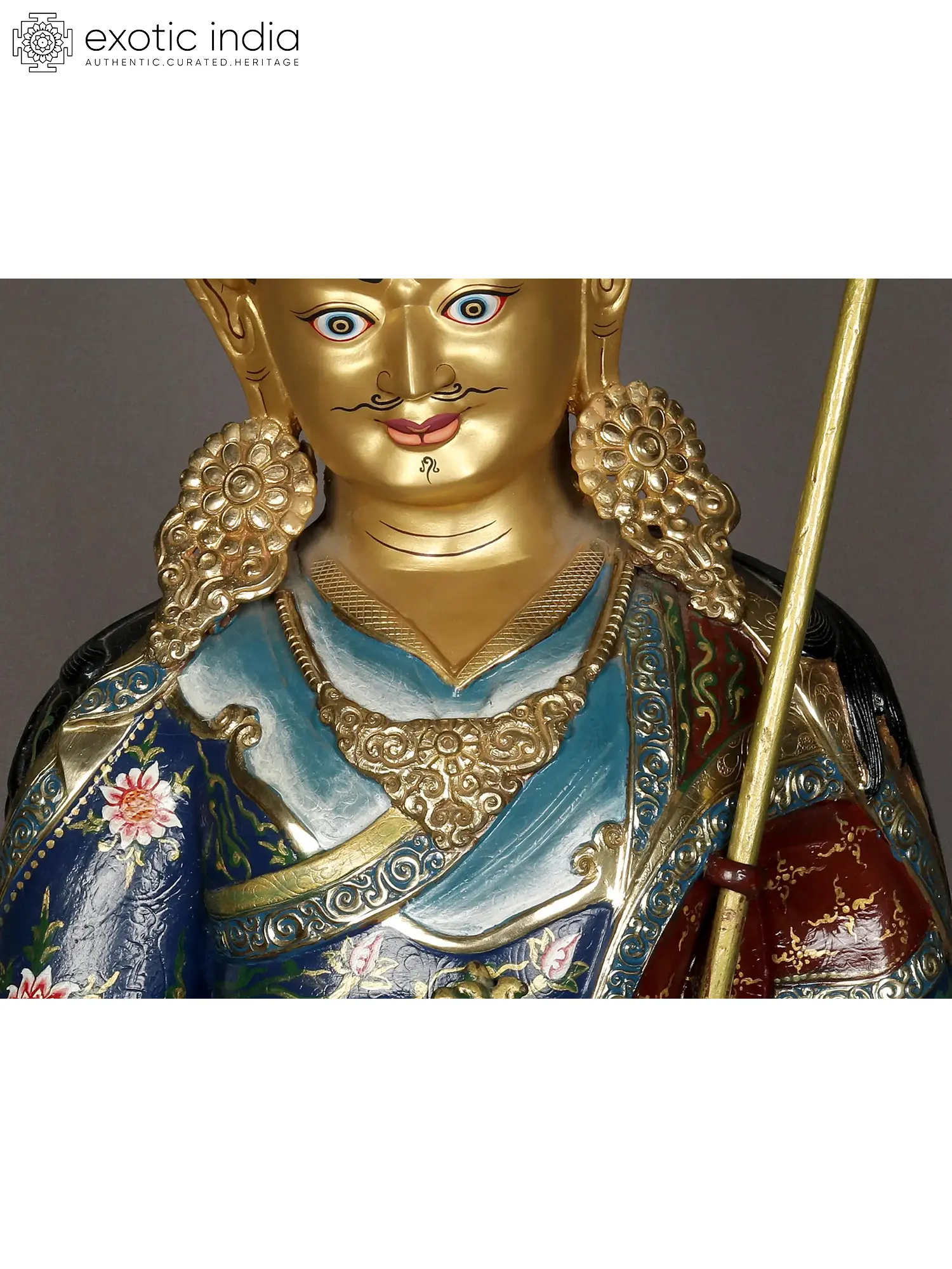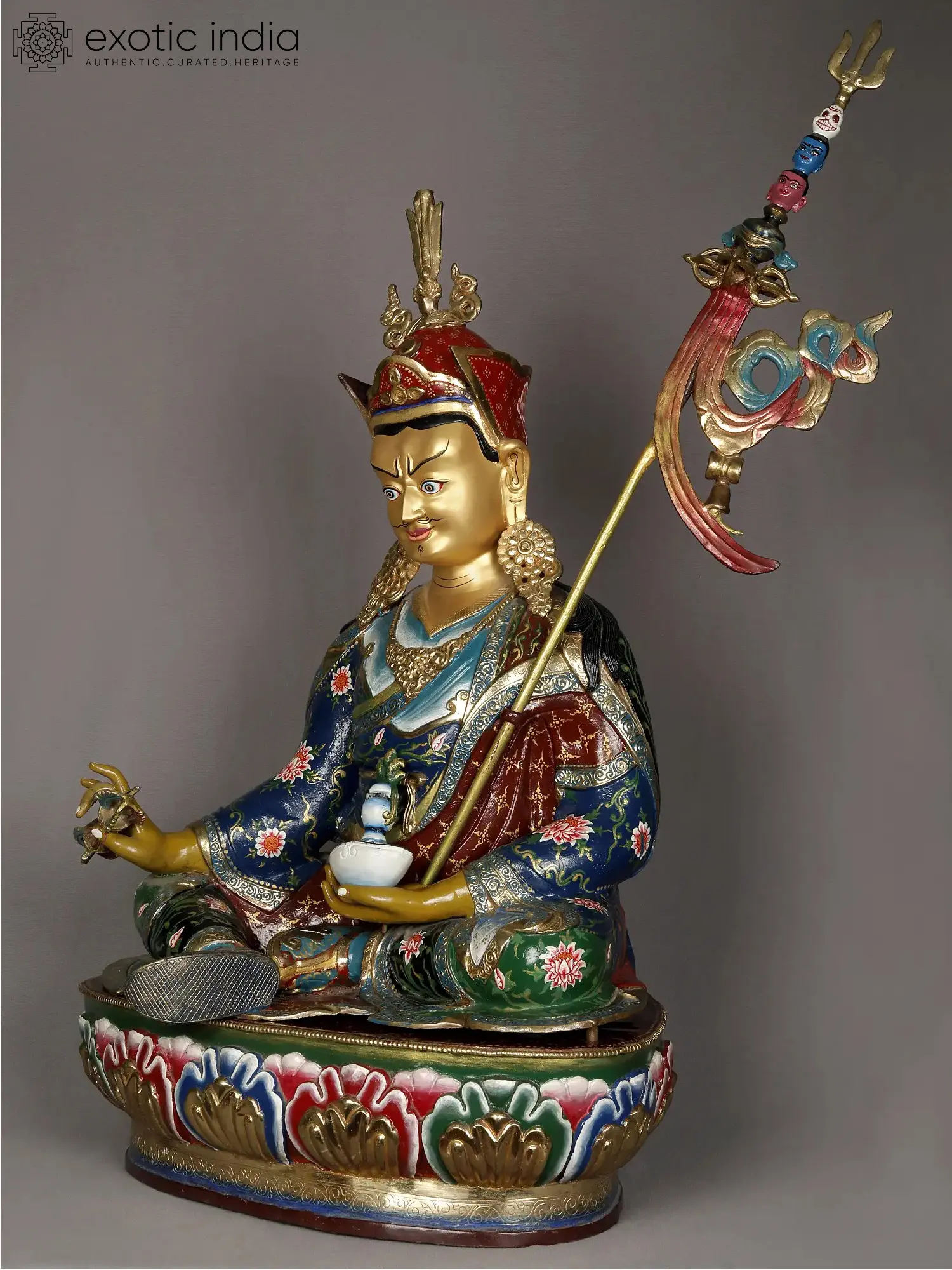 Born from the lotus which is the symbol of supreme enlightenment in Buddhism, Guru Padmasambhava represents the pinnacle of wisdom. In this gilded copper Padmasambhava statue from Nepal, Guru Padmasambhava is attired vibrantly, with blooming lotuses patterned on it. With the pot of ambrosia, Vajra, and staff with three heads presenting youth, old age, and death, Padmasambhava in this statue underlines the impermanence of life while holding the nectar of knowledge in his hands.