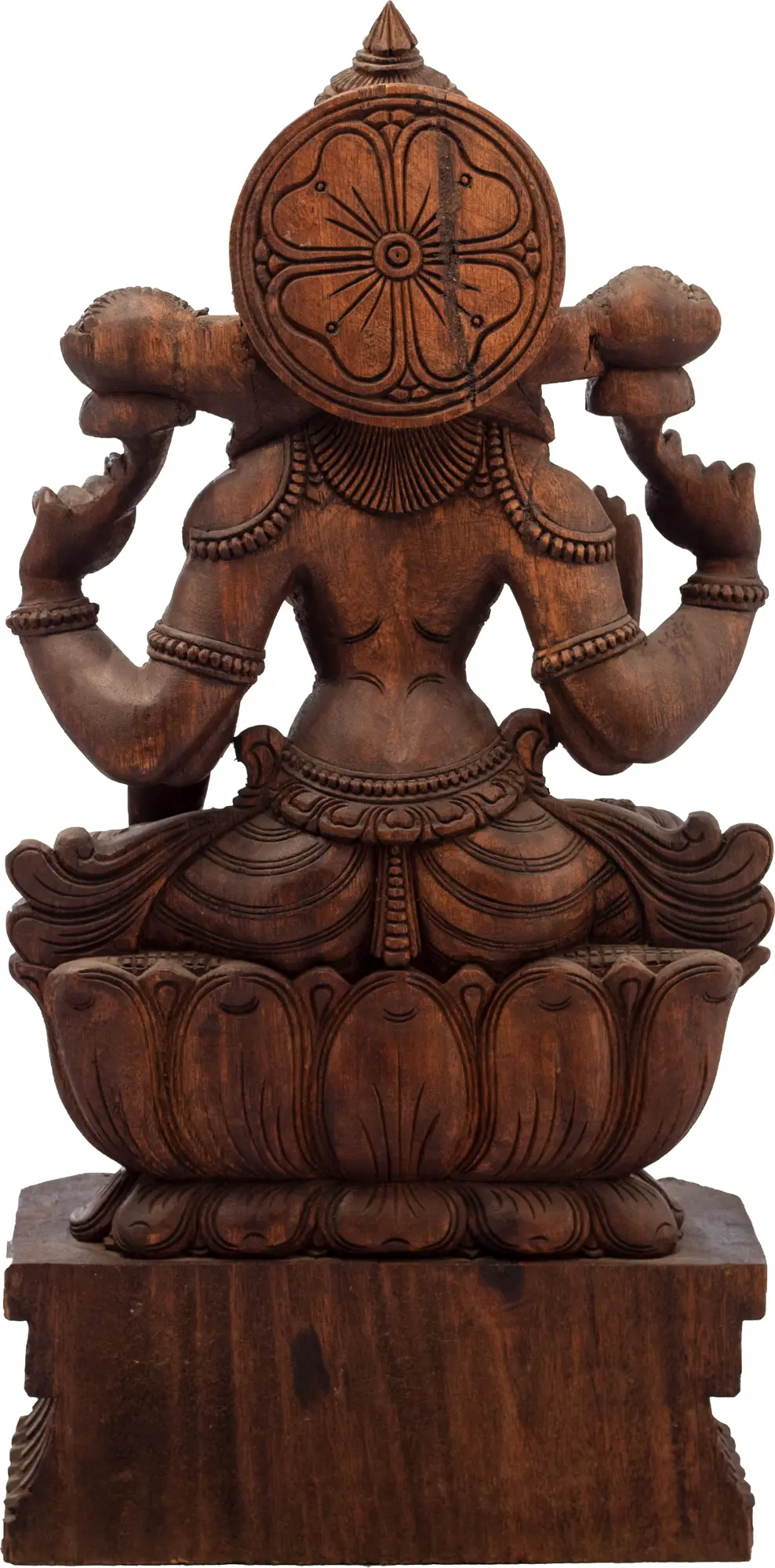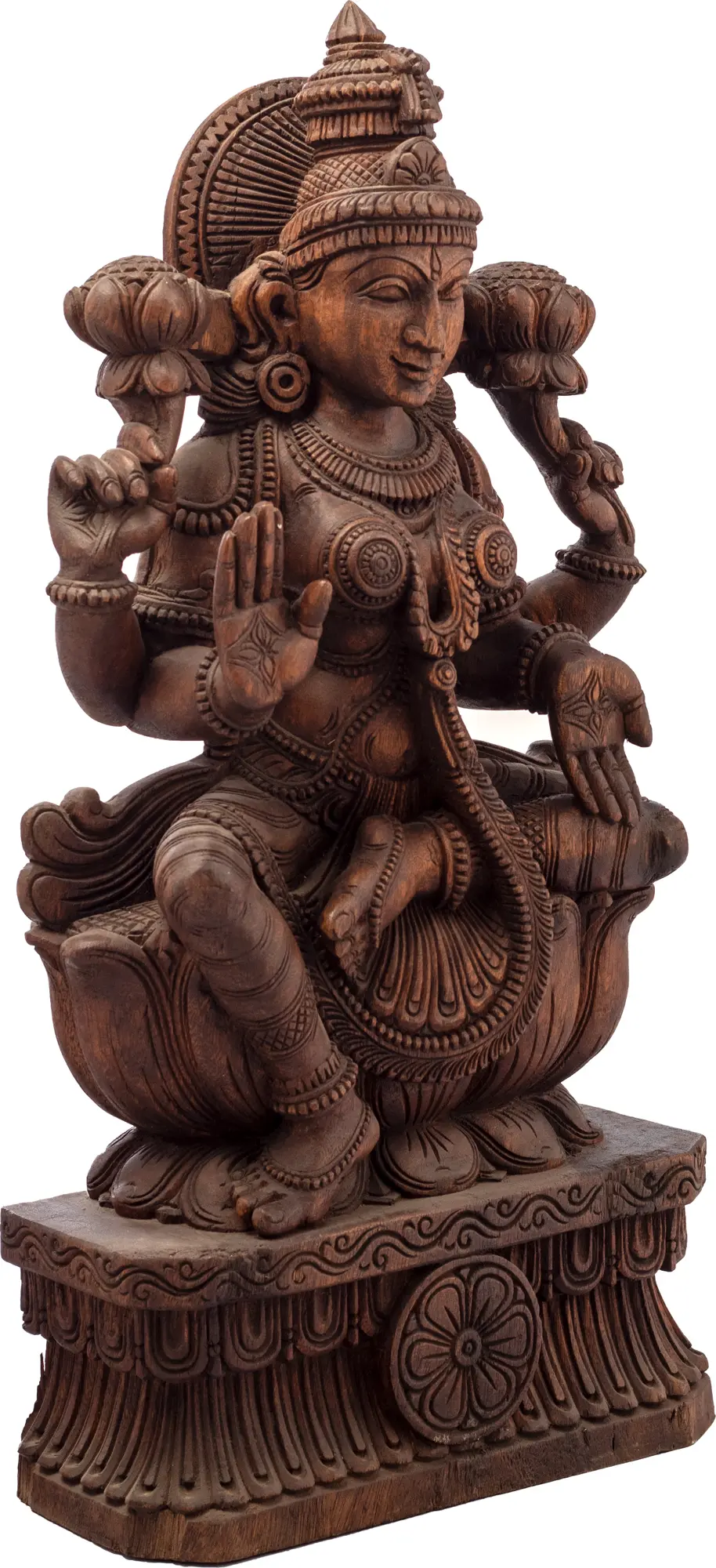 Invite the benevolent presence of Goddess Lakshmi into your home with this exquisitely carved wooden sculpture. Crafted with profound skill in the traditional South Indian temple style, this piece captures the very essence of prosperity, abundance, and spiritual grace. The goddess is depicted in a serene seated posture, her form radiating a gentle power and maternal warmth. She is seated upon a freshly bloomed lotus, a powerful symbol in Hindu iconography representing purity, beauty, and spiritual enlightenment. The lotus, often called Padmasana when a deity is seated upon it, signifies the divine's ability to emerge unstained from the material world. Lakshmi, the goddess of wealth and fortune, is inextricably linked with the lotus, embodying its unfolding beauty and its ability to provide nourishment and sustenance.