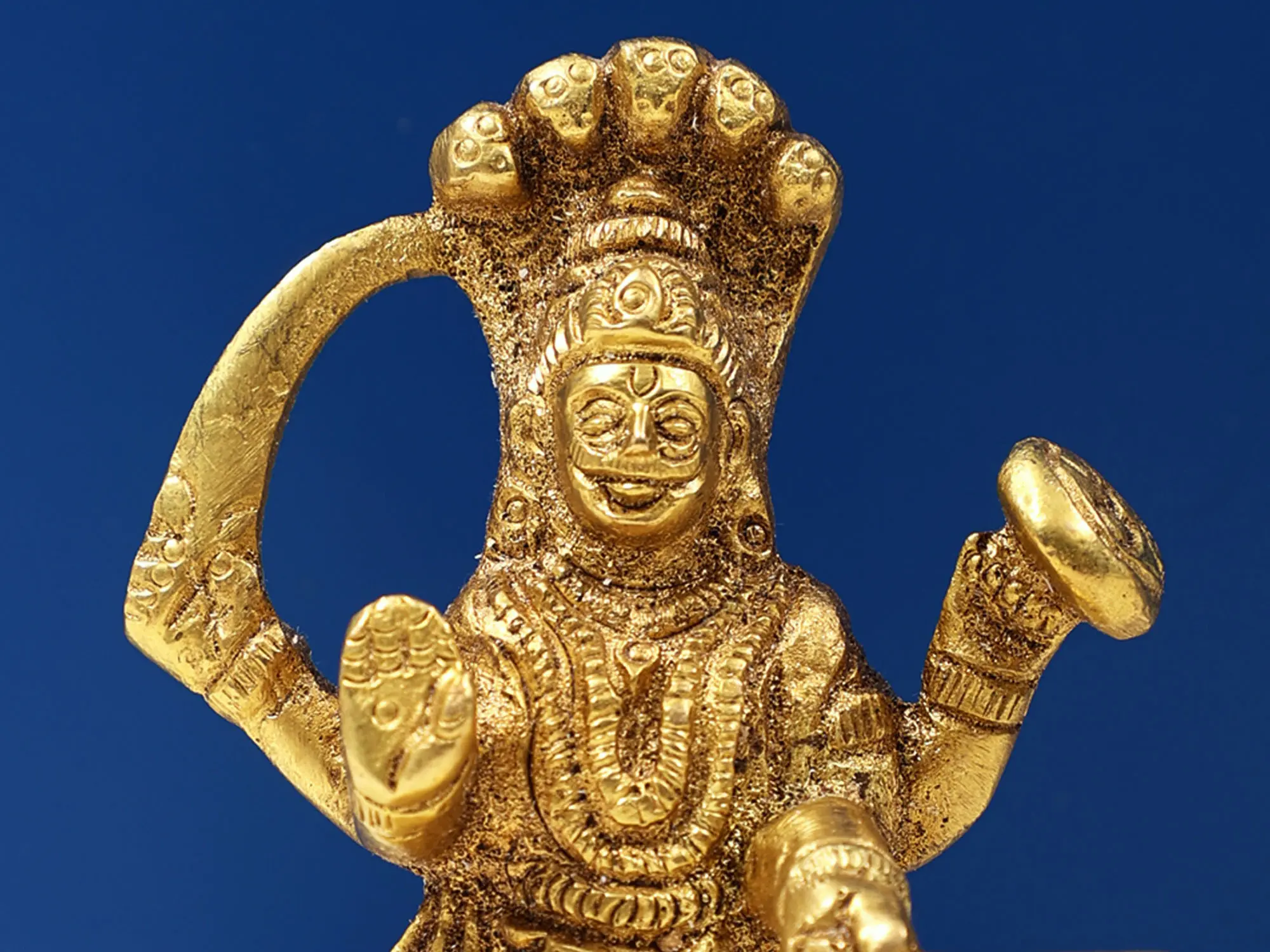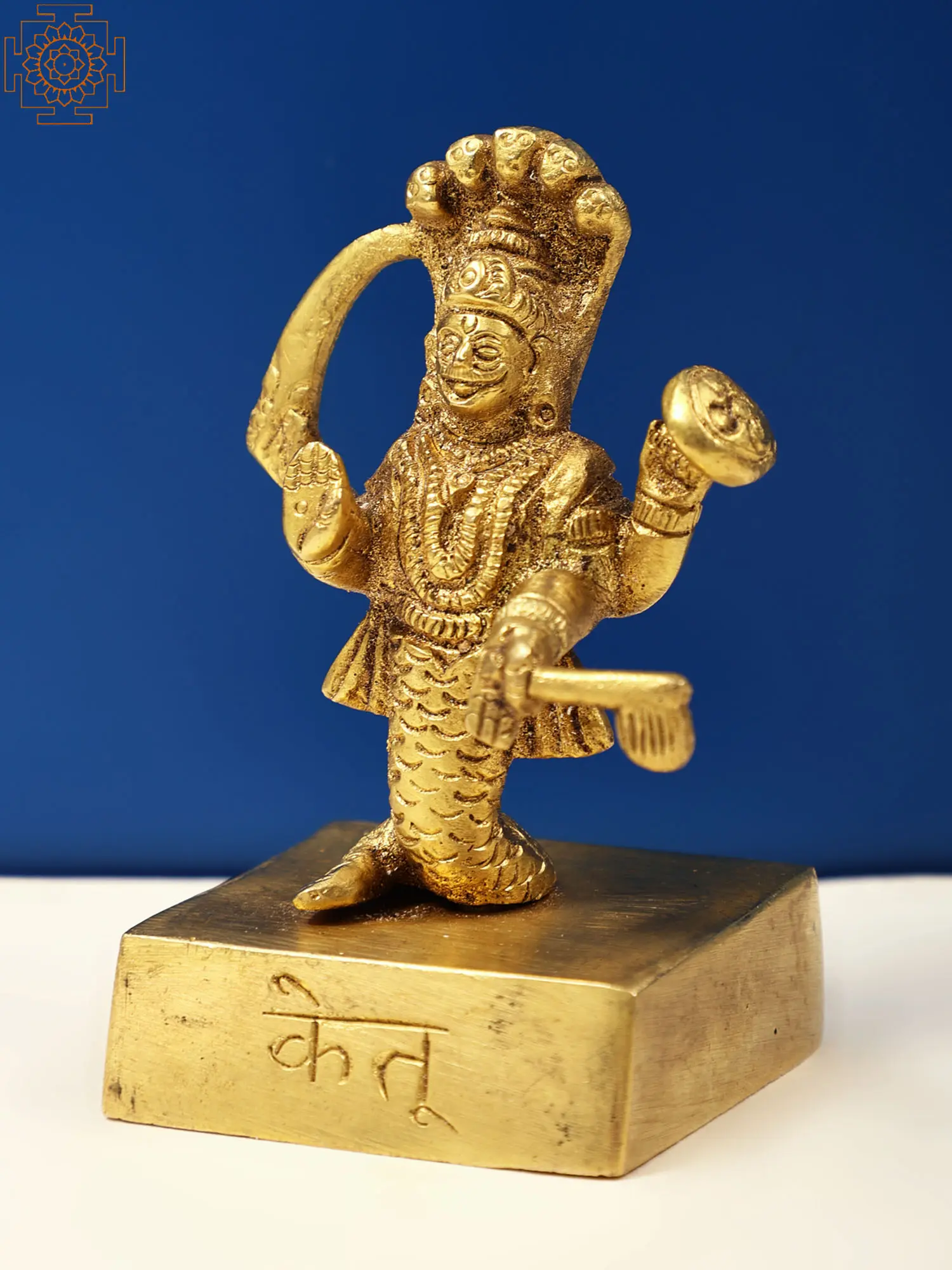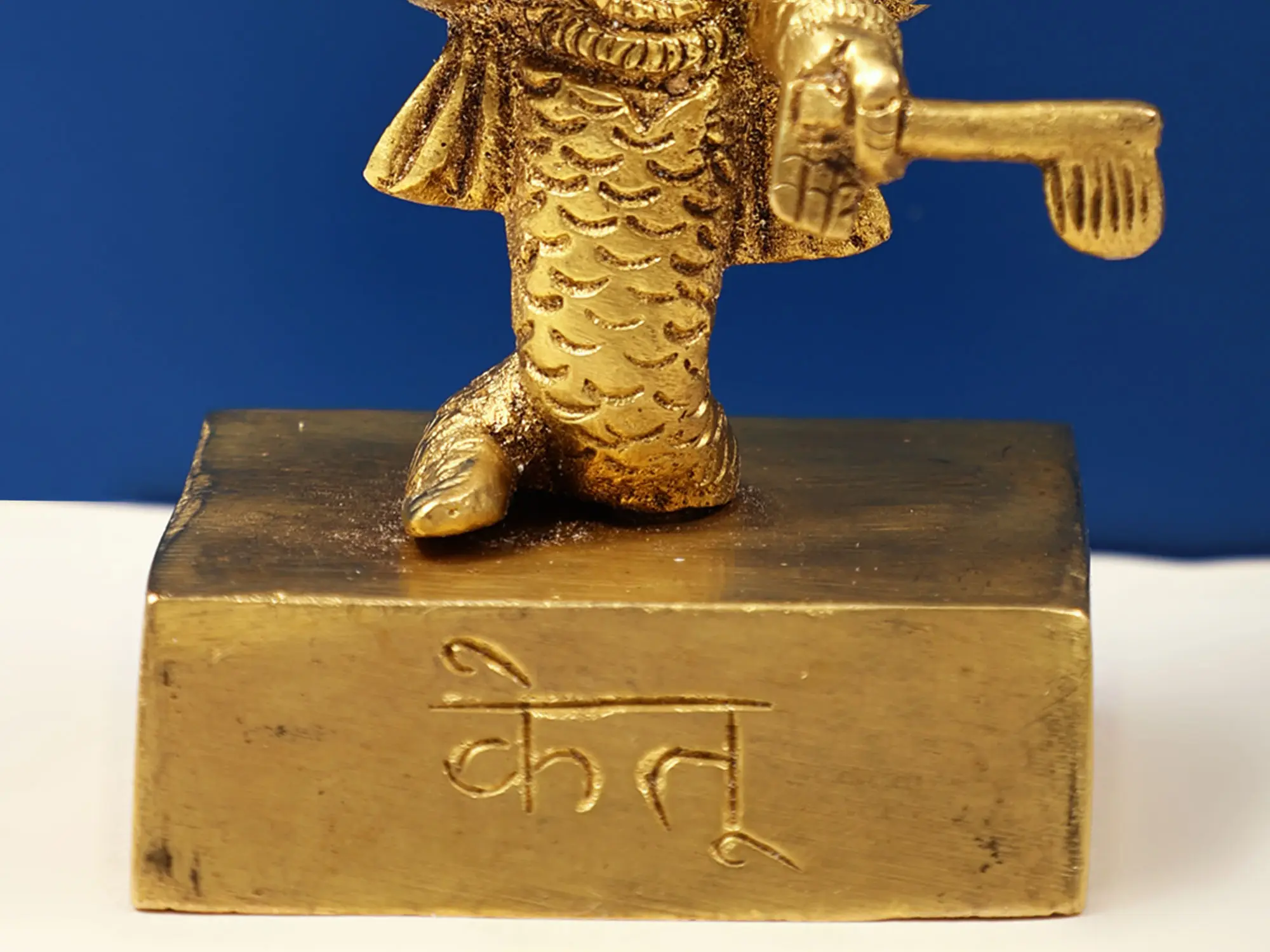 This exquisitely handcrafted brass statue embodies the esoteric energies of Ketu, one of the shadow planets in Vedic astrology. Ketu, often personified as a headless, serpentine entity, is known for its ability to bestow spiritual insight, detachment, and the resolution of karmic debts. This magnificent sculpture captures the essence of Ketu's transformative power, making it a profound addition to any altar, meditation space, or personal collection. The statue depicts Ketu with a regal cobra hood, signifying protection and divine power. Its multiple arms hold significant symbolic objects, including a curved sword, representing the severing of illusions and attachments, and a key, symbolizing the unlocking of hidden knowledge and spiritual liberation. The intricate detailing and lustrous finish of the brass showcase the artisan's skill and dedication, imbuing the piece with a sense of antiquity and sacredness.