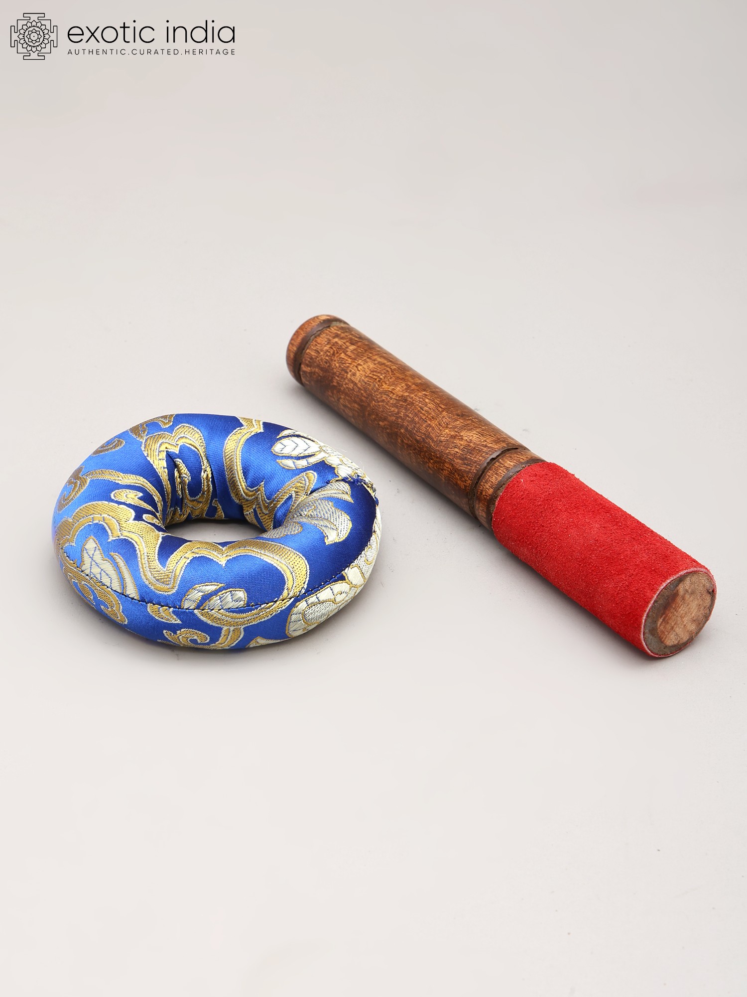 Measuring seven inches in diameter, its generous size allows for a full, resonant sound. The bowl's lustrous bronze surface, with its characteristic hammered texture, reflects light beautifully, adding a visual appeal that complements its auditory qualities. Accompanied by a tactile wooden striker and a vibrantly patterned cushion, each element is thoughtfully chosen to enhance your experience.