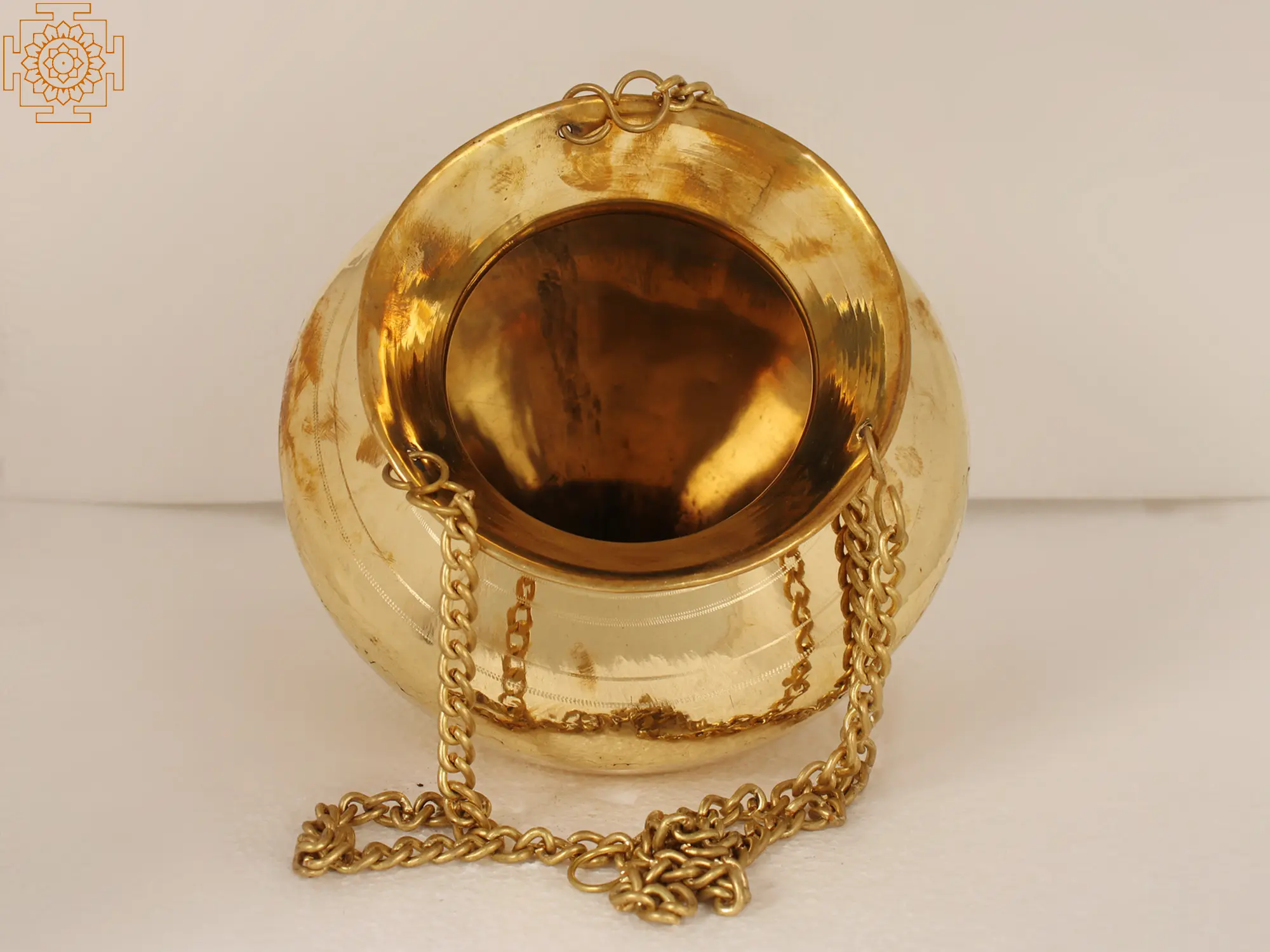 This Jaldhara Kalash is a very important ceremonial instrument made of brass and it comes with three interconnected chains connecting to three different parts of the Kalash's mouth. It is utilized for Shiv Lingam Abhishekam or sacred washing. The vase is hung above the Shiva Lingam and drops water or other offerings like as milk, curd, honey, and other cold substances for Abhishekam to expel bad energy from a home or temple. The use of brass, a holy metal, feeds good energy into the Kalash and boosts its power. The pointed conical bottom enables for careful dripping of the holy liquid ingredient, resulting in an efficient ceremony.