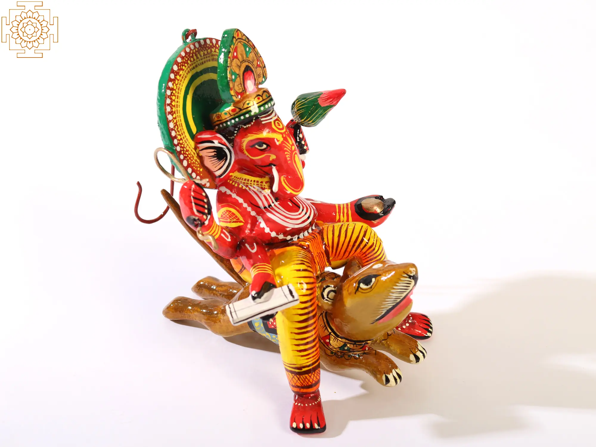 A marvel of divine art emerges in the heart of magical Varanasi: Lord Ganesha, the harbinger of success, perched atop his beloved steed, Mushaka. This magnificent sculpture, made of the finest wood, emanates an enchanting aura where spirituality and craftsmanship meet. The delicate intricacies of Ganesha’s compassionate expression are woven into the wood, with eyes that appear to hold the mysteries of eternity. Mushaka, with a gentle serenity, lends a sense of harmony to this exquisite tableau. Varanasi’s soul permeates through this work, where faith and art meet in a fascinating celebration of devotion, as it hangs gracefully in the ambient light.