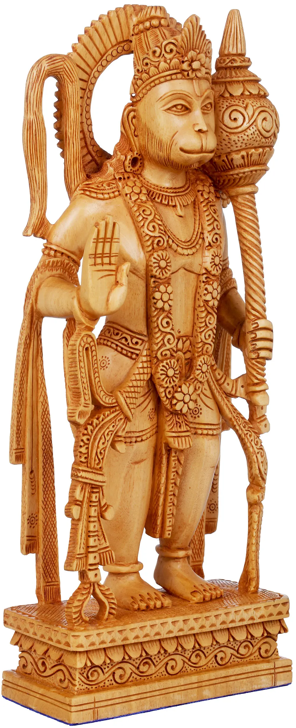 This exquisite wooden carving from Nepal depicts Lord Hanuman, the devoted disciple of Lord Rama and an avatar of Lord Shiva, in a posture of granting "Abhaya"—fearlessness and protection. Revered as the embodiment of strength, devotion, and unwavering loyalty, Hanuman plays a pivotal role in the epic Ramayana, where his courage and exploits are legendary. This intricately detailed statue captures the essence of his divine persona, offering a tangible connection to the spiritual strength he represents. The craftsman has brought to life the powerful form of Hanuman with remarkable artistry. From the noble and determined expression on his face, framed by a majestic headdress, to the powerful physique adorned with traditional ornaments, every element is rendered with precision. The sacred thread (janeyu) draped across his chest and the floral garland signify his divine status and devotion. In one hand, he raises the Abhaya Mudra, a gesture of reassurance and blessing, while the other firmly grasps his mace (gada), a symbol of his immense power and readiness to vanquish evil. The flowing drapery and the elaborate ornamentation on his belt and leg guards add a sense of regal dignity to the figure. ––––––––––