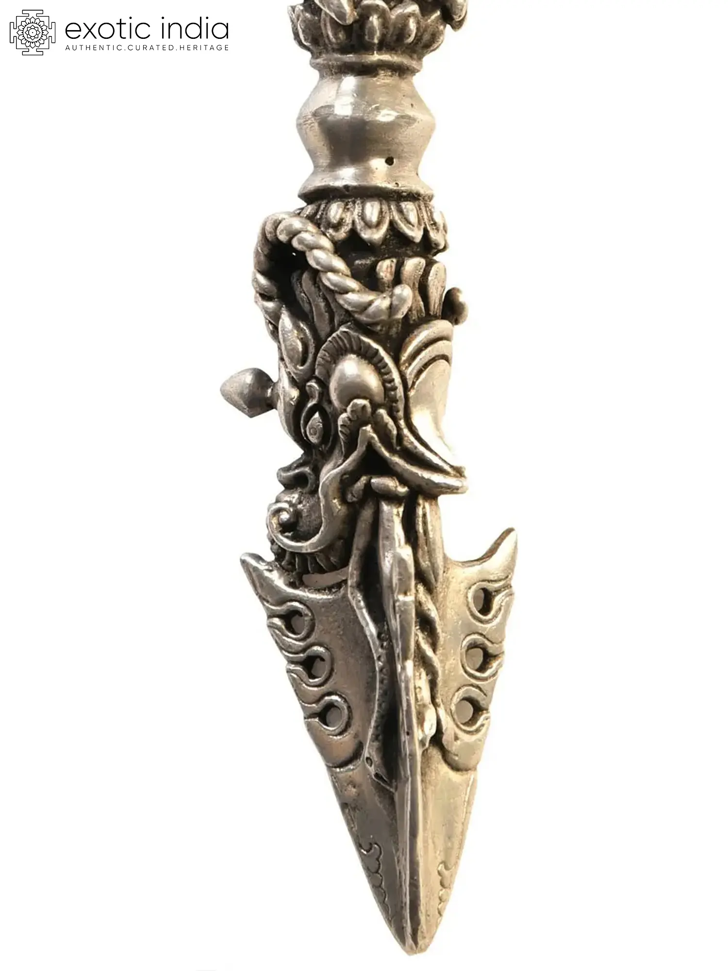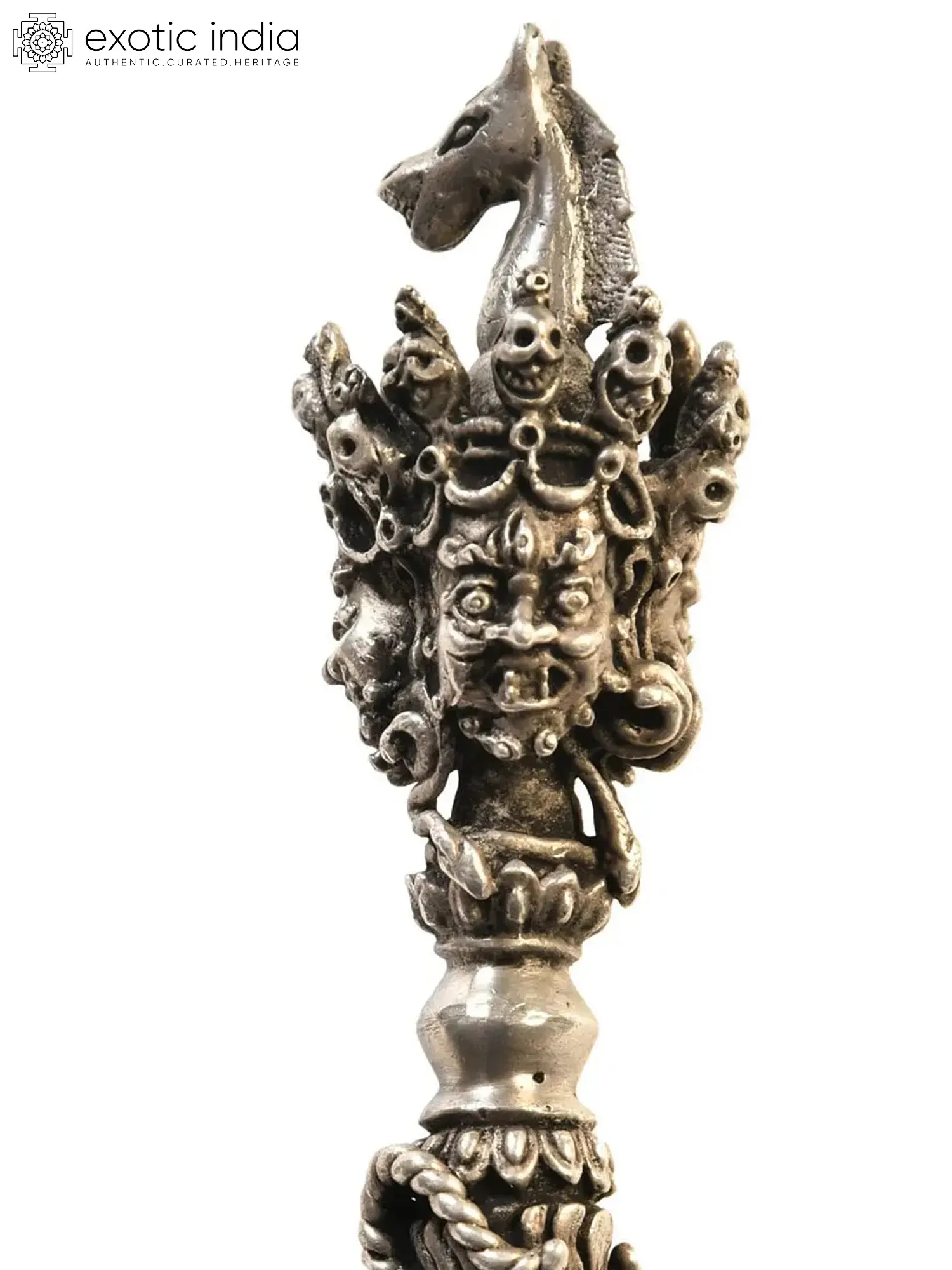 Hayagriva, the wrathful emanation of Avalokiteshvara in Buddhist culture is a potent deity, whose divine guarding forces are condensed in this exquisitely made copper Phurba or Phurpa from Nepal. Hayagriva literally means “the horse-necked one”, and the artist has used a horse head at the top of the Phurba to depict the deity’s association with this imagery. The handle of the Phurpa has heads of Hayagriva with awe-inspiring expressions placed on it, which extends into a dragon’s mouth, from which emerges the blade.