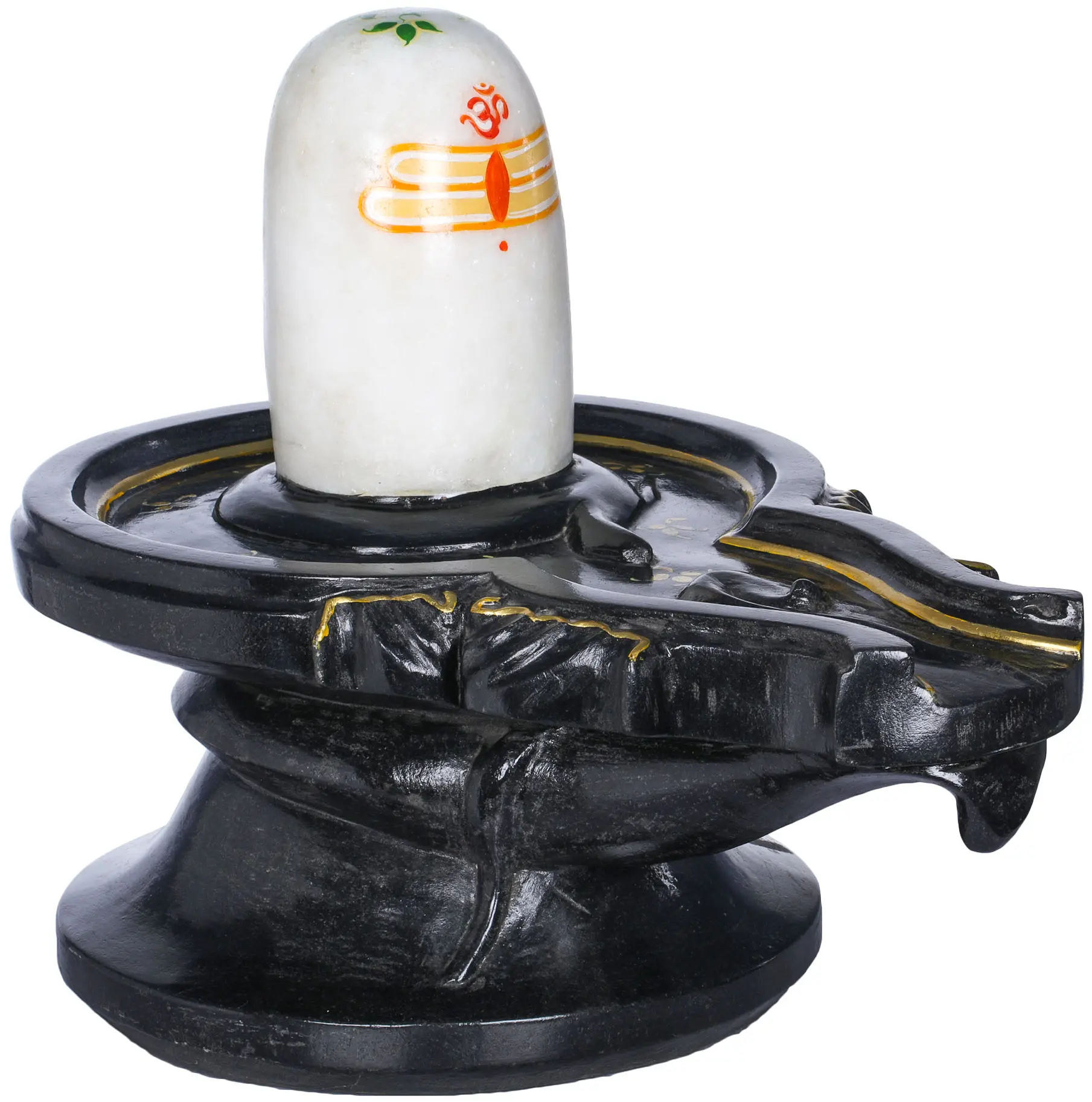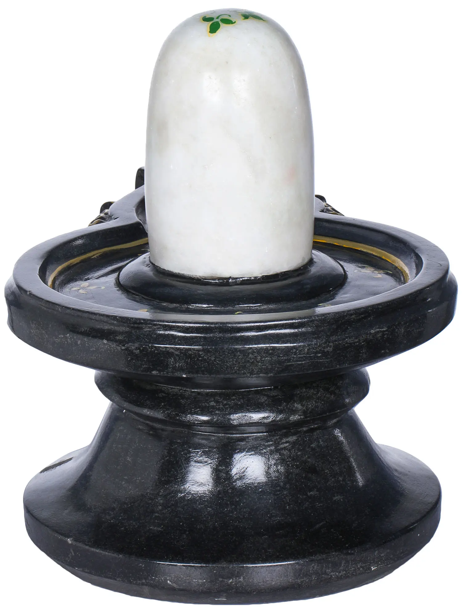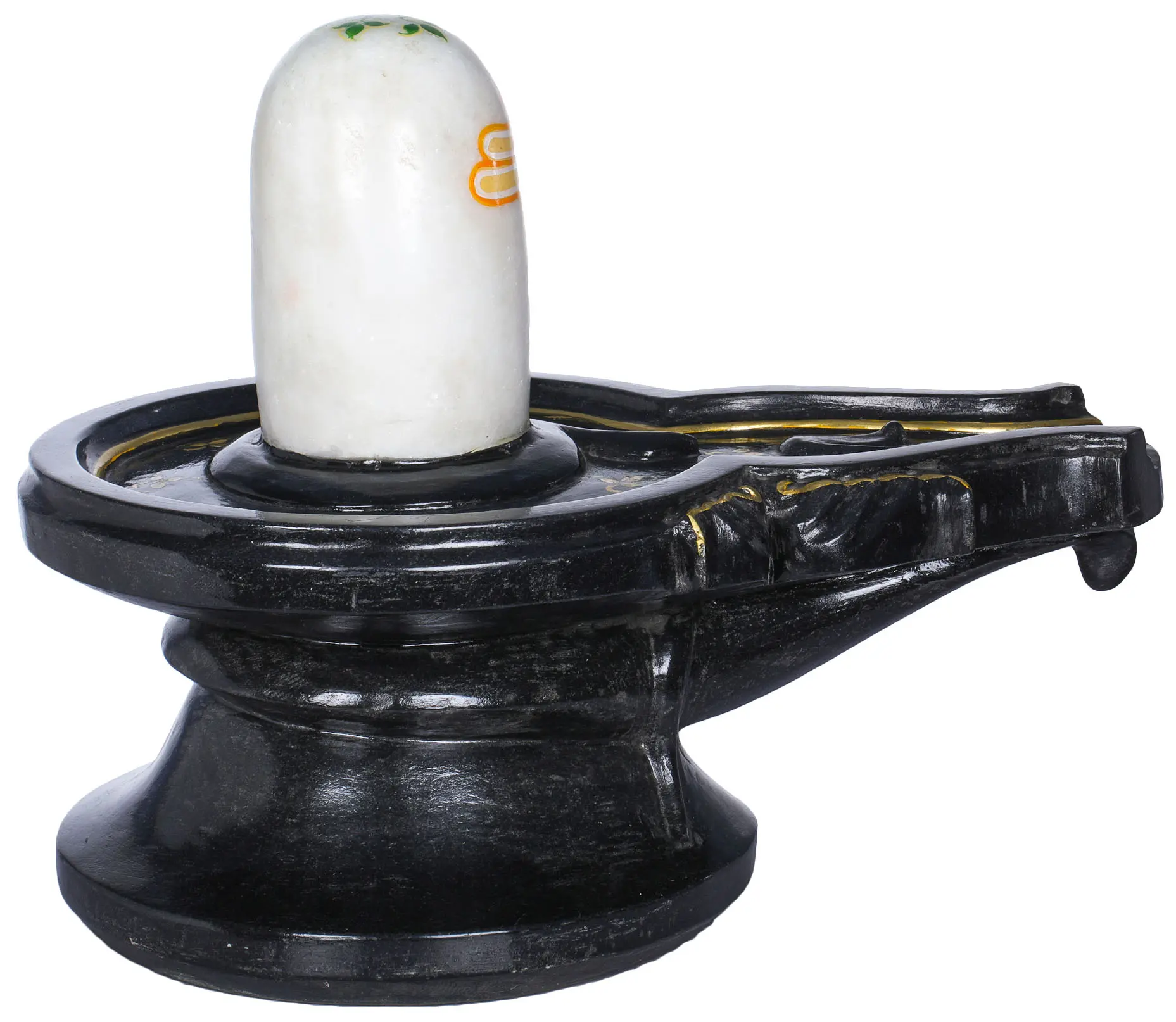The resplendent marble Linga rests upon a substantial and intricately carved black stone base. This dual-material composition creates a striking visual contrast, symbolizing the interplay of light and shadow, the manifest and the unmanifest aspects of reality. The deep, rich black of the base evokes the boundless void from which creation arises, while also representing the power and grounding presence of Lord Shiva. The base itself is a work of art, featuring elaborate carvings and motifs that draw inspiration from traditional Indian temple architecture and iconography. The raised, sculpted platform of the base is designed to elegantly cradle the Linga, providing stability and elevating it to a place of prominence. The flowing, organic lines of the carvings mimic natural forms, perhaps suggesting the coils of Vasuki, the king of serpents, who is often depicted adorning Lord Shiva's neck, representing his mastery over destructive forces and his ability to transcend all limitations. The subtle inclusion of gold accents along the edges and within the carved details adds a touch of regal splendor, signifying the divine glory and auspiciousness associated with Shiva worship. This entire presentation is not merely decorative; it serves as a tangible reminder of the profound cosmic dance that is existence, with Shiva as its eternal choreographer.