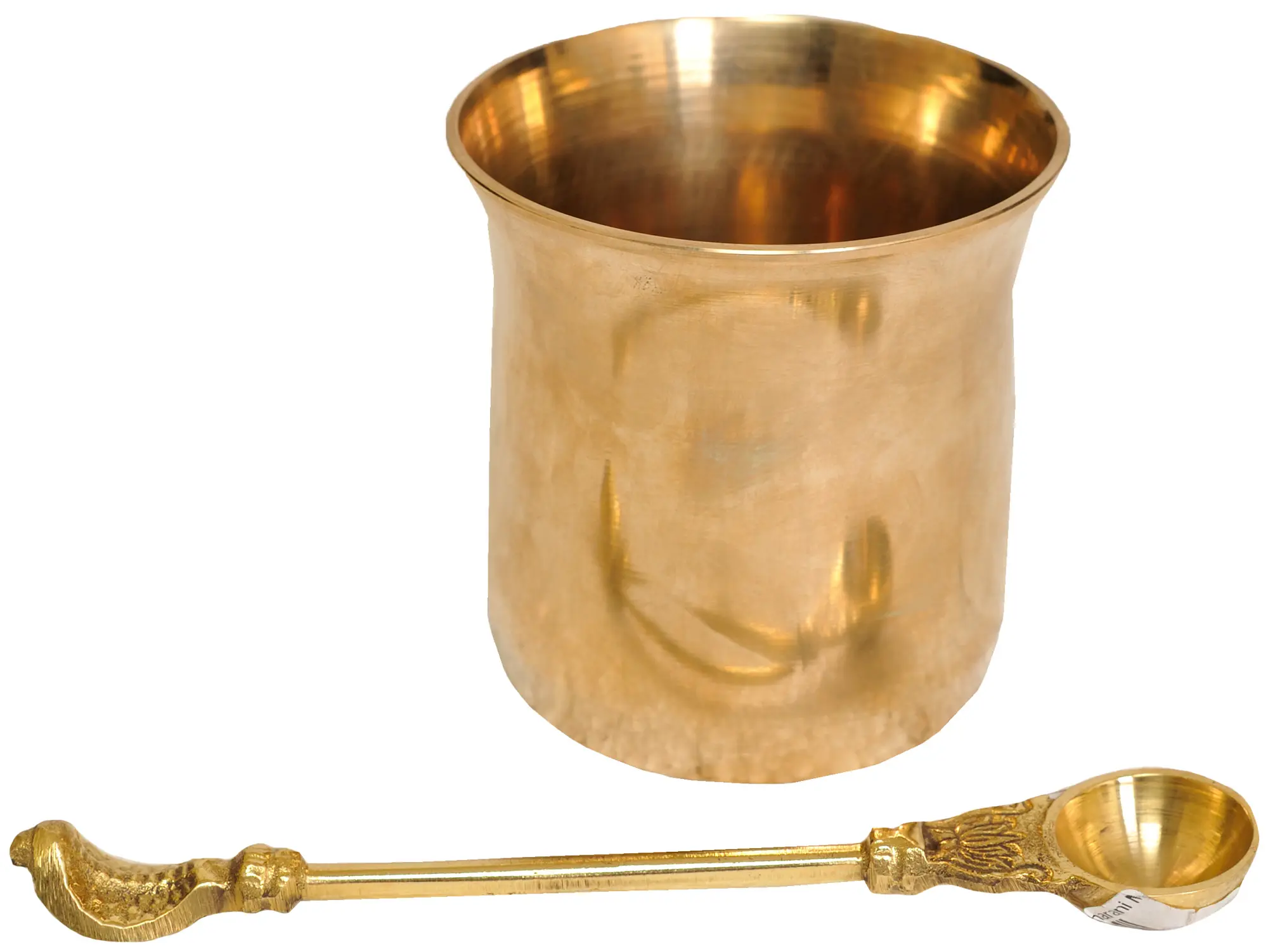 This Panchapatra with its serpent spoon is an ideal addition to any home altar or puja room. It can be used to perform daily rituals, offering prayers and pouring libations to deities, or it can simply serve as a beautiful and meaningful accent piece. Its compact size makes it versatile, fitting perfectly on shelves, mantels, or within dedicated spiritual corners. The enduring nature of bronze ensures that this piece will not only be a part of your present spiritual journey but can also be passed down as a cherished heirloom, connecting future generations to the rich tapestry of cultural and religious heritage. Embrace the sacred symbolism and the artisanal beauty of this exceptional bronze set, and invite a sense of peace and divine presence into your life.