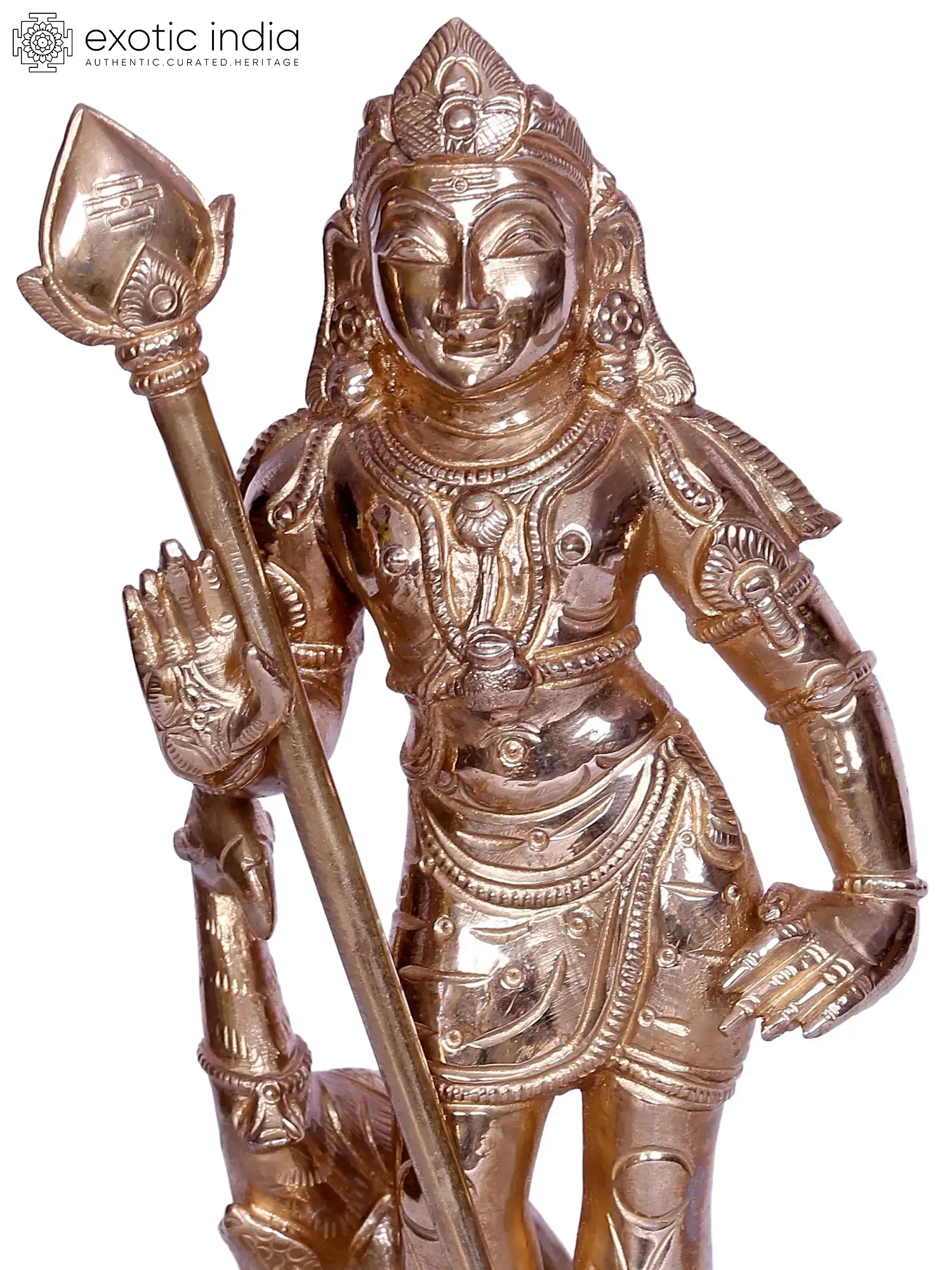 Bala Murugan, a celestial vision on a lotus pedestal, embodies divine grace and strength. Adorned in regal attire, Murugan, “also known as Skanda”, “the Son of Goddess Parvati and Lord Shiva”, wields the mighty Shakthi Vel (the spear), a symbol of supreme power. His right hand assures protection and courage with “Abhaya Mudra”, while his left beckons blessings. The peacock, his loyal mount, stands behind, a symbol of triumph over vanity. This ethereal form, crafted in bronze, signifies courage, wisdom, and the triumph of good over evil. Worshipping this form grants devotee’s courage, protection, and spiritual insight.