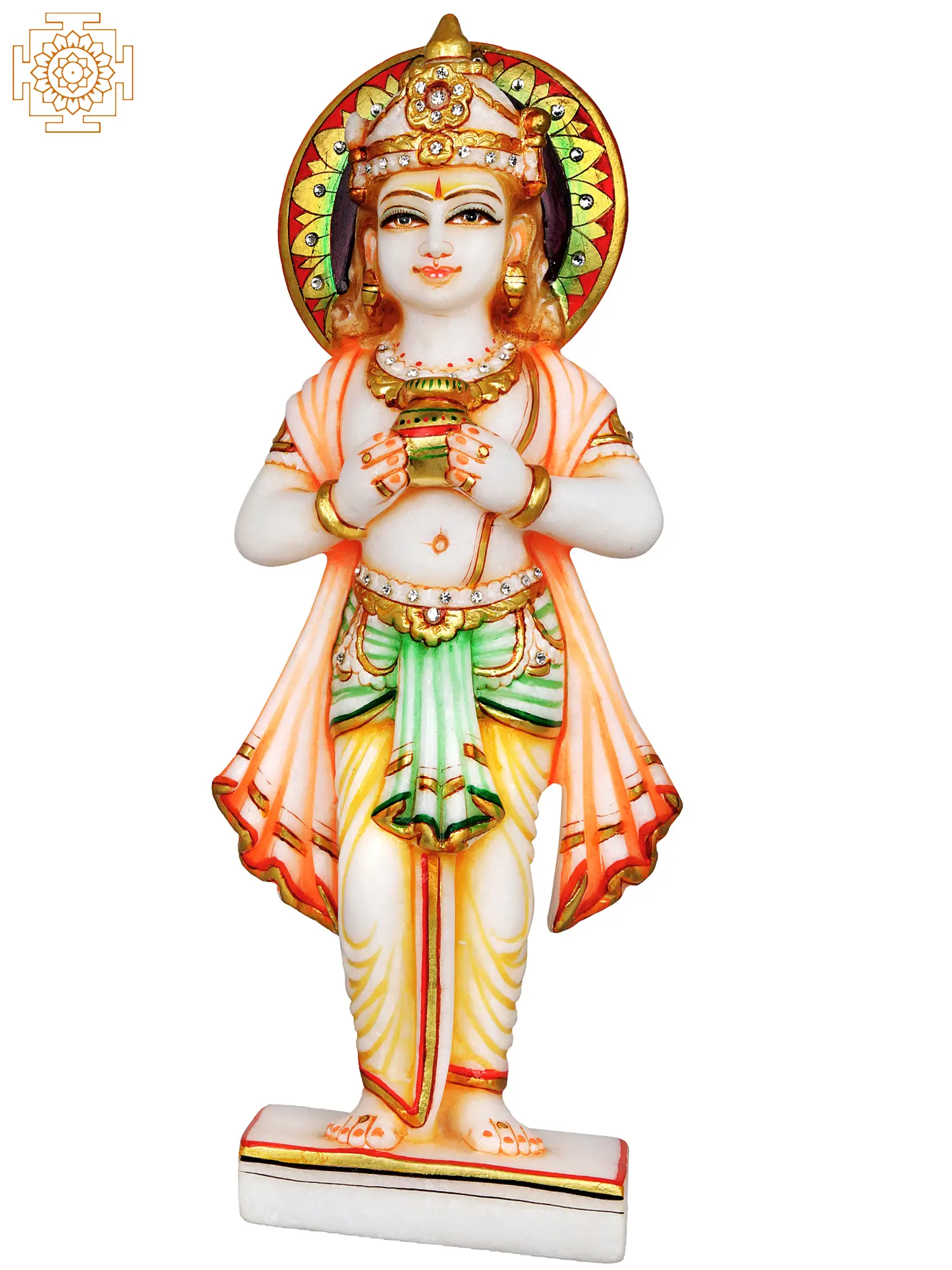Invite abundance and good fortune into your life with this exquisite white marble statue, a radiant representation of Lord Kubera, the Hindu deity of wealth and prosperity. Carved with meticulous detail, this piece captures the benevolent essence of the Yaksha king, who is revered as the treasurer of the gods and the guardian of treasures. The serene expression on Kubera's face, coupled with his regal attire, speaks of his divine status and his commitment to bestowing wealth upon his devotees.