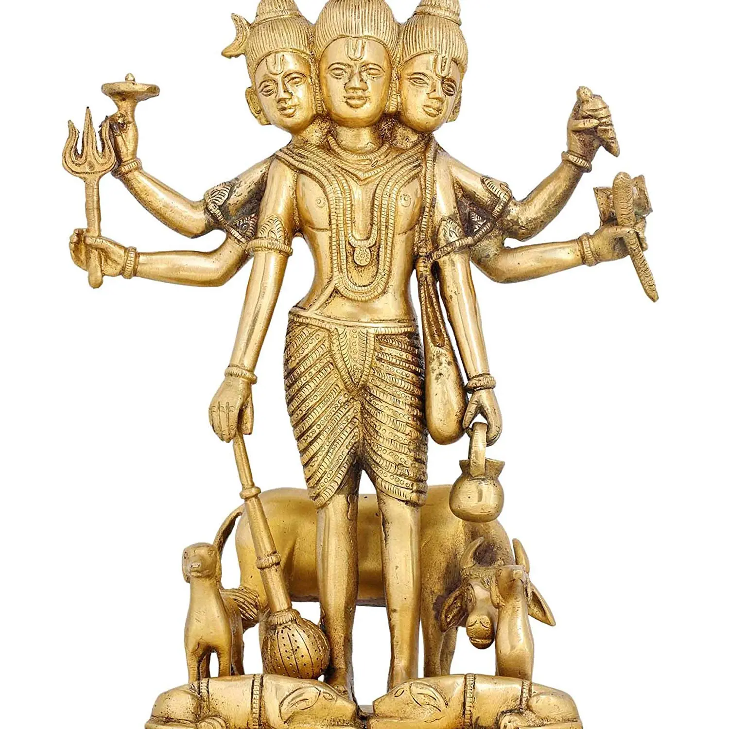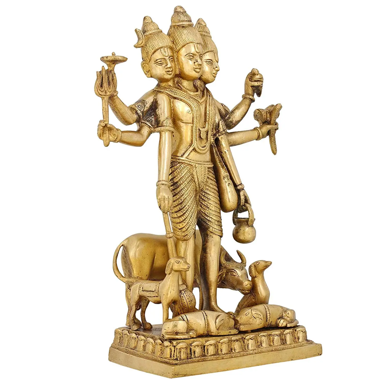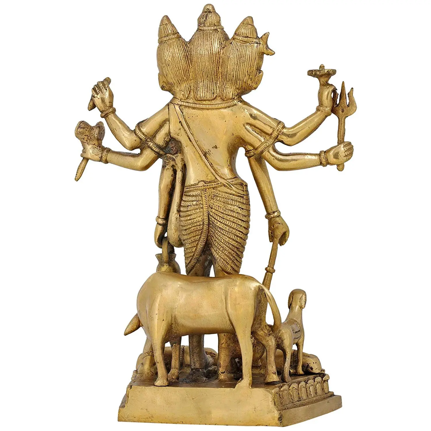 Each element within this sculpture is imbued with deep symbolic meaning. The trident (Trishula) held in one hand is a potent emblem of Shiva, representing the three gunas (qualities) of existence – Sattva, Rajas, and Tamas – and the power to overcome ignorance and negativity. The other attributes held in the various hands further elaborate the divine functions and qualities. For instance, a divine vessel might symbolize the nectar of immortality or the primordial waters of creation, while other objects could represent knowledge, power, or cosmic energy. The presence of a cow, often associated with Kamadhenu, the wish-fulfilling divine bovine, and a calf, signifies nourishment, abundance, and the nurturing aspect of the divine. The base itself, adorned with intricate carvings, likely represents the earthly realm or the cosmic foundation upon which the divine trinity presides.