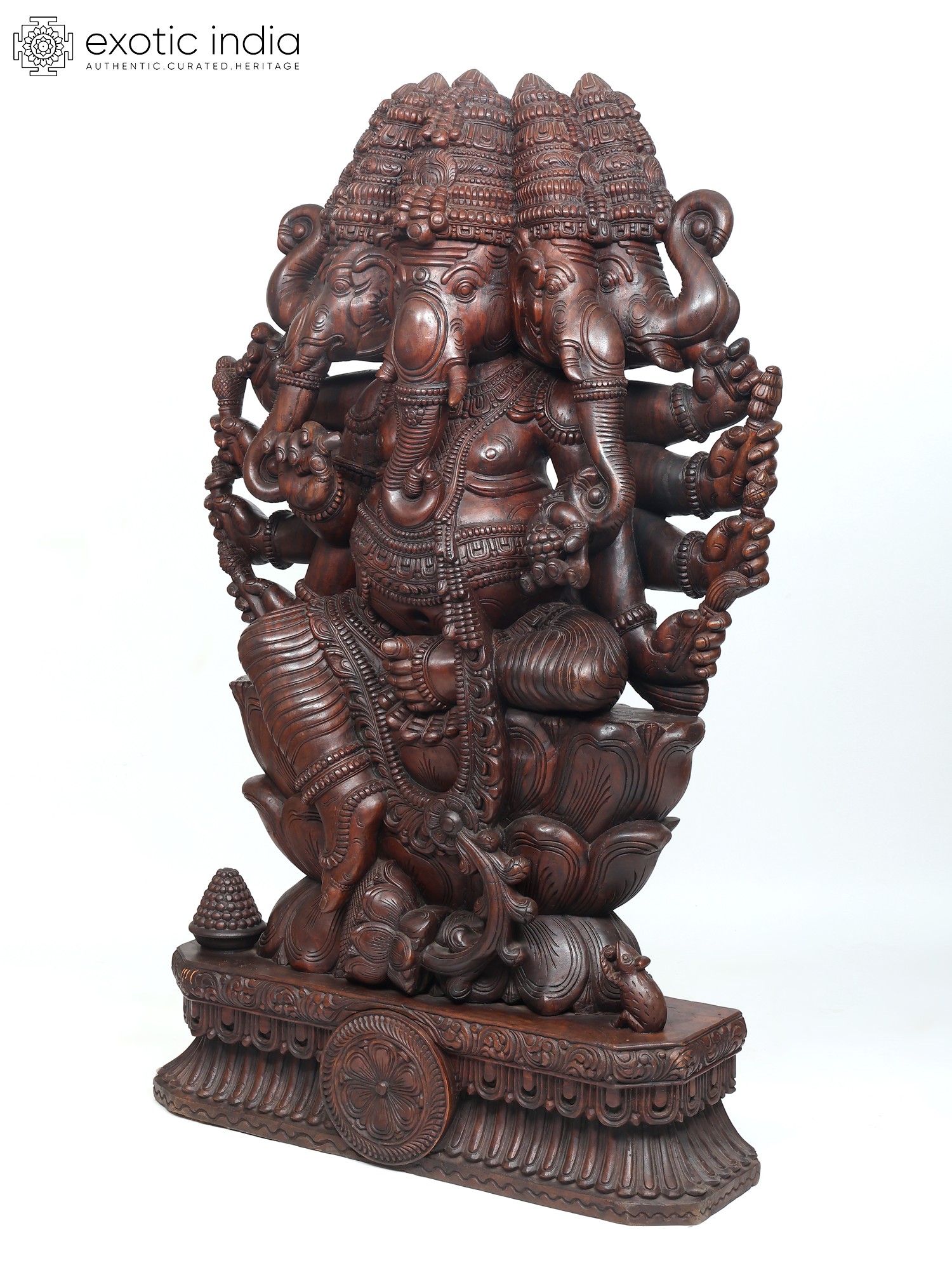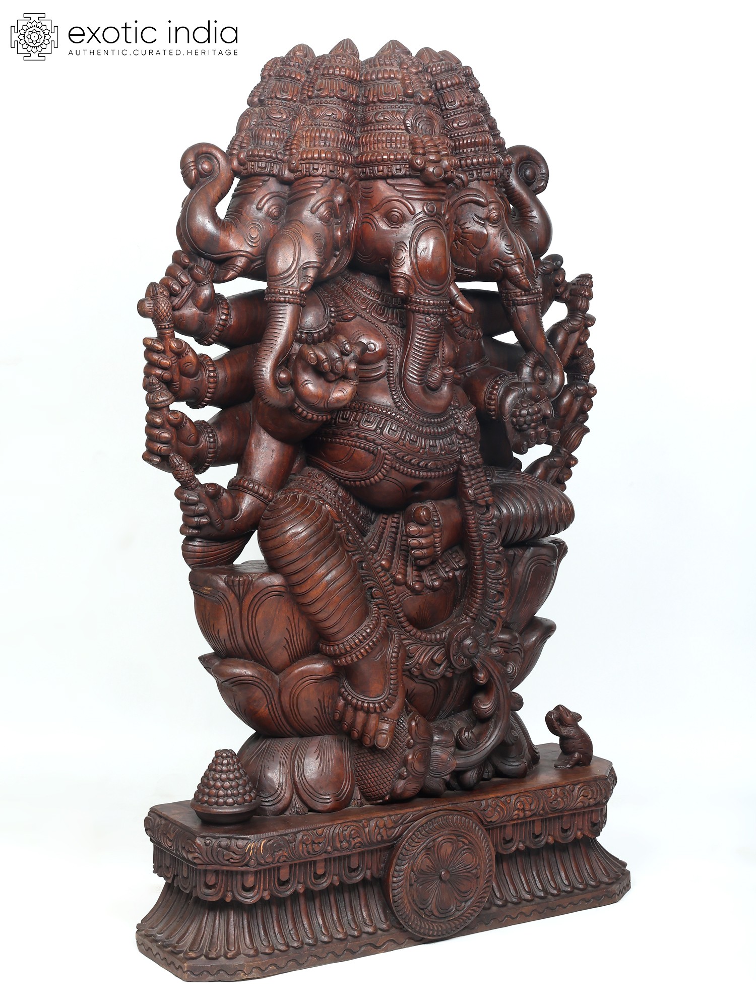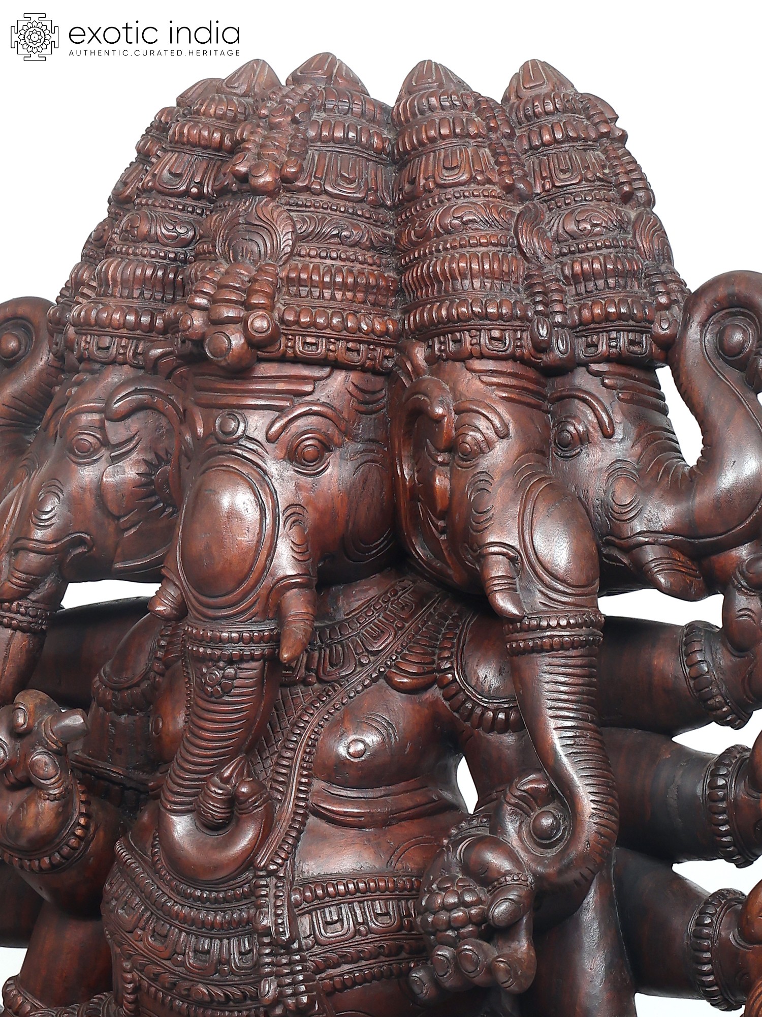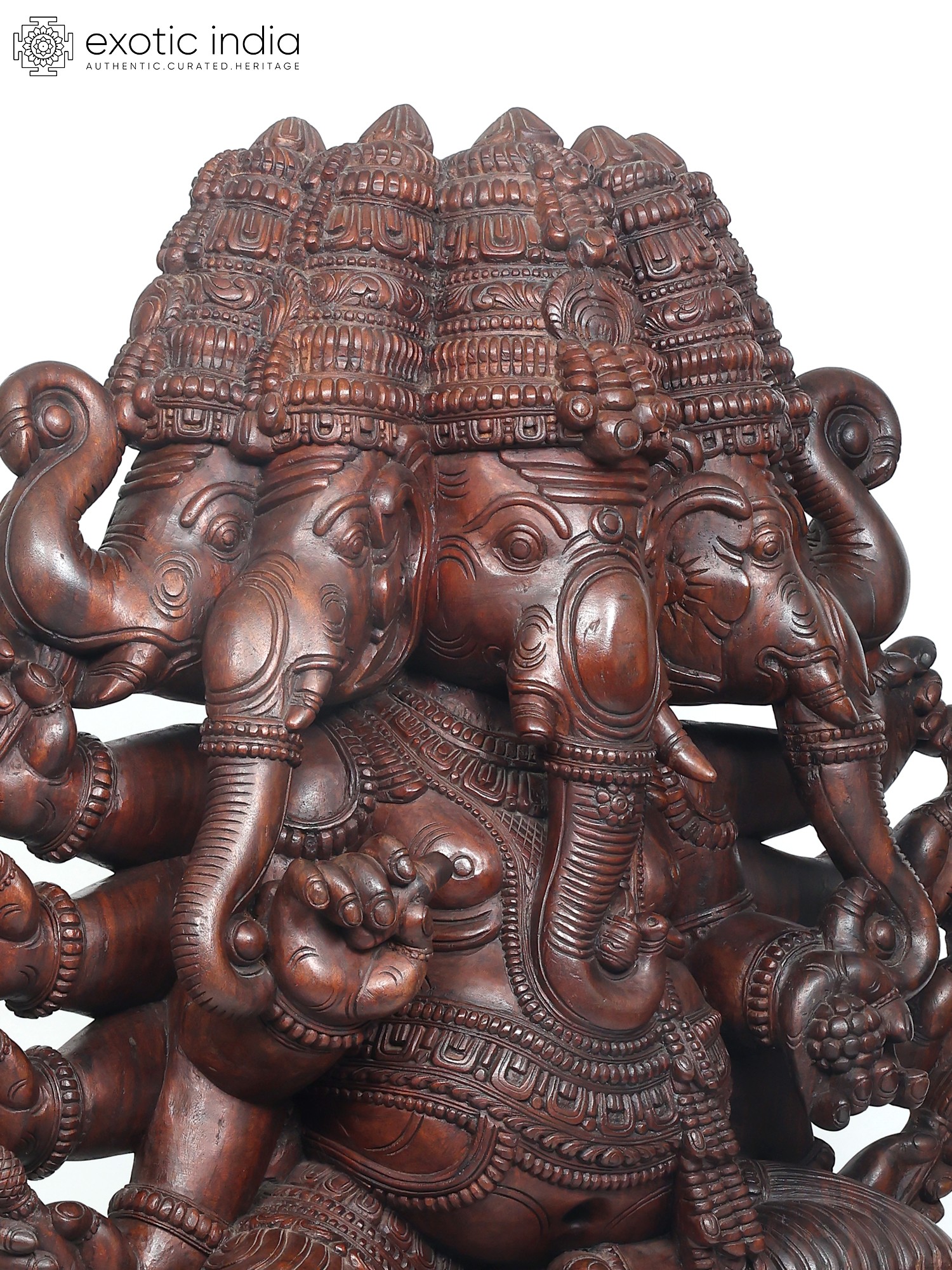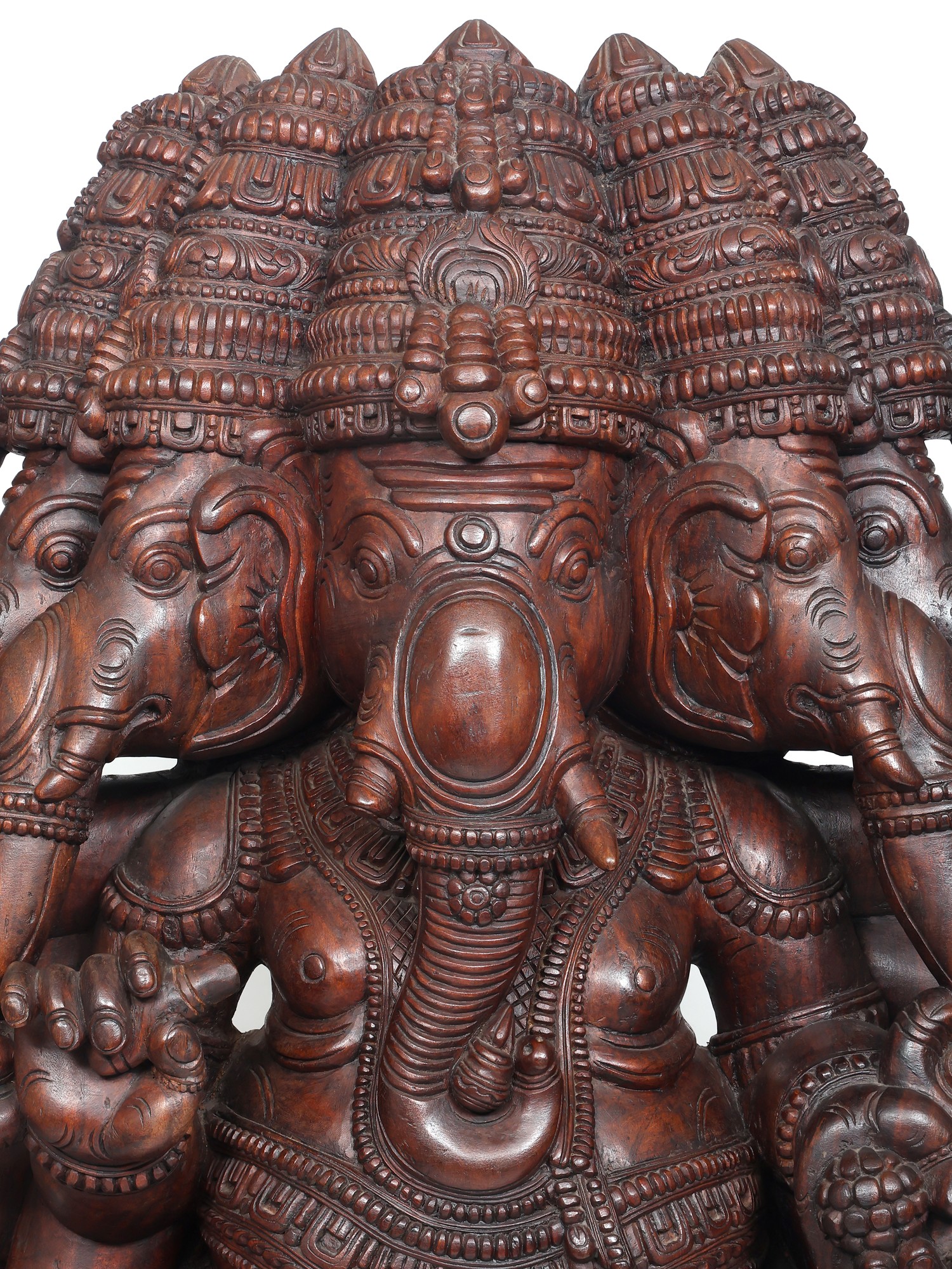 A six-foot magnificent wooden statue of Panchamukha Ganesha, this masterpiece is inspired by the art of ancient South Indian temples, where Ganesha forms an integral part of the sacred architecture as the foremost divinity and the protector of divine purity.