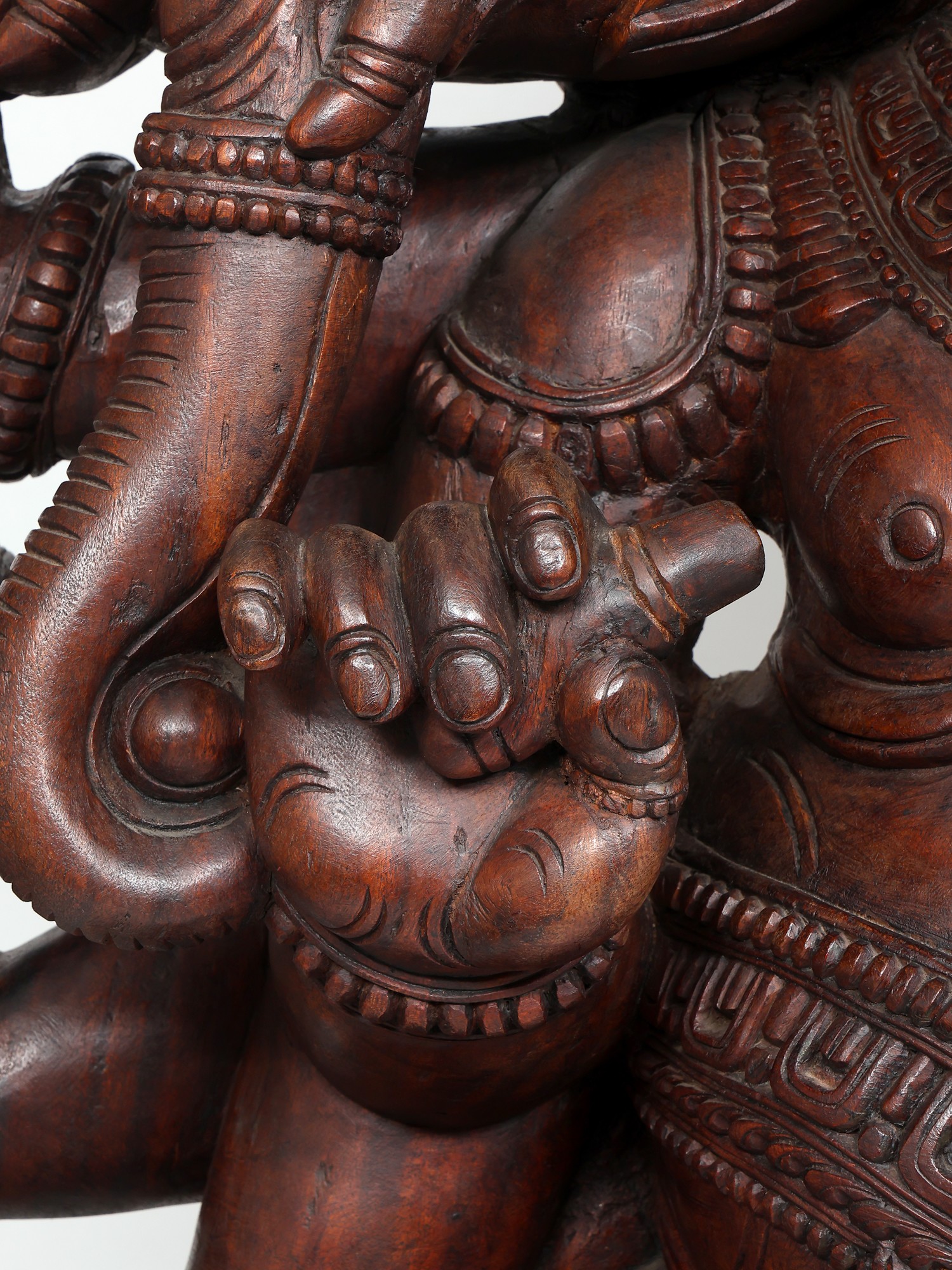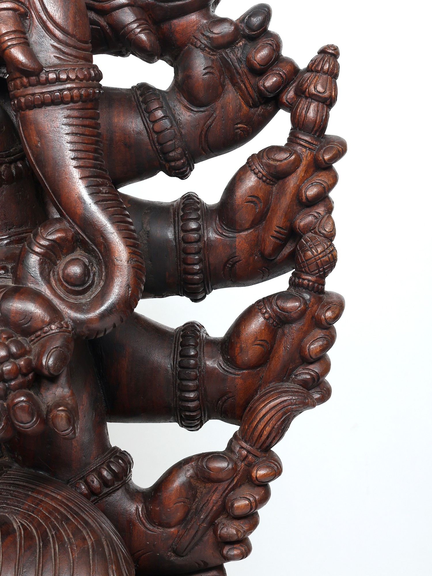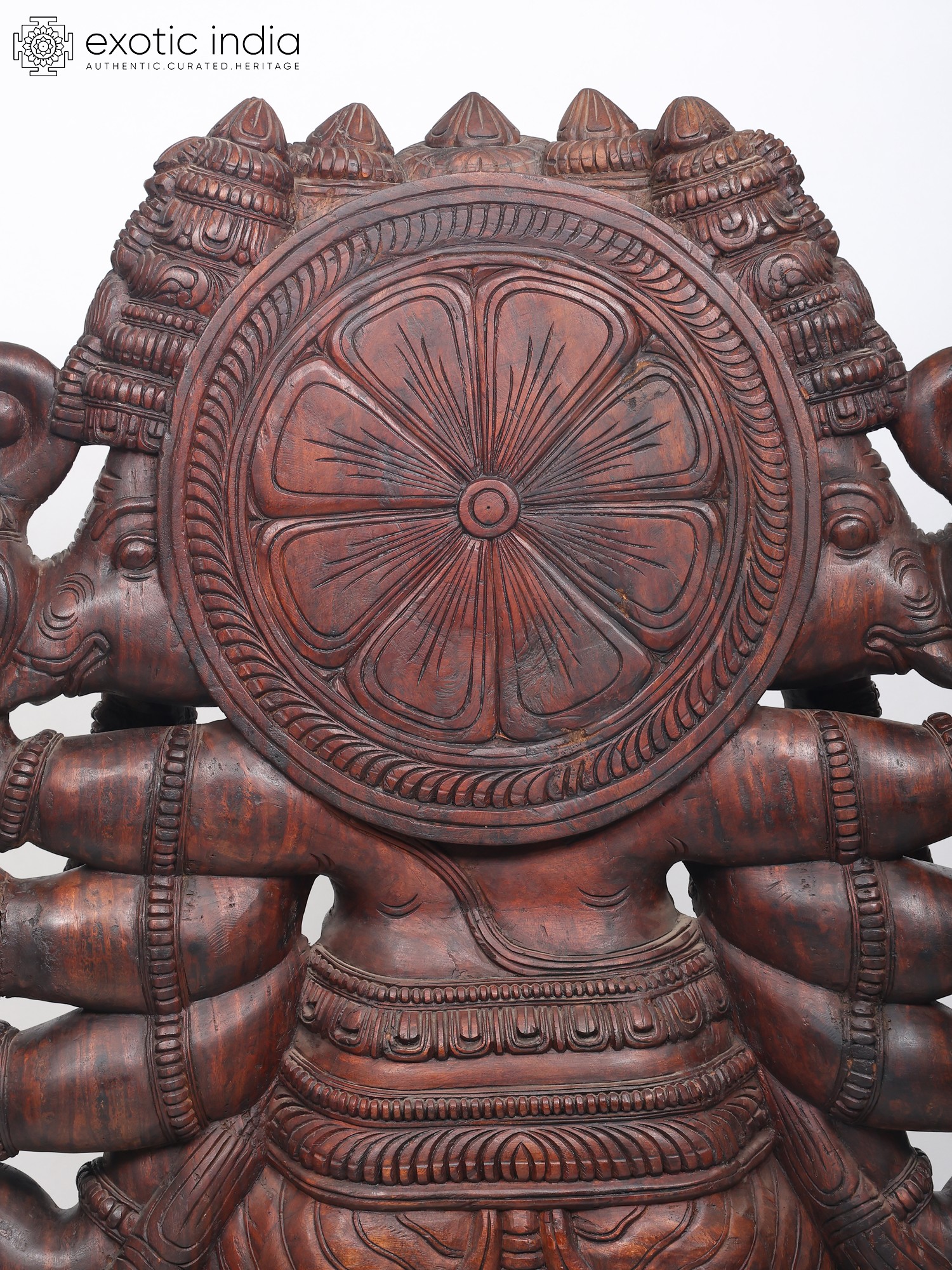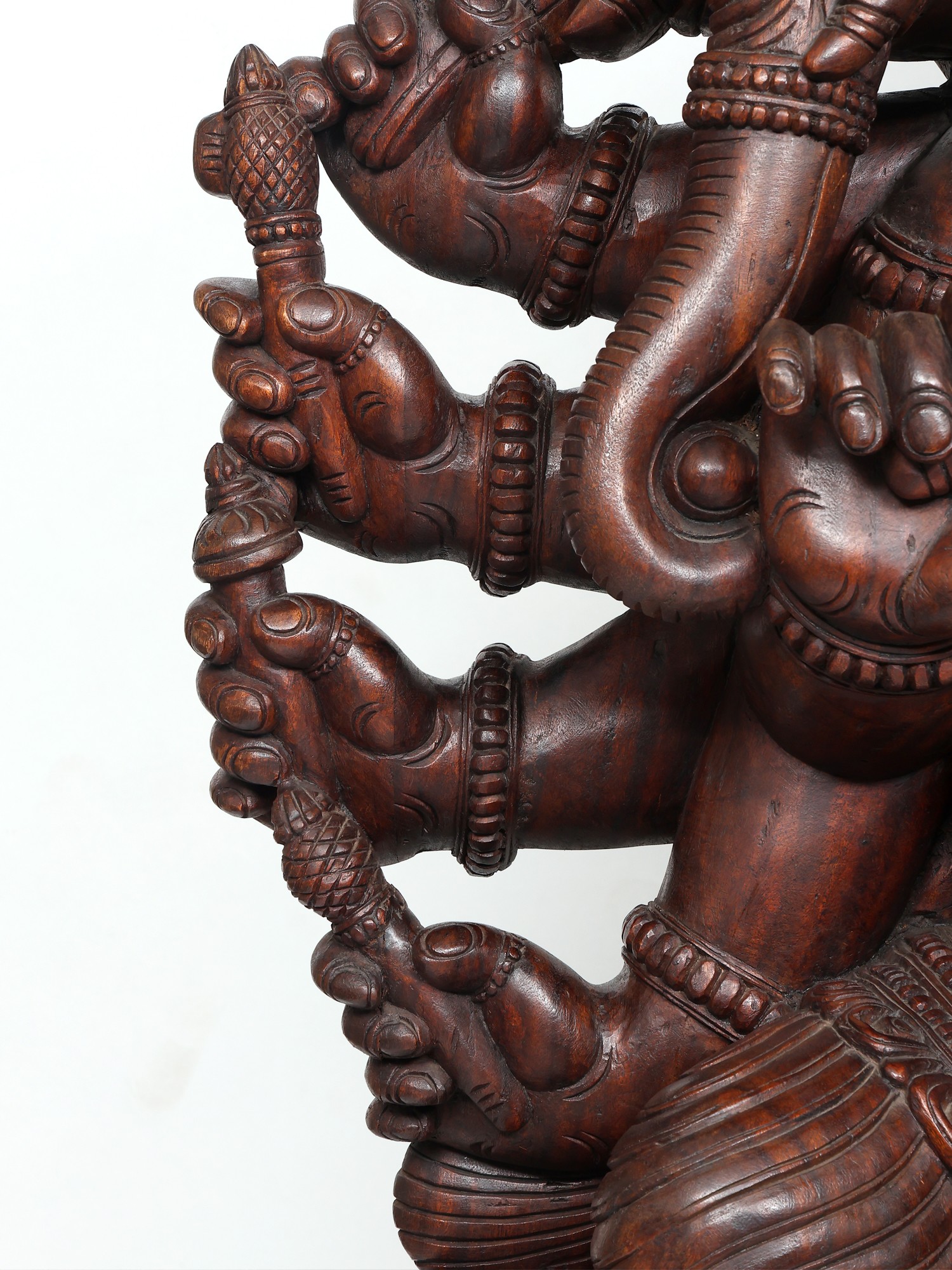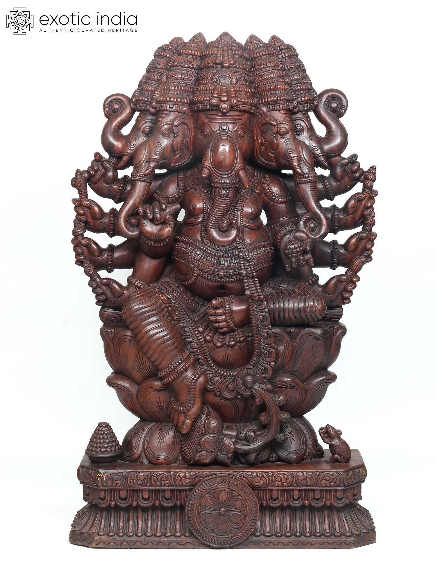 A six-foot magnificent wooden statue of Panchamukha Ganesha, this masterpiece is inspired by the art of ancient South Indian temples, where Ganesha forms an integral part of the sacred architecture as the foremost divinity and the protector of divine purity.