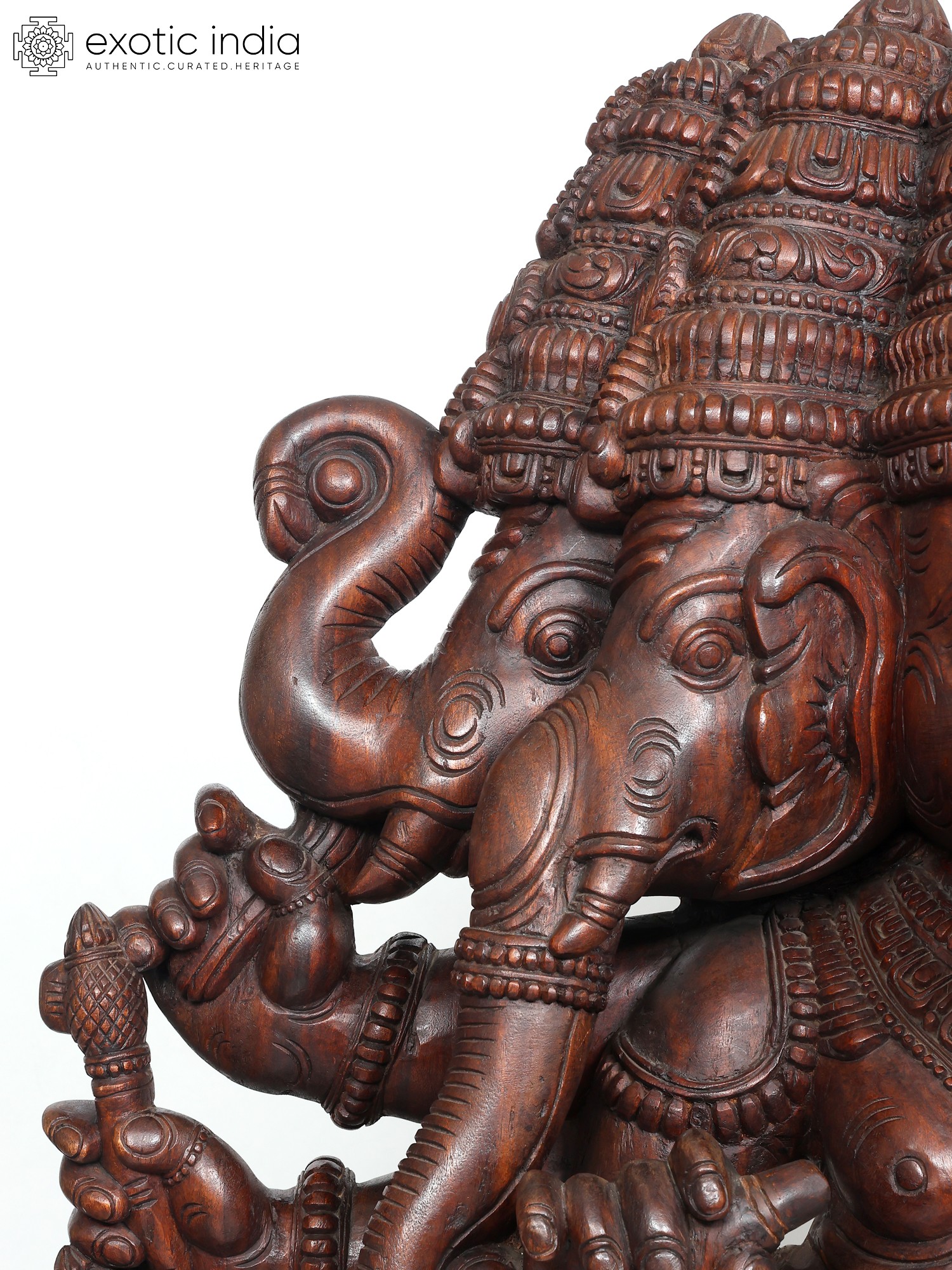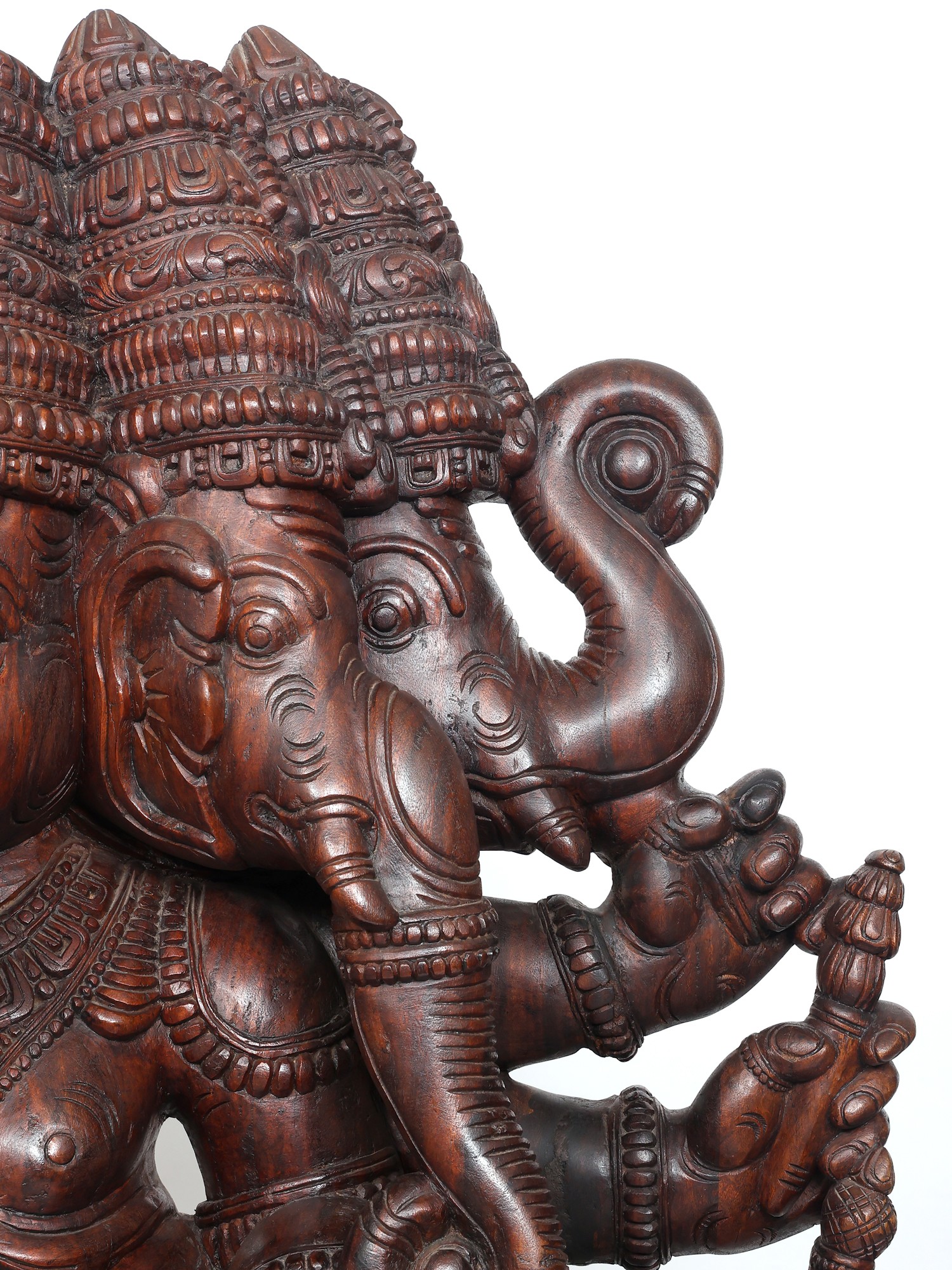 Delineated beautifully, the ornate mukuta (crowns) of Ganesha highlight the mammoth heads of the deity, each of which has eyes that pierce into the heart with a potent gaze, cleansing the devotee of any negative thought. The attire and ornaments of Sri Ganesha are carved exquisitely, highlighting the plump form of the elephant-headed god.