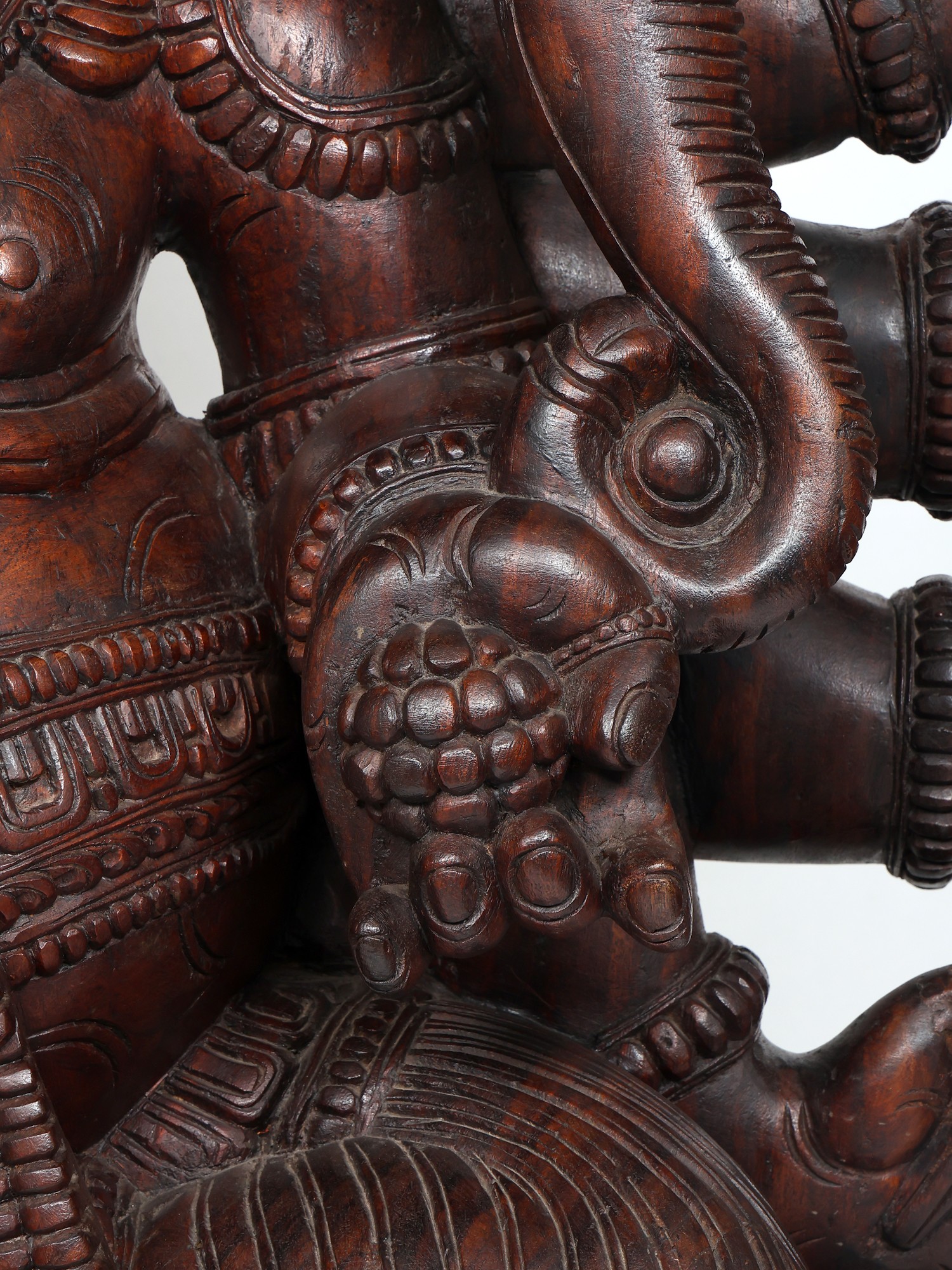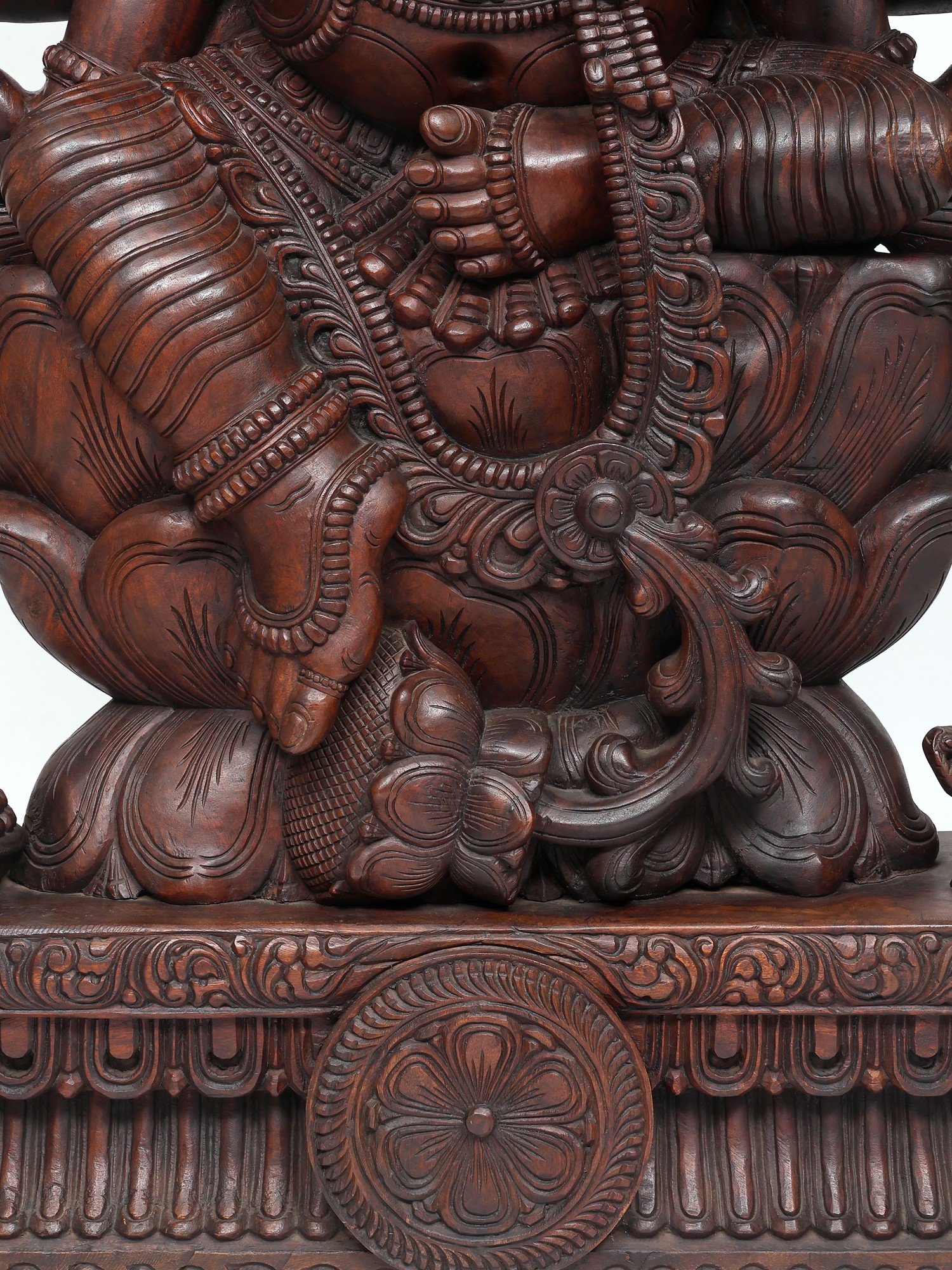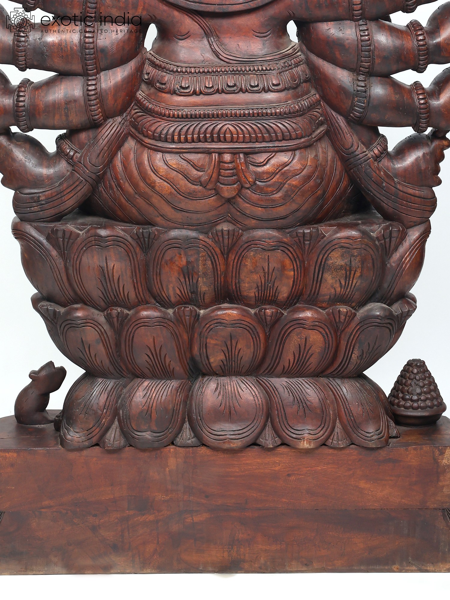 A connection between components can be marked in the lotus that spurts from the ornate chain of Mahaganapti, forming the footrest for his leg that dangles in Lalitasana. The two-layered Padmasana or lotus throne on which Sri Ganesha is seated represents the mind of the devotee, which blooms with an eternal fragrance as Ganesha comes to reside in it.
