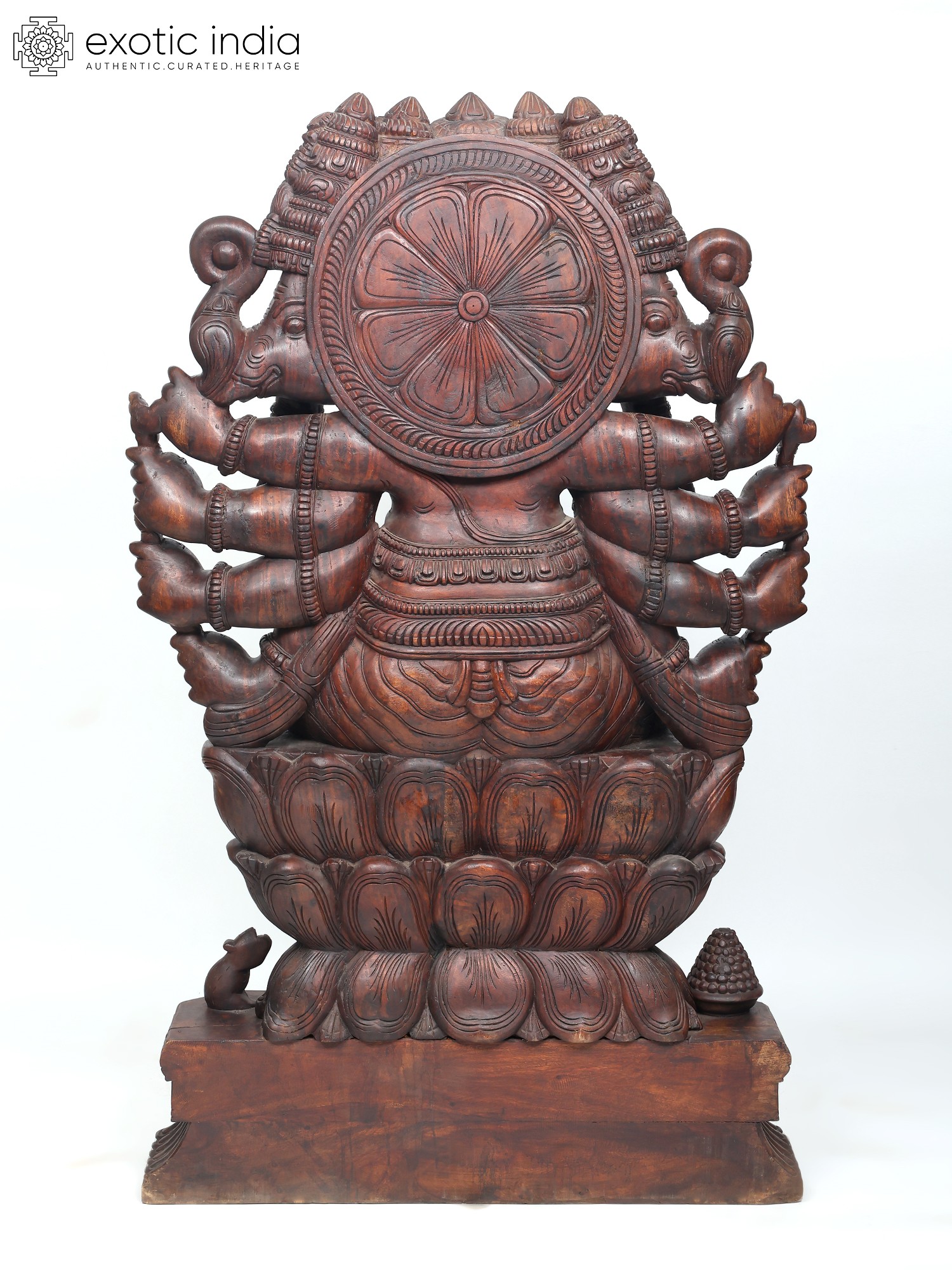 Carved meticulously, this gigantic wooden Ganesha statue is an imposing and powerful icon, filled with the potencies of Panchamukha Mahaganapati (ten-armed Ganesha).