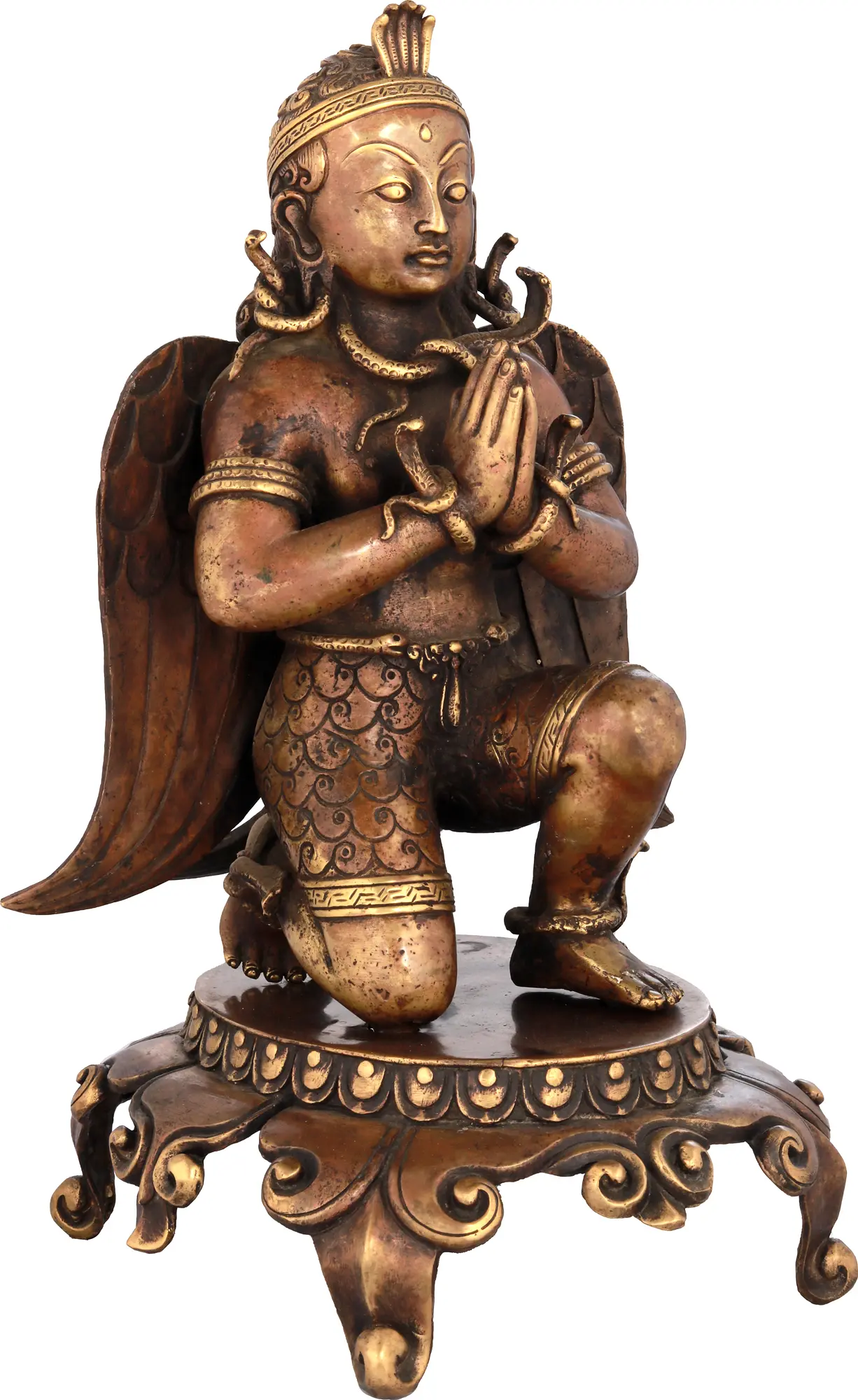 This exquisite brass statue, meticulously crafted in Nepal, captures the divine form of Garuda, the celestial Vahana, or mount, of Lord Vishnu. Garuda, revered as the king of birds, is a powerful and benevolent deity in Hindu mythology, known for his immense strength, speed, and unwavering loyalty. His presence is a symbol of victory over evil, protection, and swift justice. The depiction of Garuda in a posture of humble reverence, with hands pressed together in Anjali Mudra, is particularly profound. This gesture, commonly seen in prayer and salutation, reveals a spiritual depth that complements his formidable might. It speaks to the universal truth that even the most powerful beings can express deep devotion and surrender. The snakes coiled around his neck and arms, while seemingly contradictory to his role as a slayer of serpents, symbolize his mastery over primal forces and his ability to transcend them. In many tales, Garuda is not merely an enemy of Nagas, but also their conqueror and protector against their malevolent influences.