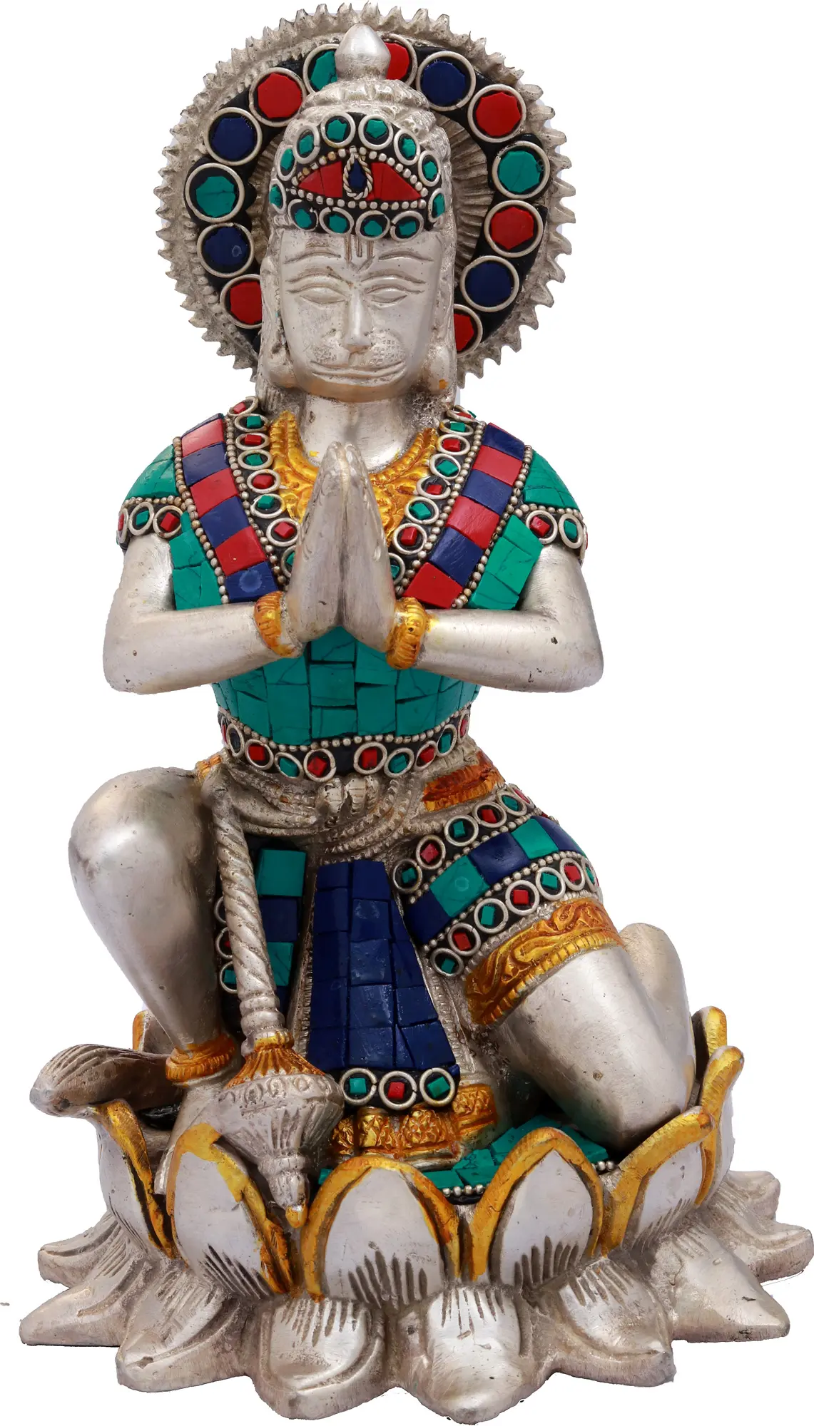 Hanuman, often referred to as the son of the wind god Vayu, is a central figure in the epic Ramayana. His exploits are legendary, from leaping across the ocean to Lanka in search of Sita, to single-handedly carrying a mountain laden with medicinal herbs. He is revered not only for his immense power and courage but also for his intellect, his ability to change form, and his selfless service. This statue, with its detailed embellishments, reflects his noble character and divine aura. The vibrant inlaid stones, reminiscent of precious jewels, speak to his elevated status and the sanctity associated with him. The rich color palette of blues, greens, and reds further enhances the visual appeal, symbolizing various facets of divine energy and cosmic harmony.