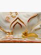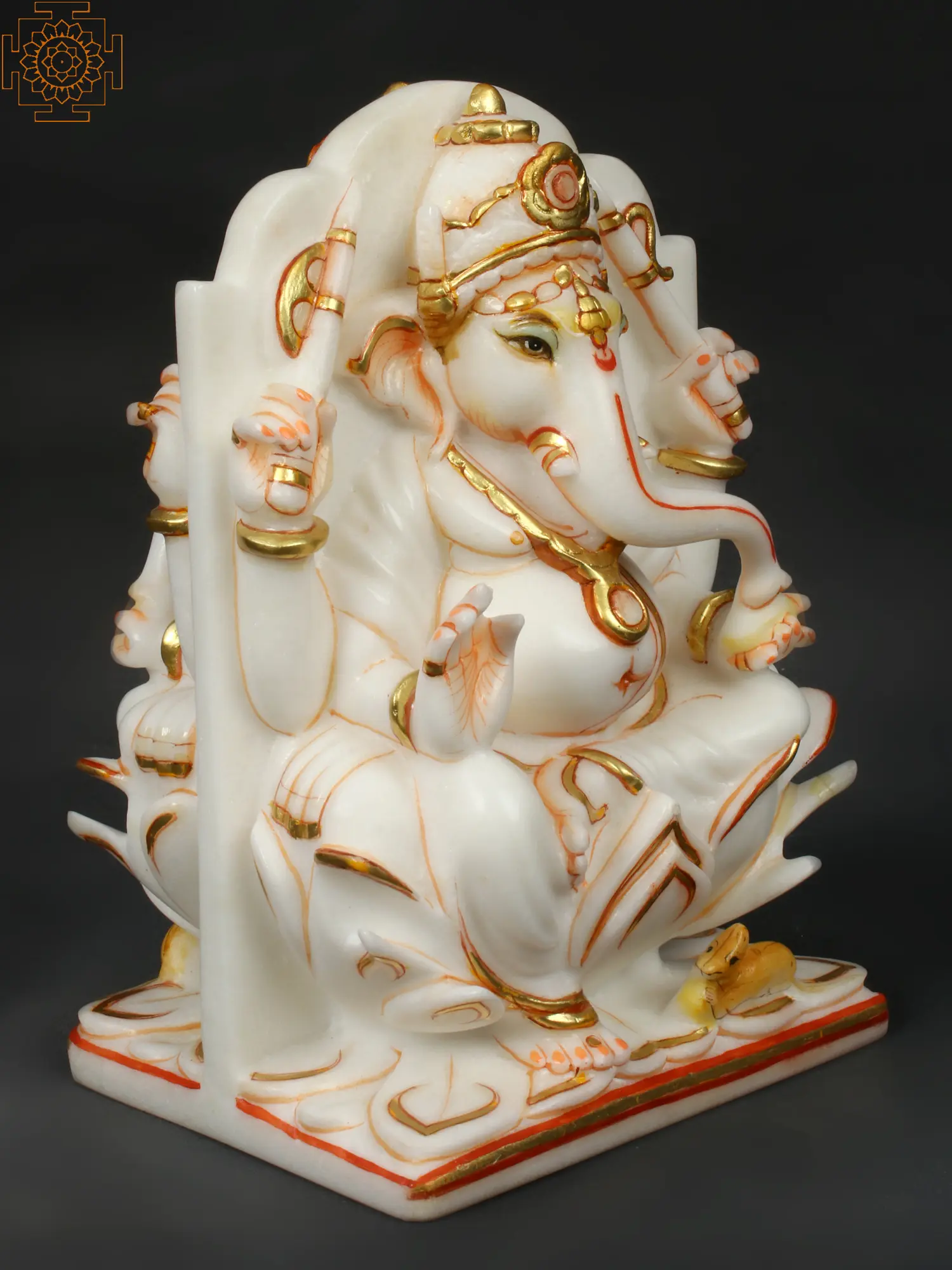 Crafted from pure white marble, this statue embodies a timeless elegance. The intricate carving extends to every detail, from the delicate lines of his attire to the gentle curve of his posture. The inclusion of gold leaf not only adds a touch of opulence but also symbolizes the divine radiance and sacredness associated with Lord Ganesha. The presence of his vahana, the mouse, at his feet, represents his mastery over desires and the ability to control even the smallest of urges. This finely detailed representation of Lord Ganesha is more than just a decorative piece; it is a spiritual conduit, a symbol of devotion, and a source of inspiration. Its presence can transform any environment into a sanctuary of peace and positive energy, making it a perfect centerpiece for your prayer room, living space, or office.