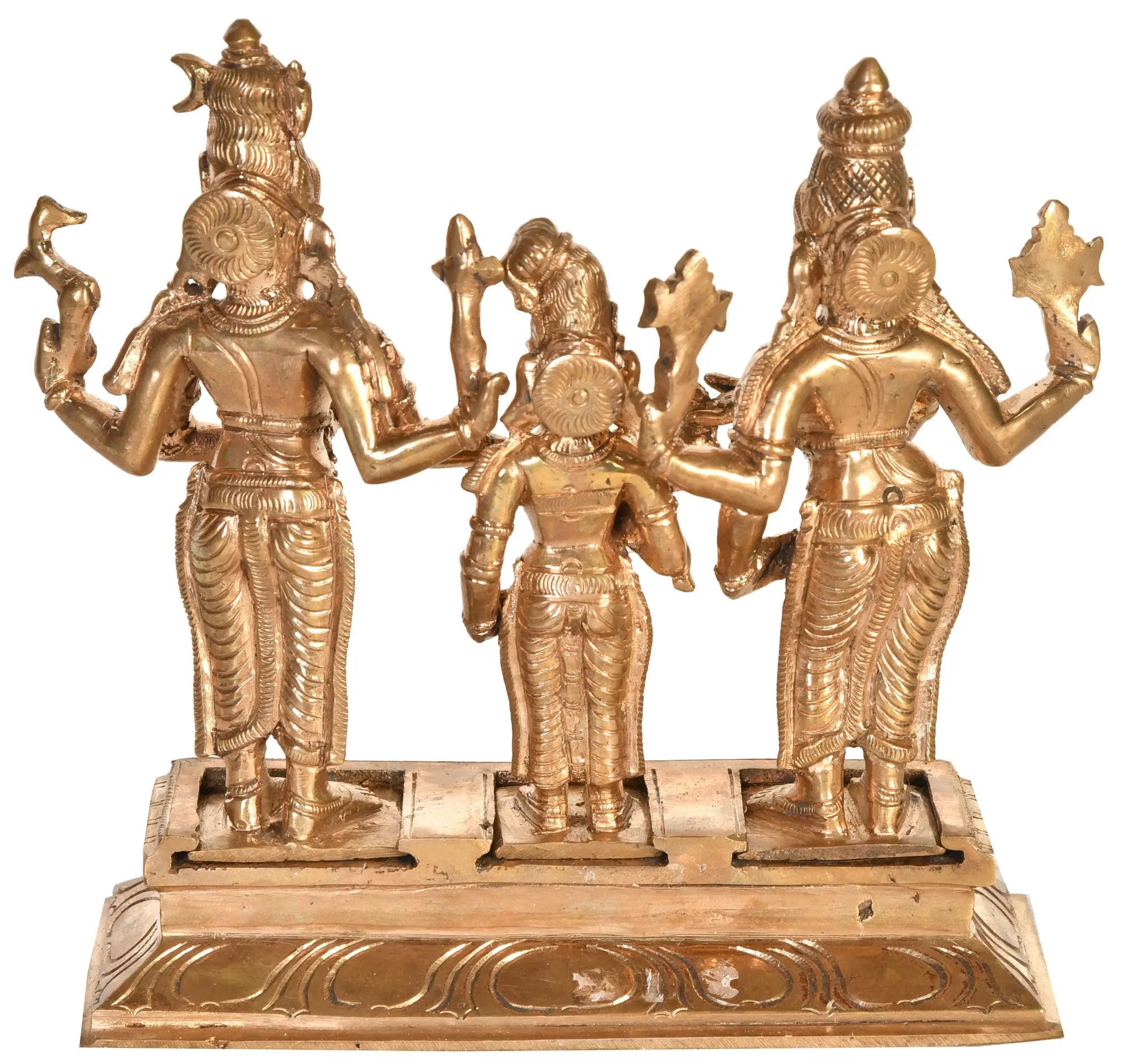 Several Chola age inscriptions refer to bronze images of Kalyana-Sundara-Murti. Lord Shiva is shown holding Uma’s right hand in his own right palm, an act called pani-grahana, or taking the hand. This signifies the actual act of accepting the wife. Bhagawan Vishnu performs the kanya-dana, gifting of the girl in his capacity as Devi Parvati’s brother. He is shown pouring water from a pitcher onto the couple’s hands, thus granting the ceremony formal sacrality.