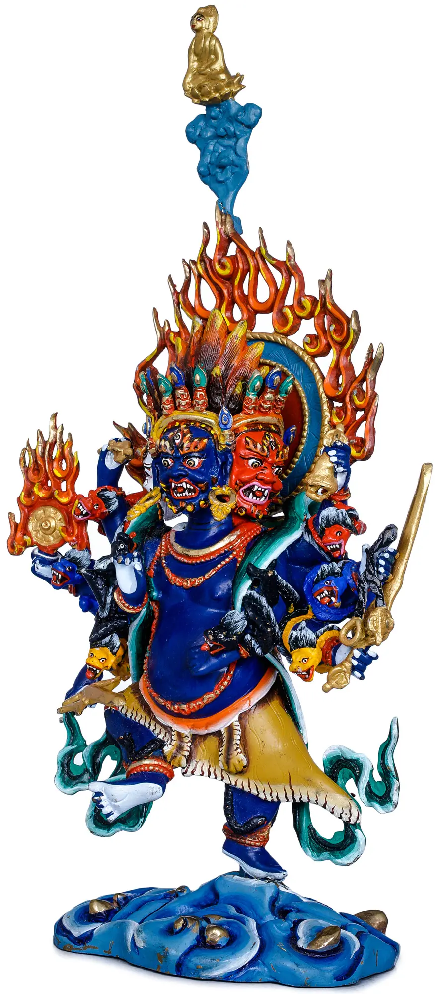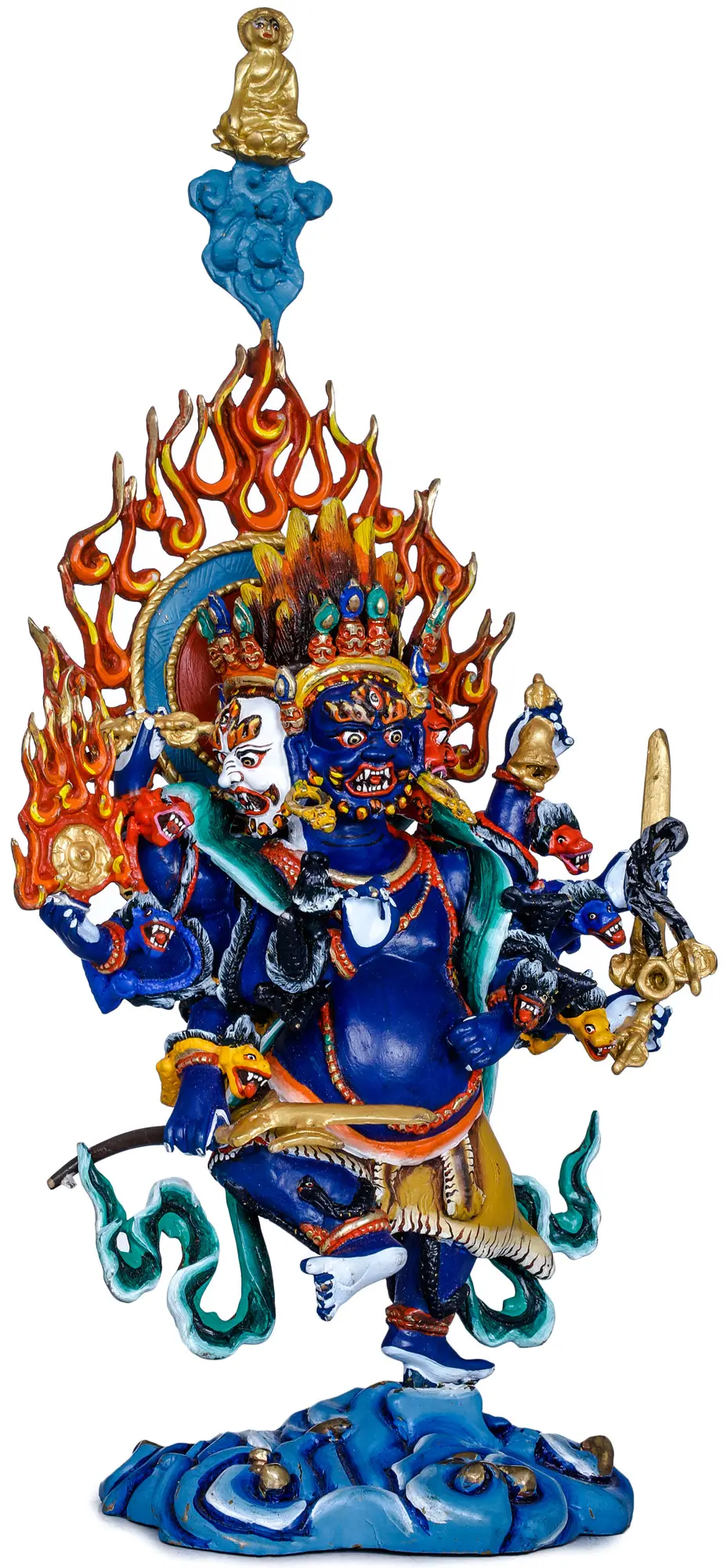 His skin is the colour of deep, temperate dusk with undertones of black, a shade symbolic of His all-encompassing quality. The vibrant tigerskin loincloth, together with the gold and red of His jewels, sets off that signature complexion. Multi-headed and multi-armed, each of the arms of Lord Mahakala has spewed its own head. No matter the number of heads that belong to this Buddhist deity, they all bear a composure of spine-chilling ruthlessness. The kind that has no mercy for adharma - a determined angle of the neck, large protruding eyes, and invincible blood-lipped jaws.