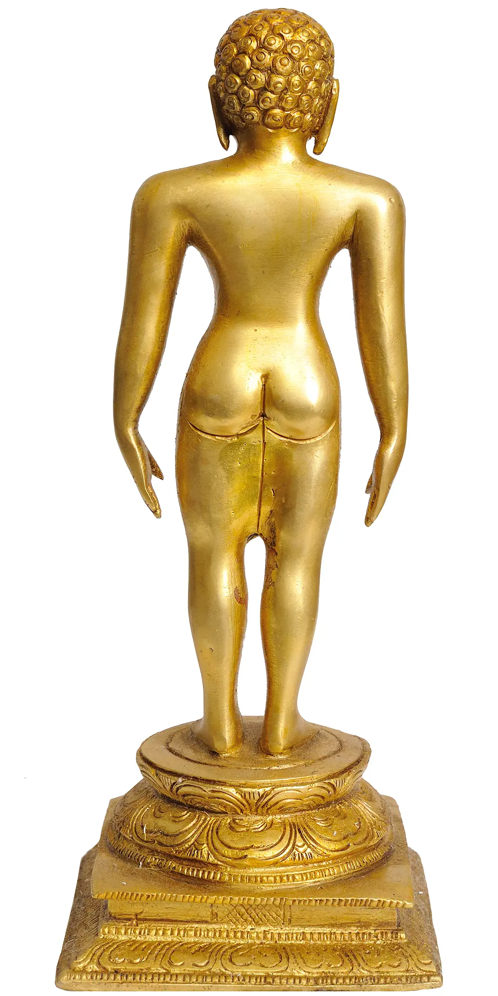 The flawless form of the Tirthankara symbolizes the purity and detachment from worldly desires that are central tenets of Jain philosophy. The unclothed nature of the figure represents complete renunciation, a state of being free from all material attachments and illusions. This stark portrayal emphasizes the spiritual journey towards omniscience and liberation, where the physical body is merely a vessel for the soul's ultimate transcendence. The gold-like sheen of the brass further enhances this divine aura, signifying prosperity, purity, and spiritual radiance. The detailed, multi-tiered pedestal upon which the figure stands adds to the monumentality of the piece. Intricately carved floral motifs and geometric patterns adorn the base, symbolizing the blooming of spiritual understanding and the orderly structure of the cosmos. This ornate base contrasts beautifully with the simple, unadorned body of the Tirthankara, highlighting the focus on inner divinity rather than external adornments.