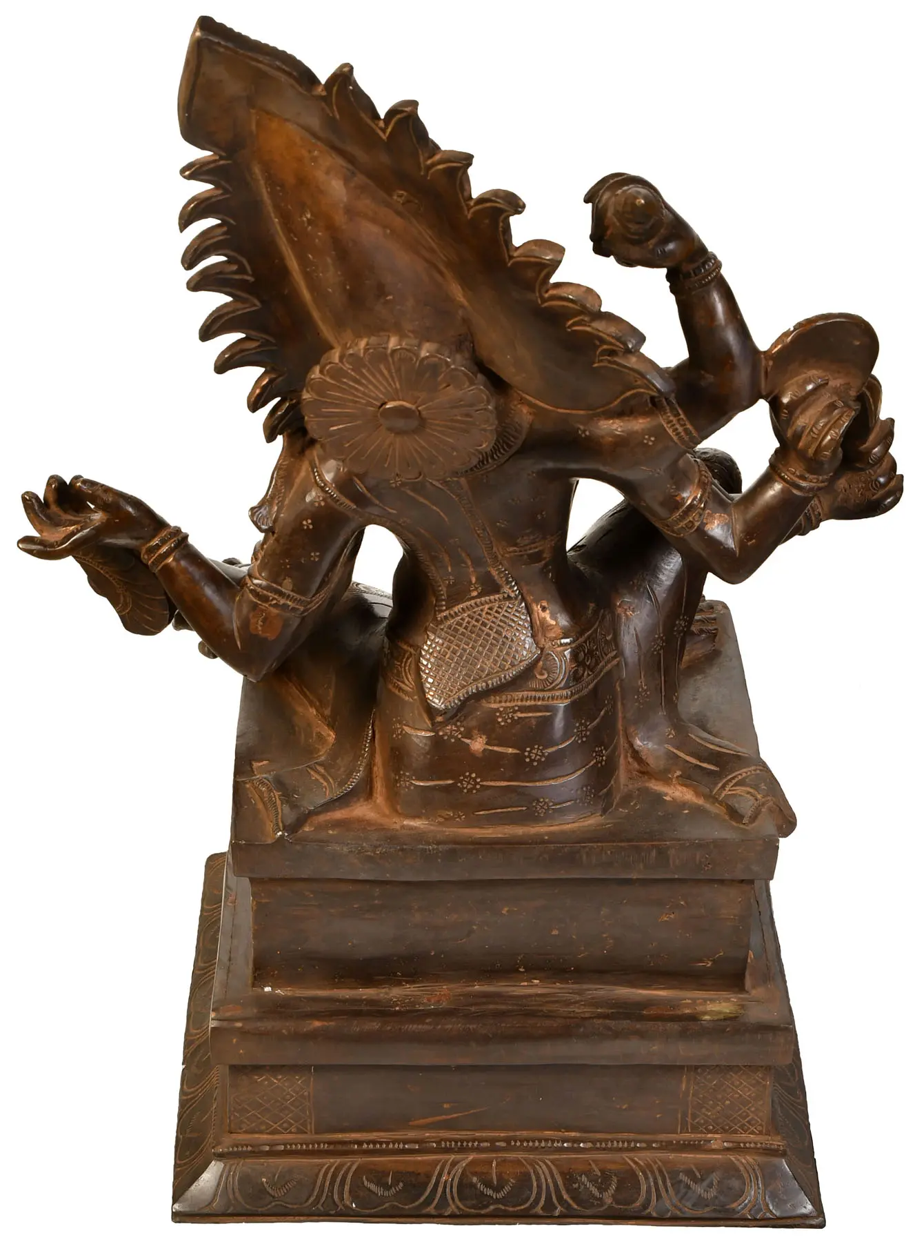 This exquisite bronze statue captures the formidable presence of a powerful Hindu goddess, believed to be an embodiment of Jwala Devi, the goddess of flame. Hailing from the renowned bronze-casting tradition of Swamimalai in South India, this piece is a testament to centuries-old craftsmanship and deep spiritual reverence. The artist's mastery is evident in the intricate details, from the flowing drapery of the goddess's attire to the fierce yet benevolent expression on her face.