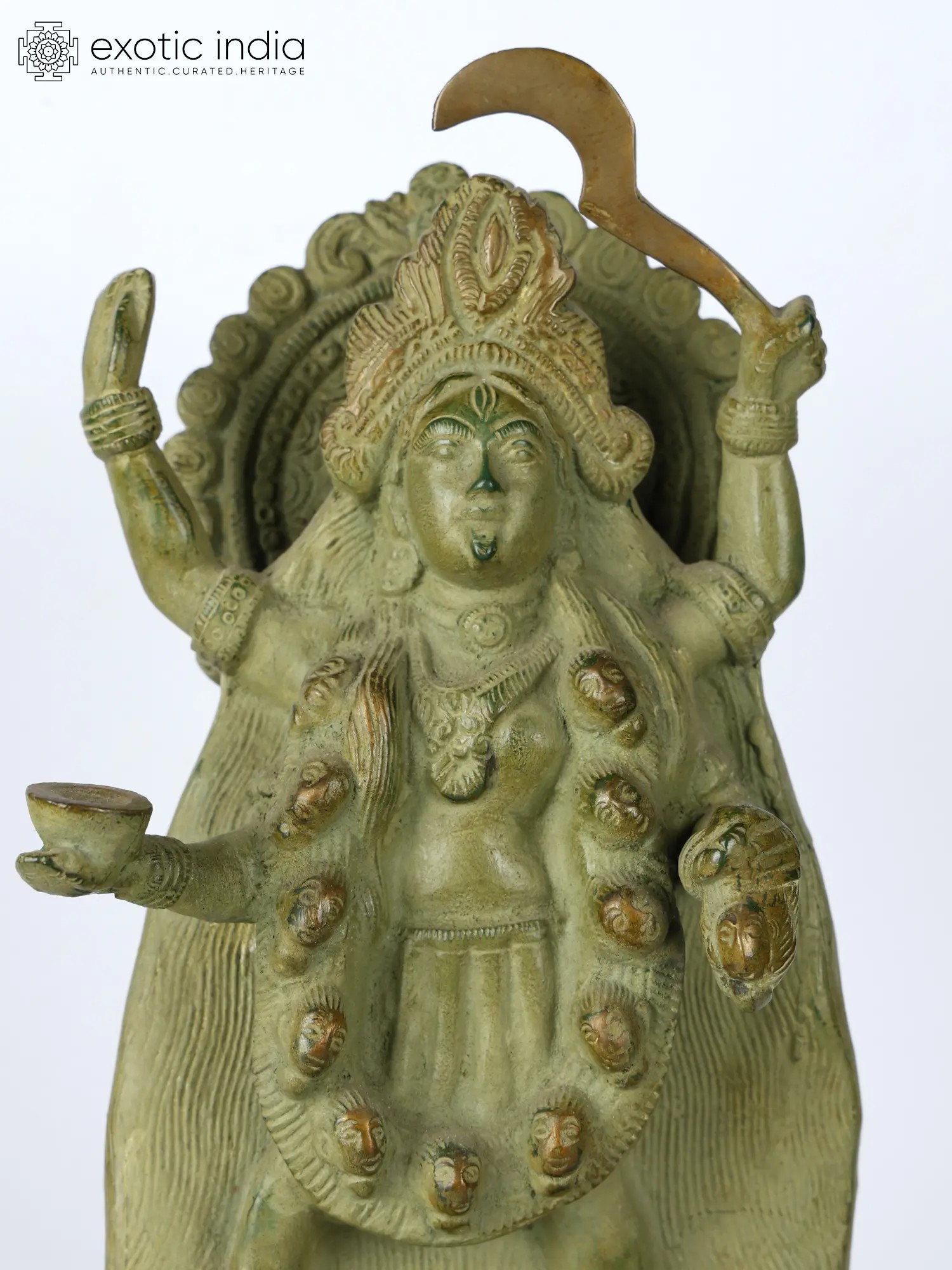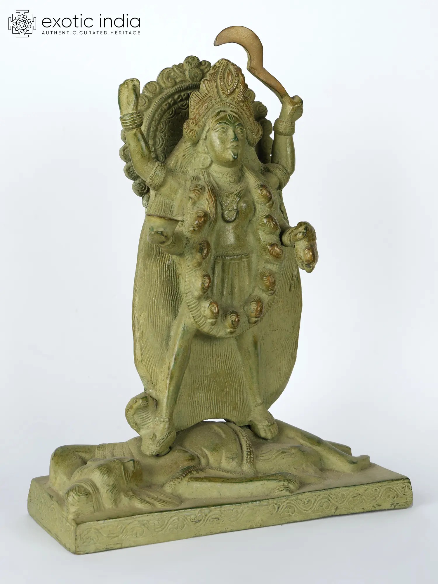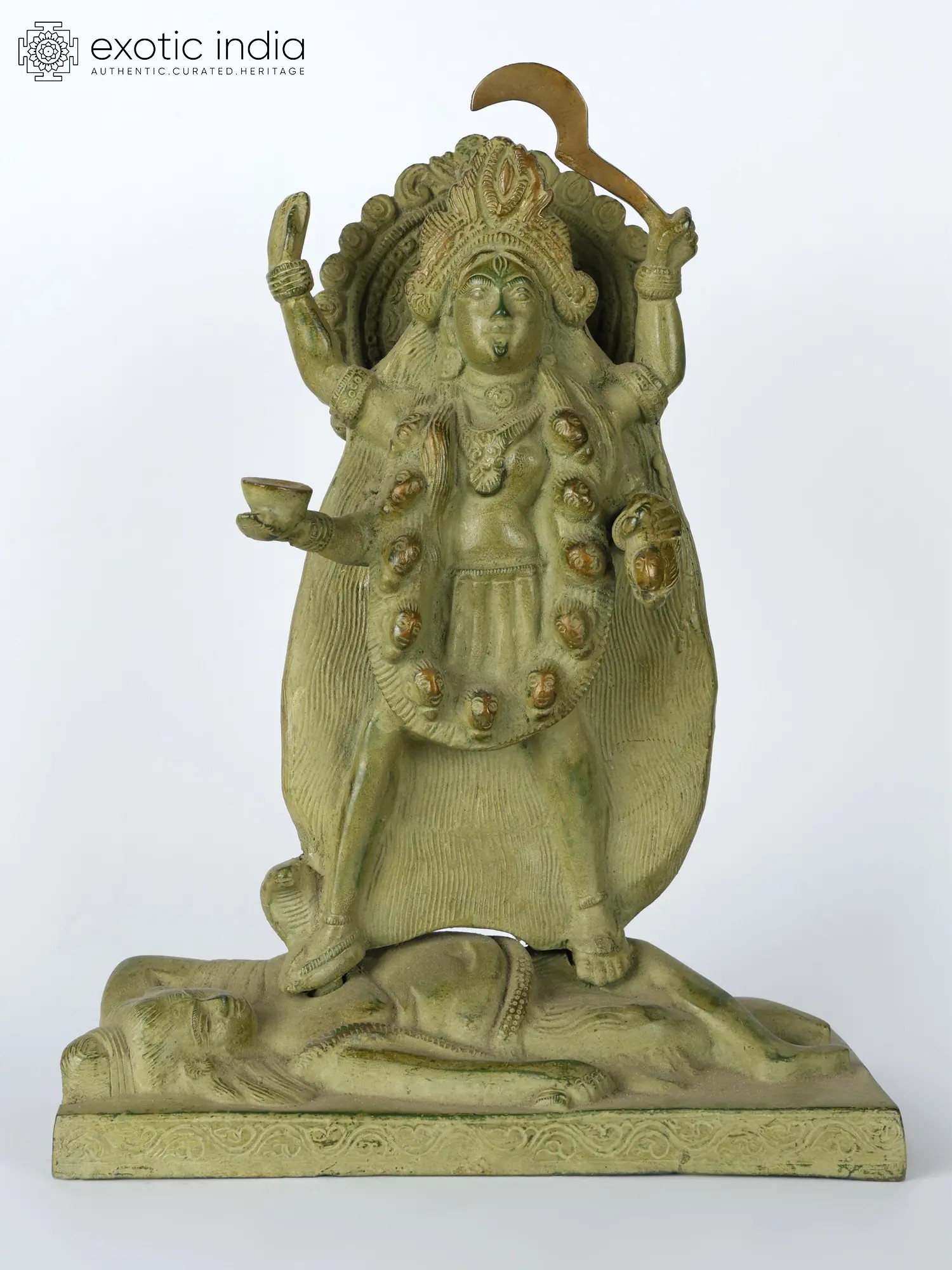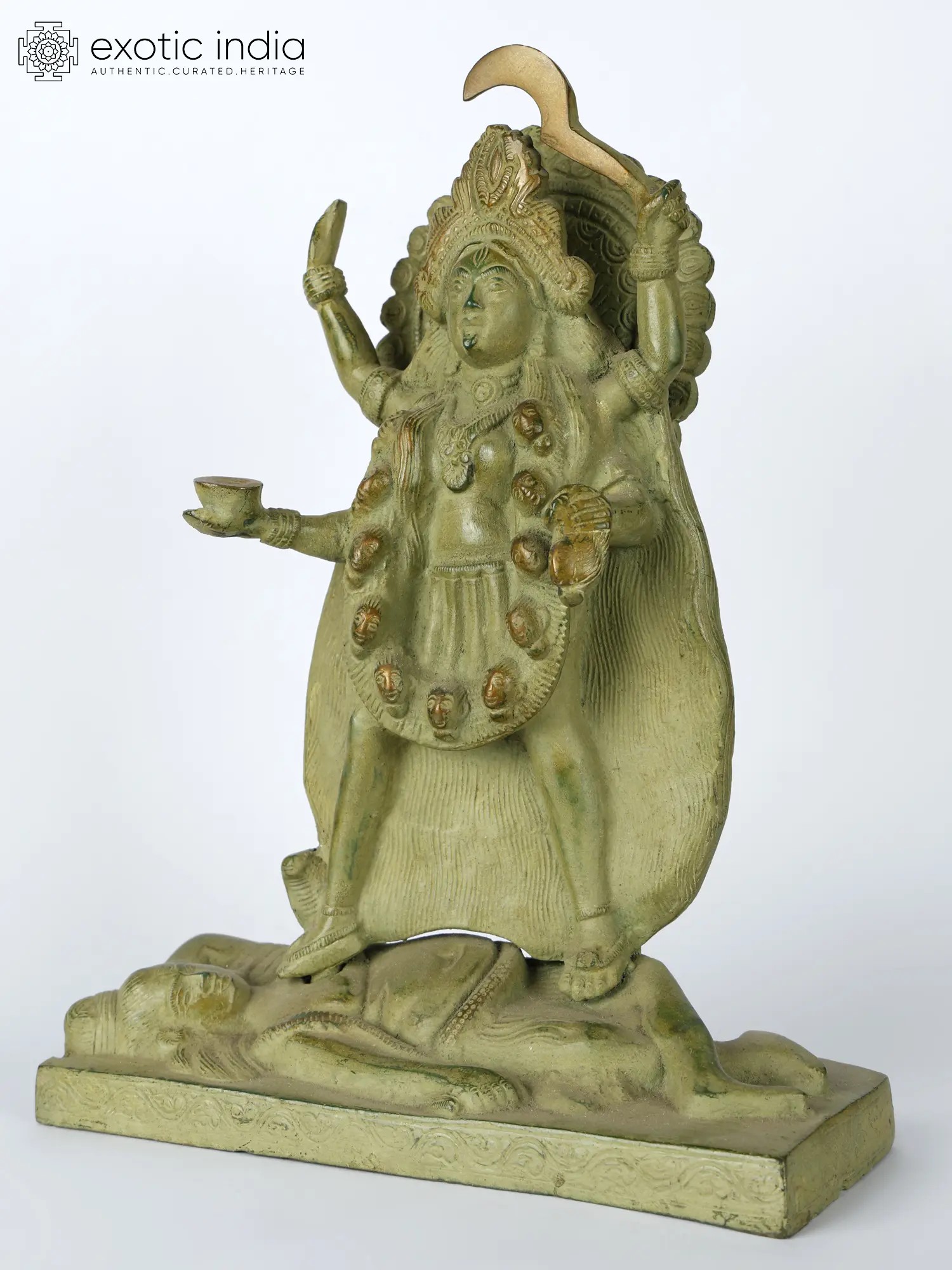 This brass-statue, the figure of a horrible looking four-armed goddess, a garland of severed human heads on the neck, girdle of dismembered human arms on the waist, trampling under her feet Lord Shiva lying upright, represents goddess Kali manifesting as Bhairavi, the consort of Bhairava – Lord Shiva in his ferocious manifestation.
