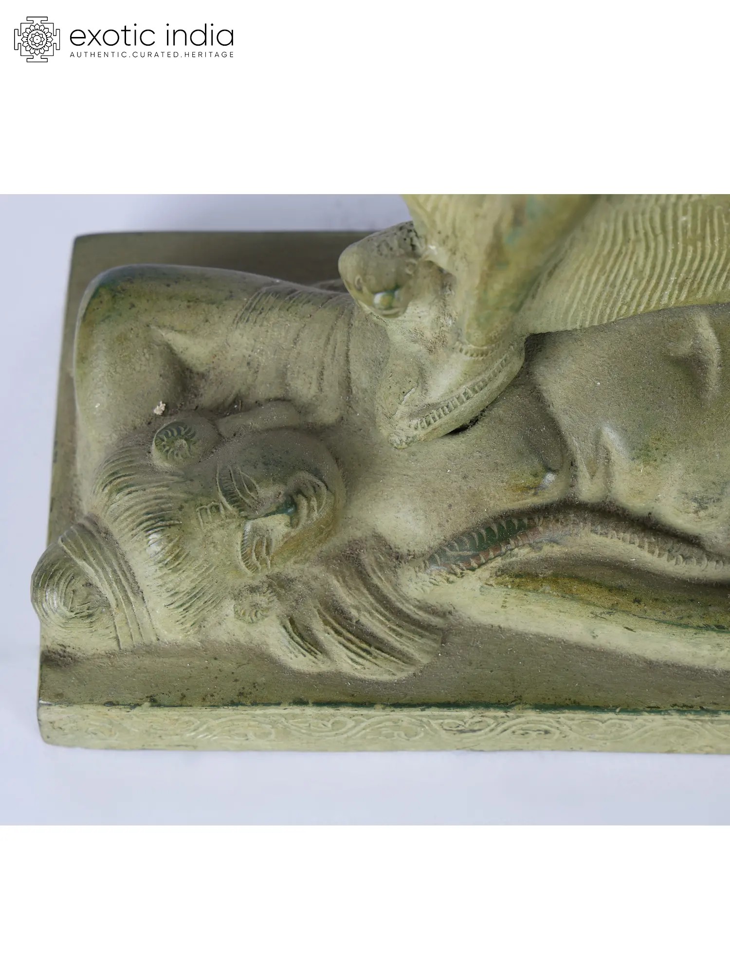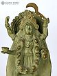 The four-armed goddess has been cast carrying in the upper left hand a suckle-like chopper, in the normal right, a bowl presumablt filled with fresh human blood, in the normal left, a decapitated demon head held by its hair, and the upper right, raised upwards gesticulating triumph or accomplishment of the objective. As Puranas perceived, the goddess’s anatomy has been conceived with a robust build, legs tall and strong, arms with well pronounced muscles, breasts large but not loosely hung as in Kali’s figures, and belly, a bit protruded.